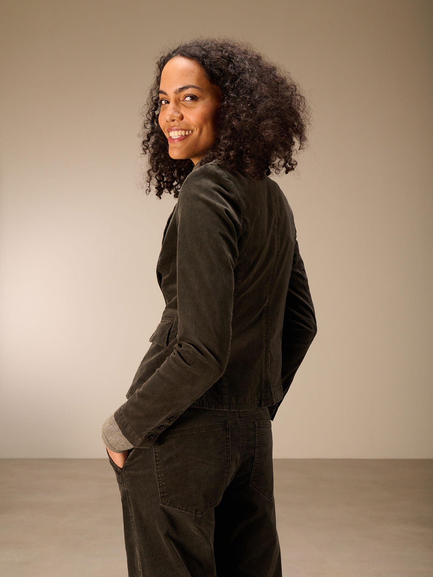 Giacca in velluto a coste monopetto dalla vestibilità aderente con collo a revers e tasche applicate. La giacca corta elasticizzata non è foderata e non ha spacco posteriore. Mix di materiali con cotone biologico da coltivazione certificata e poliestere riciclato in una qualità babycord elasticizzata molto confortevole.