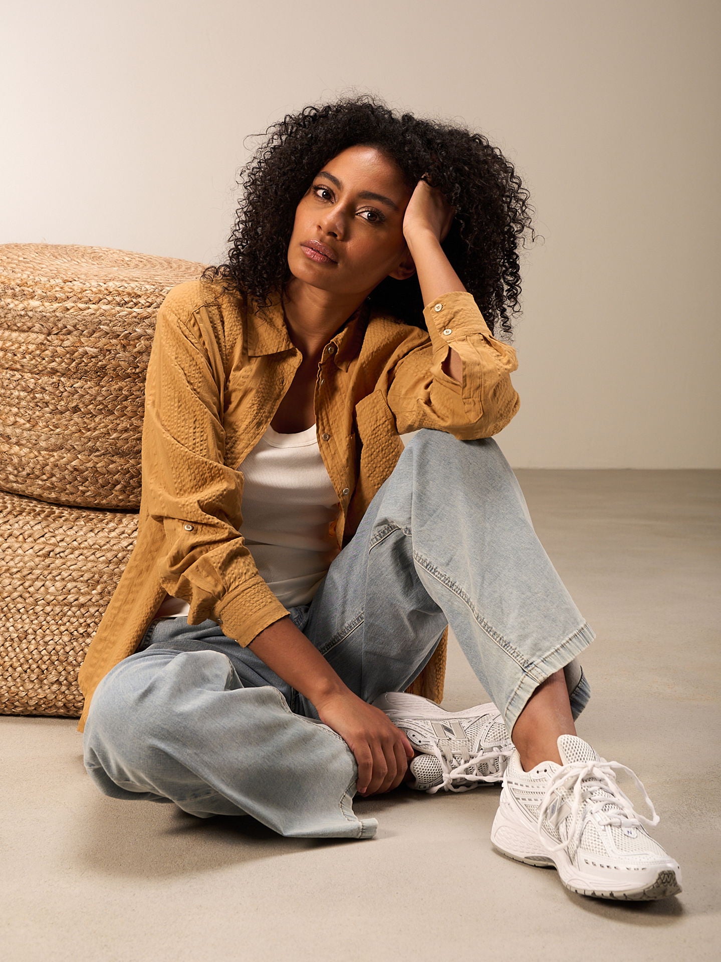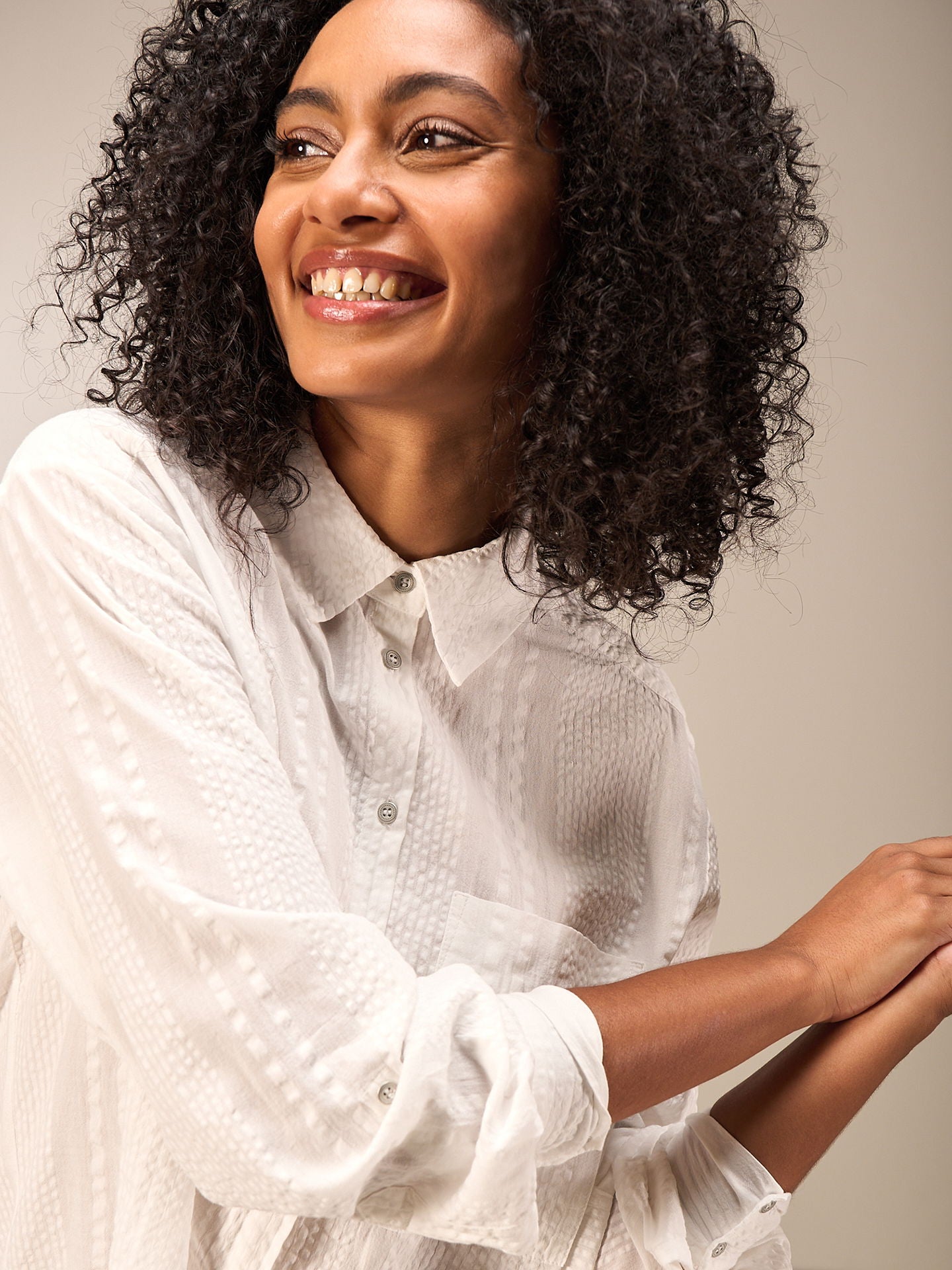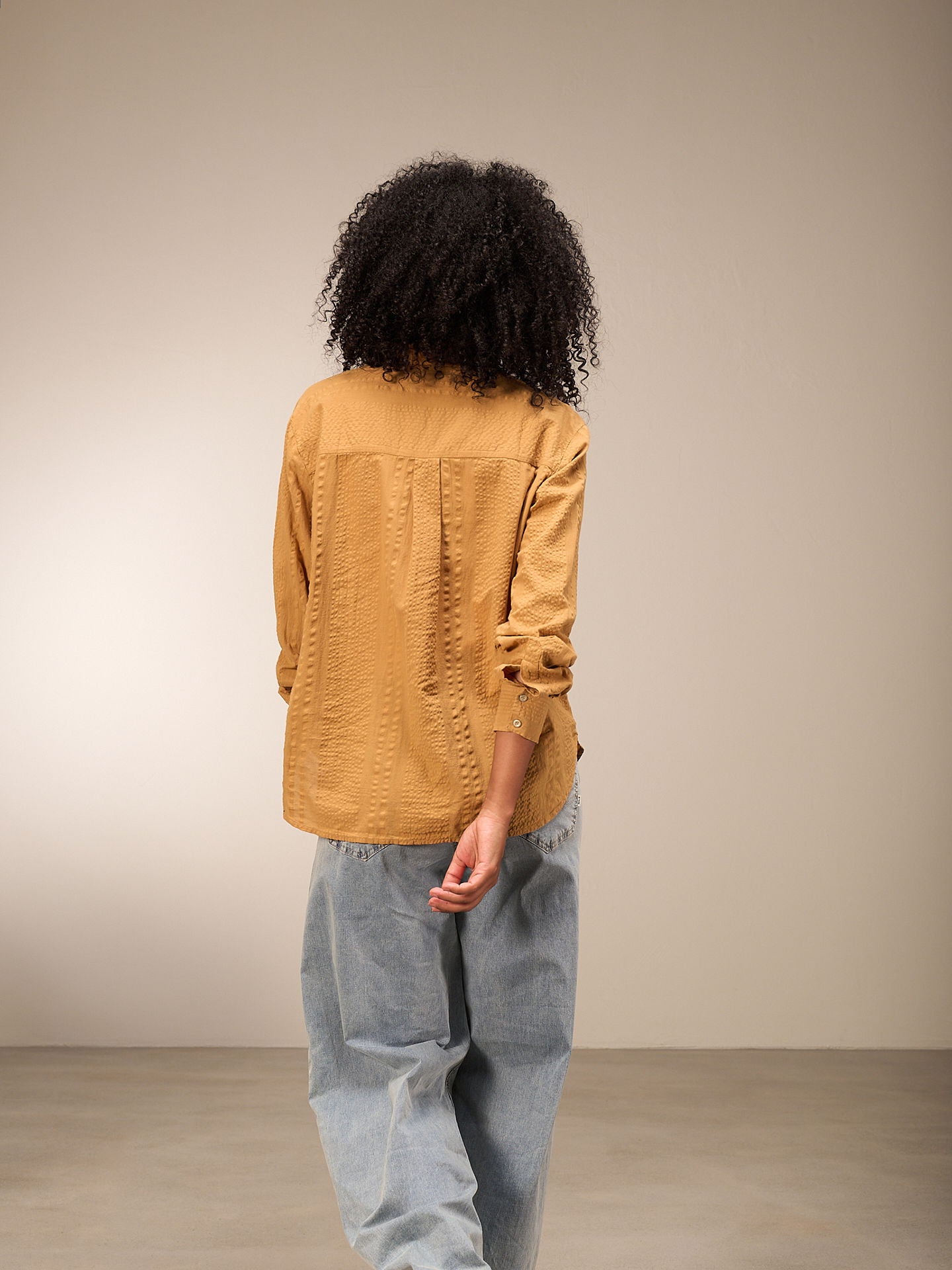 Elegante camicia in tessuto seersucker 100% cotone biologico con taschino applicato sul petto. Le maniche lunghe sono dotate di spacchi e bottoni sui polsini e possono essere risvoltate grazie a una linguetta.