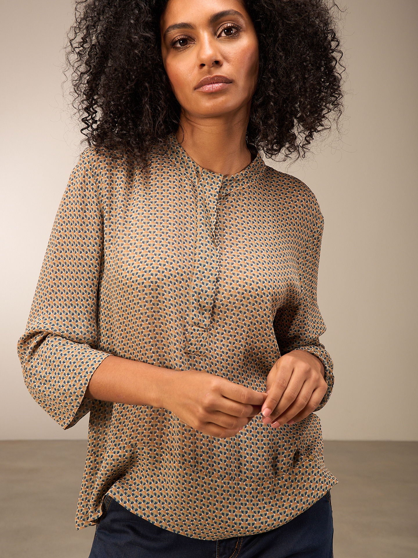 Camicetta corta dal taglio squadrato con collo alto, abbottonatura corta nascosta e maniche dritte a 3/4. La stampa all-over disegnata a mano completa il look della camicetta. Realizzata in viscosa ecologica al 100%, ottenuta da silvicoltura sostenibile.