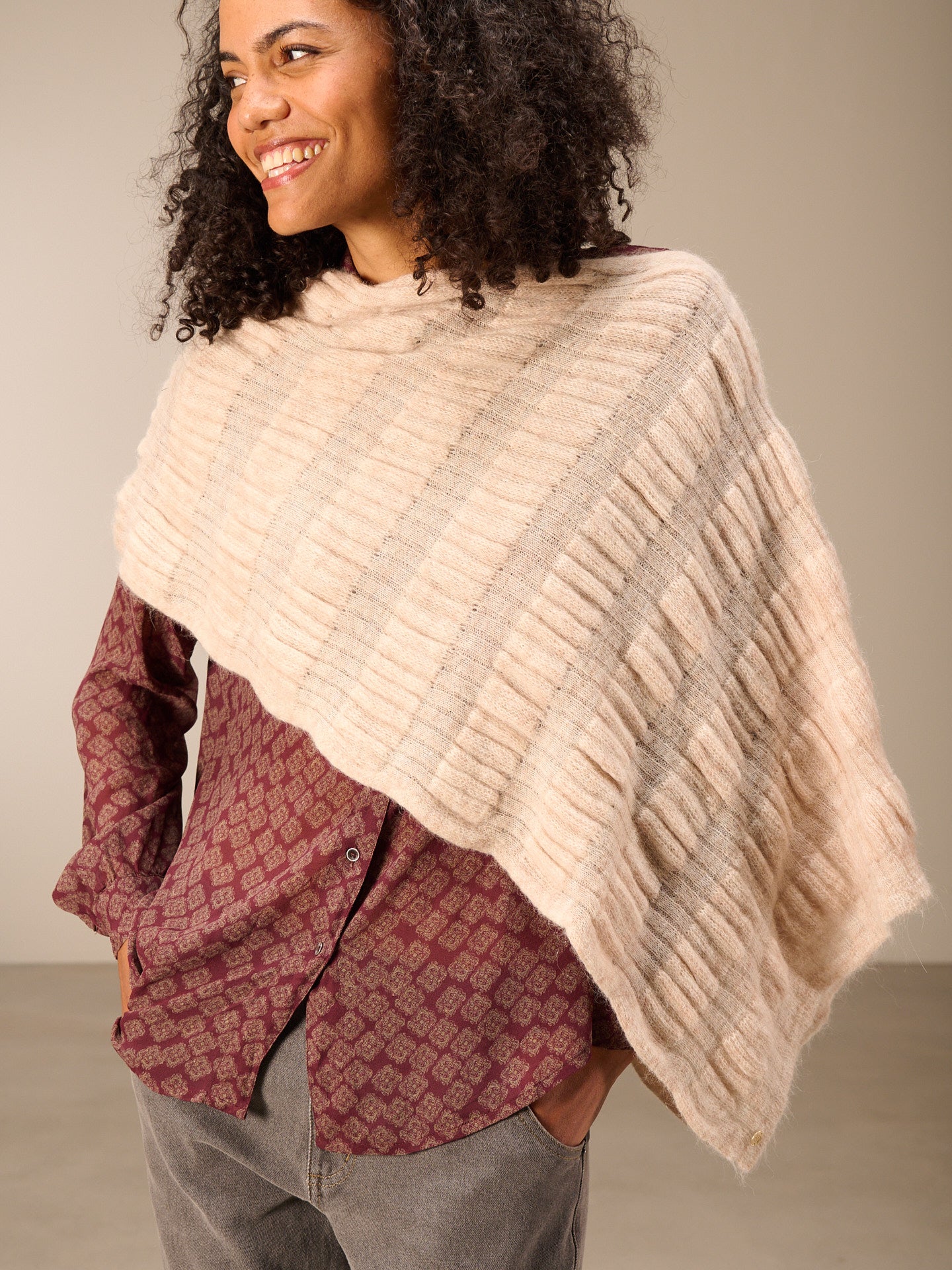 Capo in maglia multifunzionale, che può essere indossato come sciarpa o mantella. Per le diverse varianti di stile è dotato di una chiusura con 3 bottoni in madreperla. Il motivo a bolle in maglia realizzata con filato peloso e screziato rende questo capo un elegante elemento di richiamo visivo.