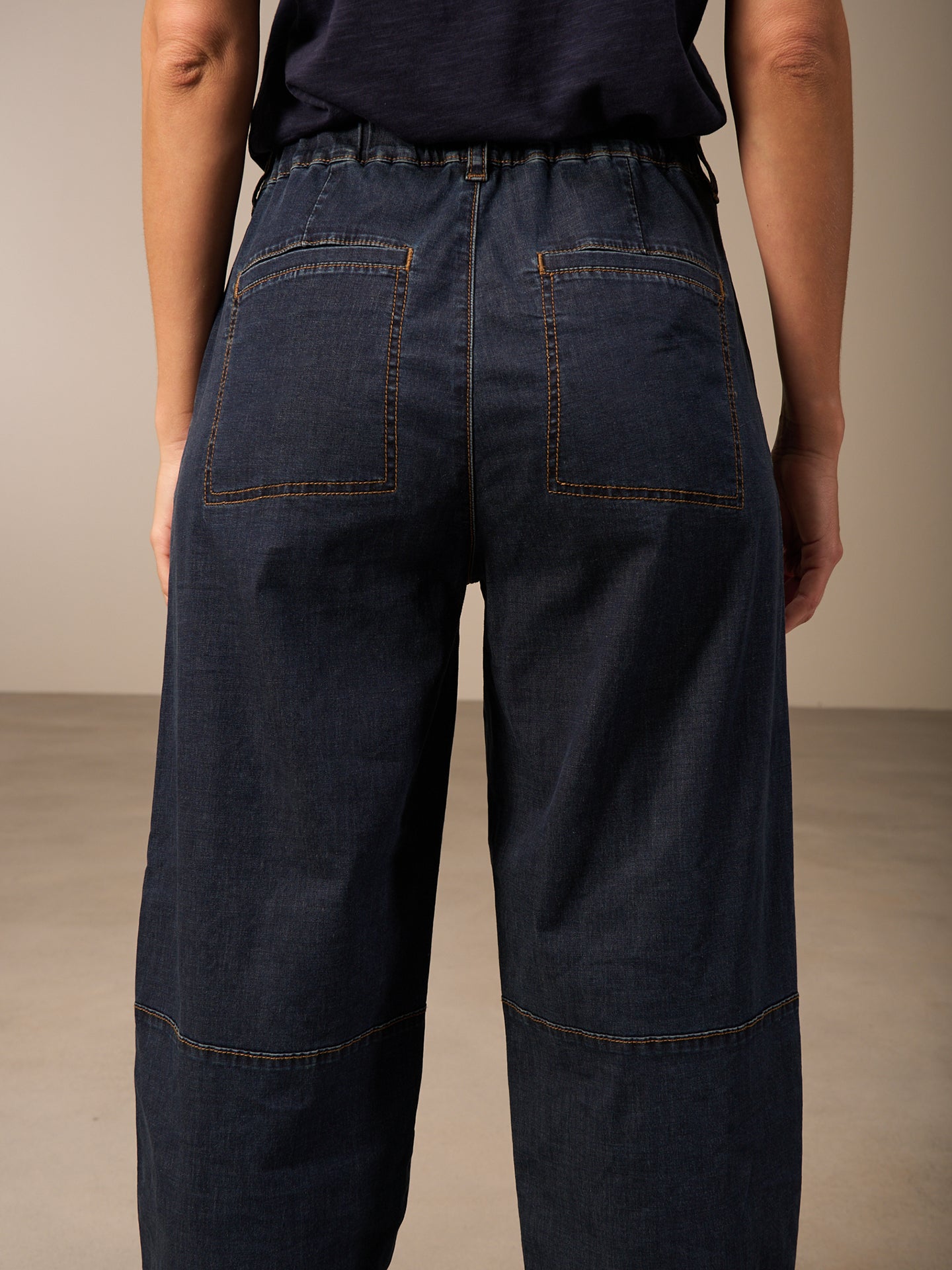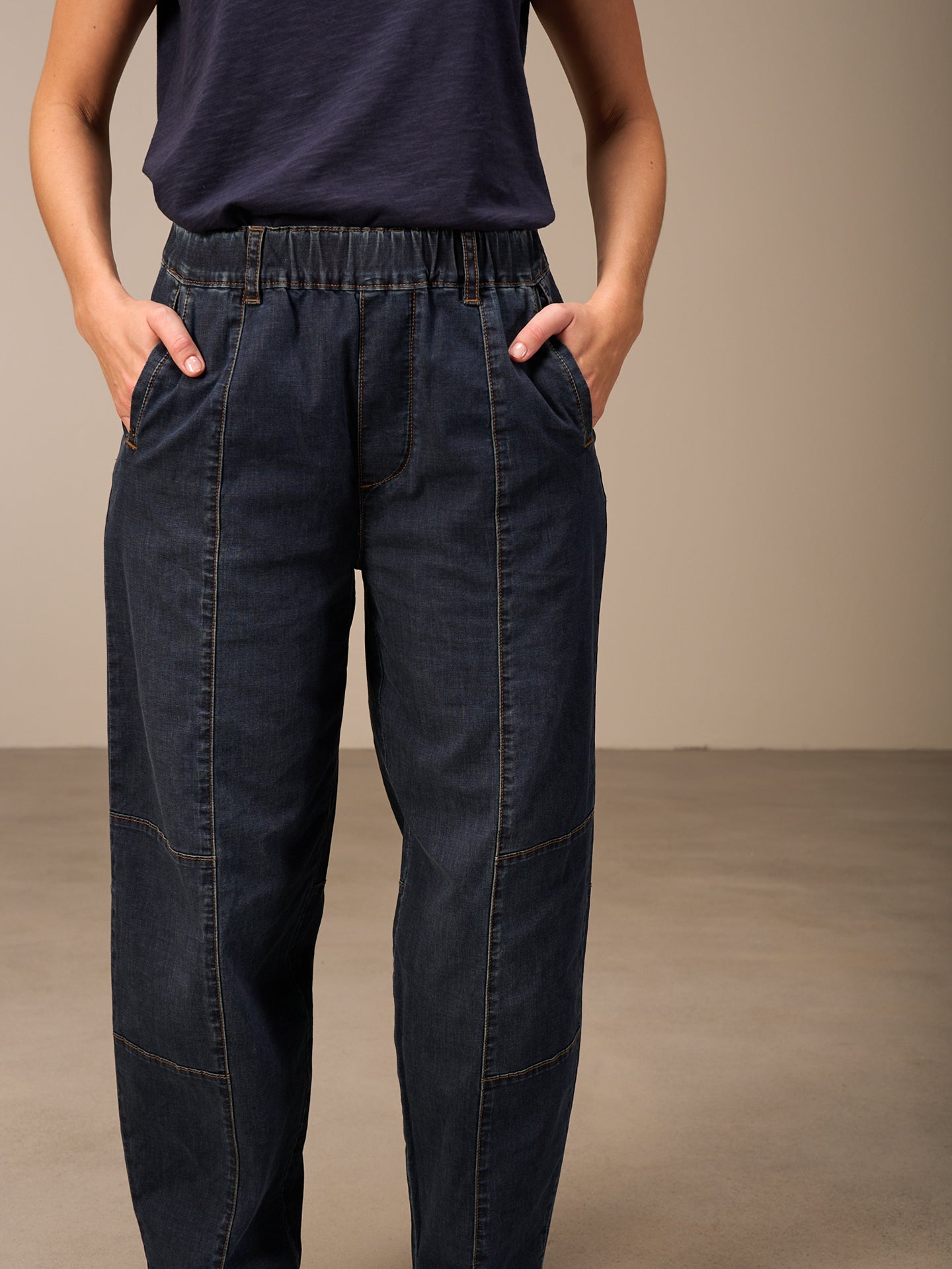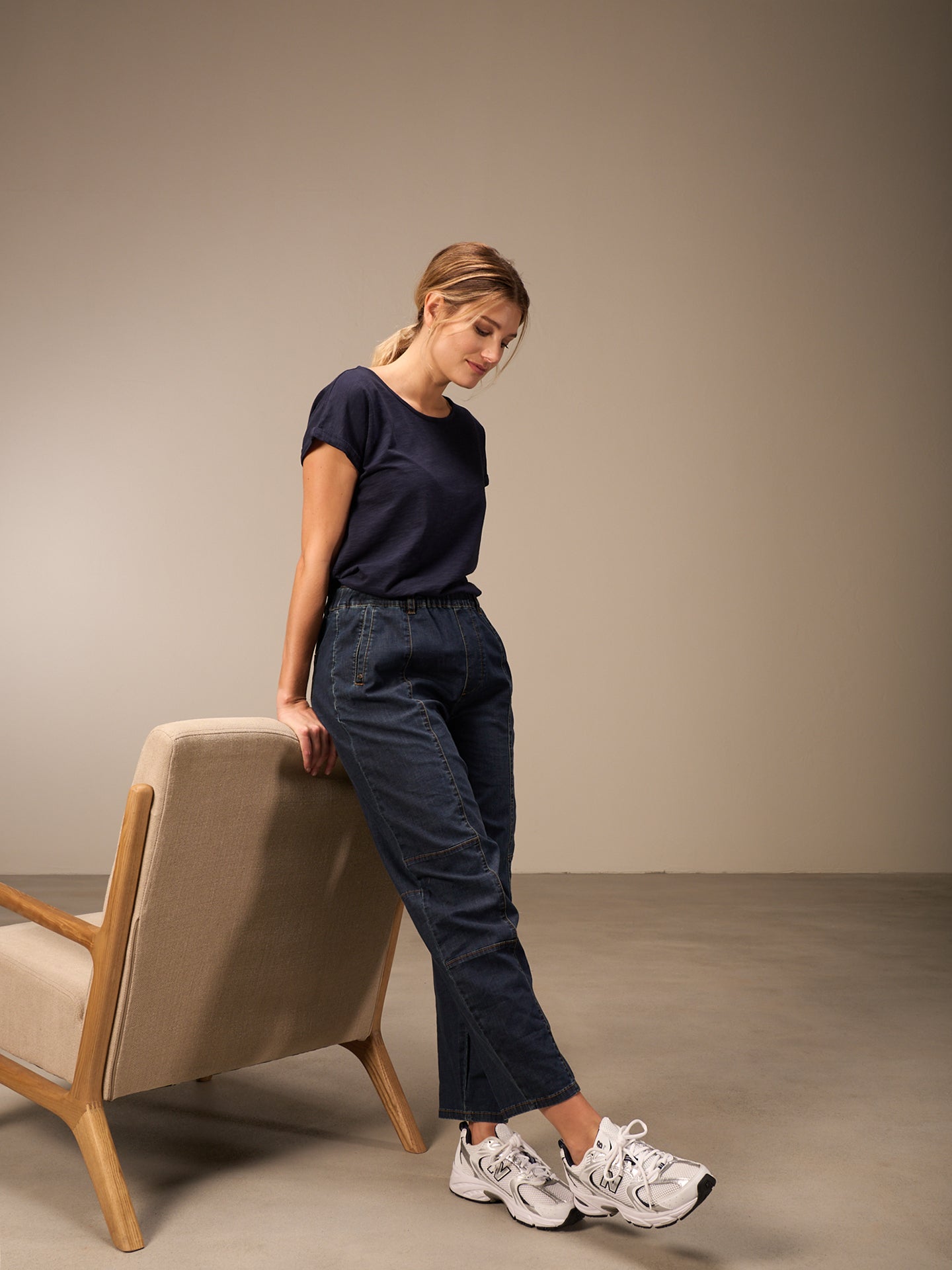 Pantaloni in denim dal taglio sportivo. La vita elasticizzata con coulisse, le tasche con impunture e le numerose cuciture dettagliate uniscono comfort e stile casual.