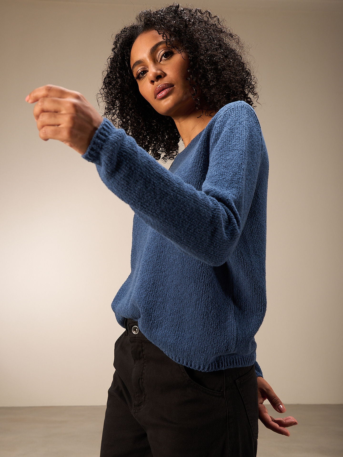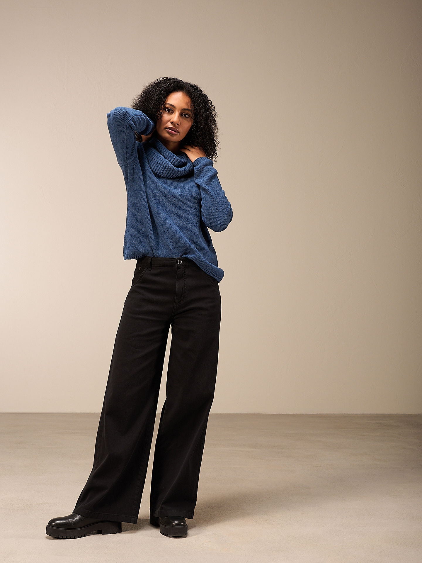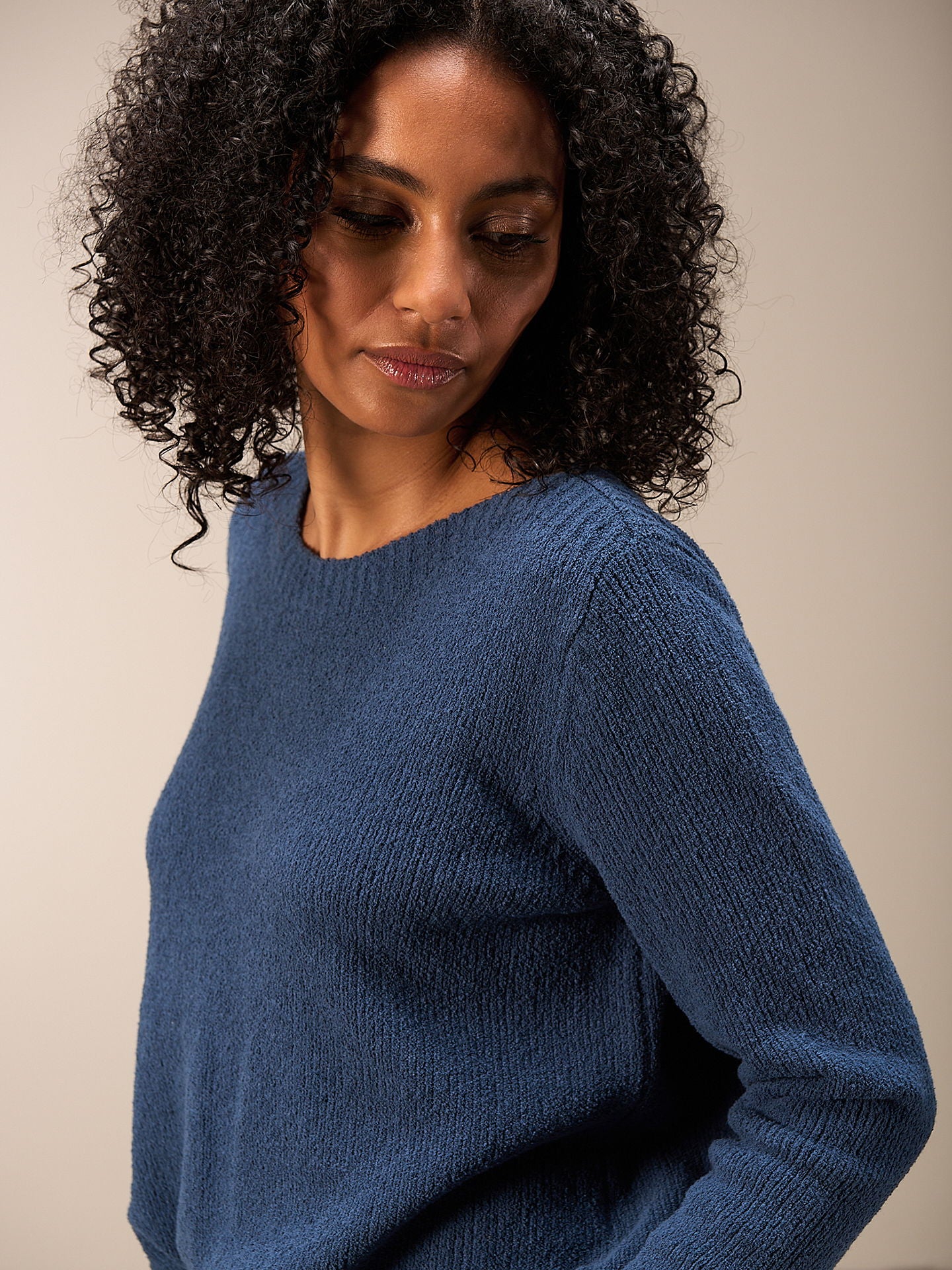 Maglione dalla vestibilità morbida in speciale filato bouclé soffice con elegante scollo a barchetta e spalle scese. Il bordo a costine su maniche e orlo completa il maglione.