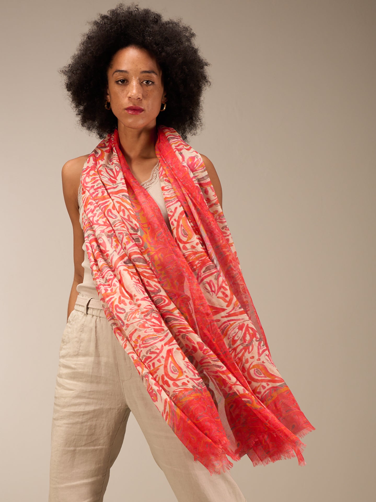 Das großzügige Format in der Grösse 120x200cm eignet sich perfekt für ein vielseitiges Styling. Lässig um Hals und Schultern drapiert wertet dieser Schal jedes Outfit im Nu auf und wird so zu einem Lieblingsaccessoire. Der Schal ist mit handgezeichneten Prints vollflächig bedruckt und hat kürzere Kanten mit Fransen. 100% Modal TENCELTM-zertifiziert.