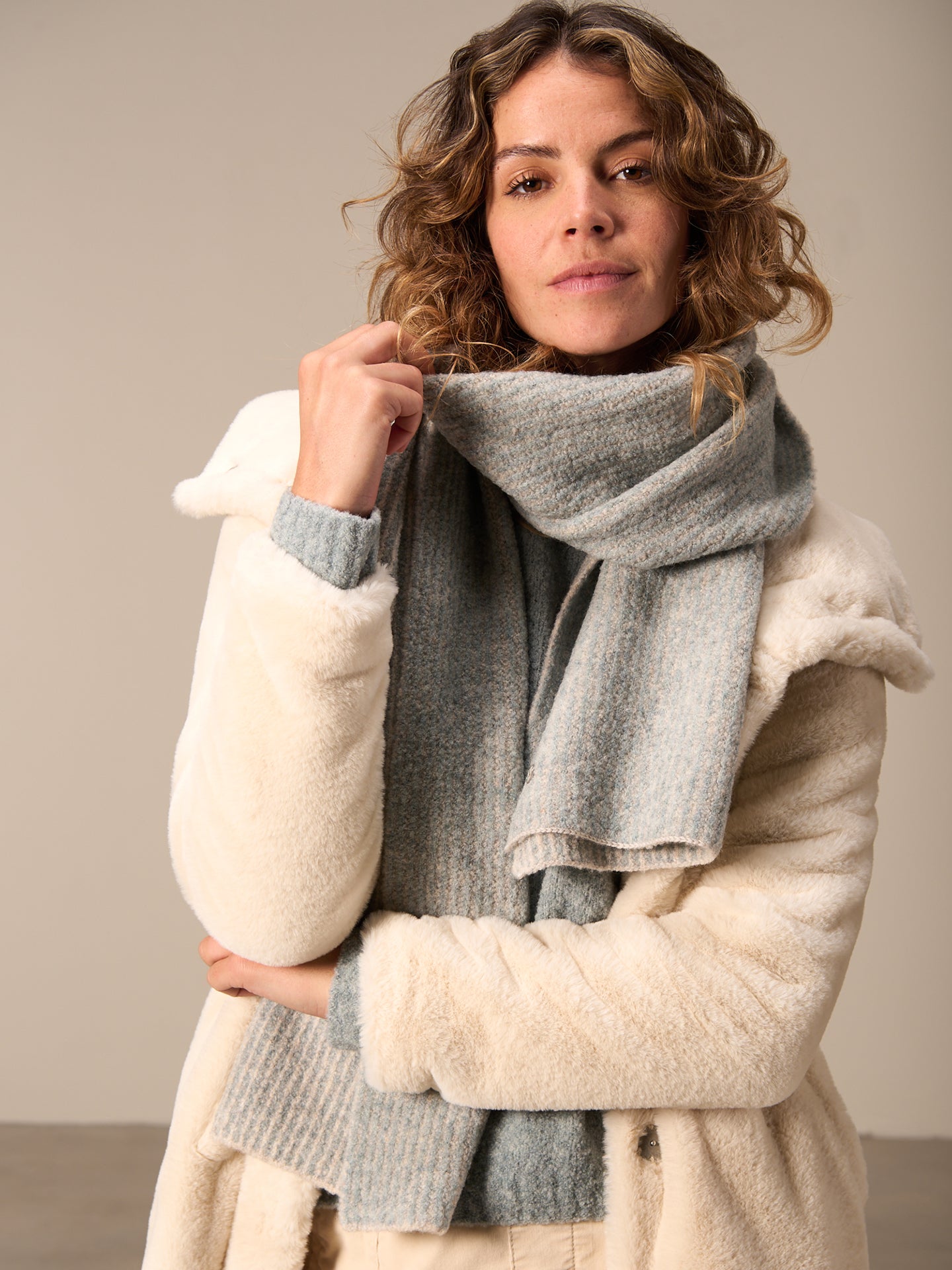Morbida sciarpa lavorata a maglia con un motivo di vernice bicolore, il colore ‘almond’ è lavorato a maglia liscia.