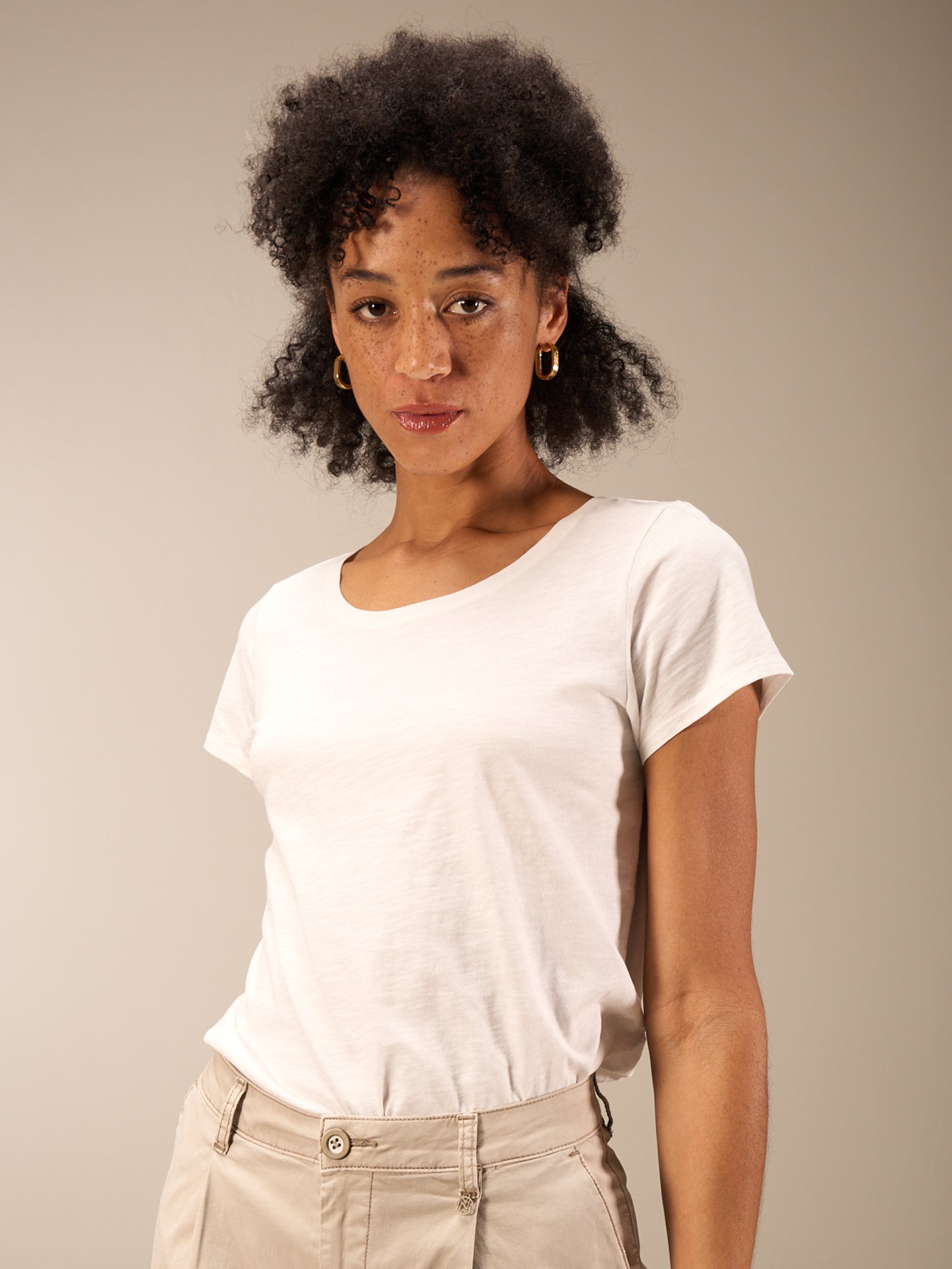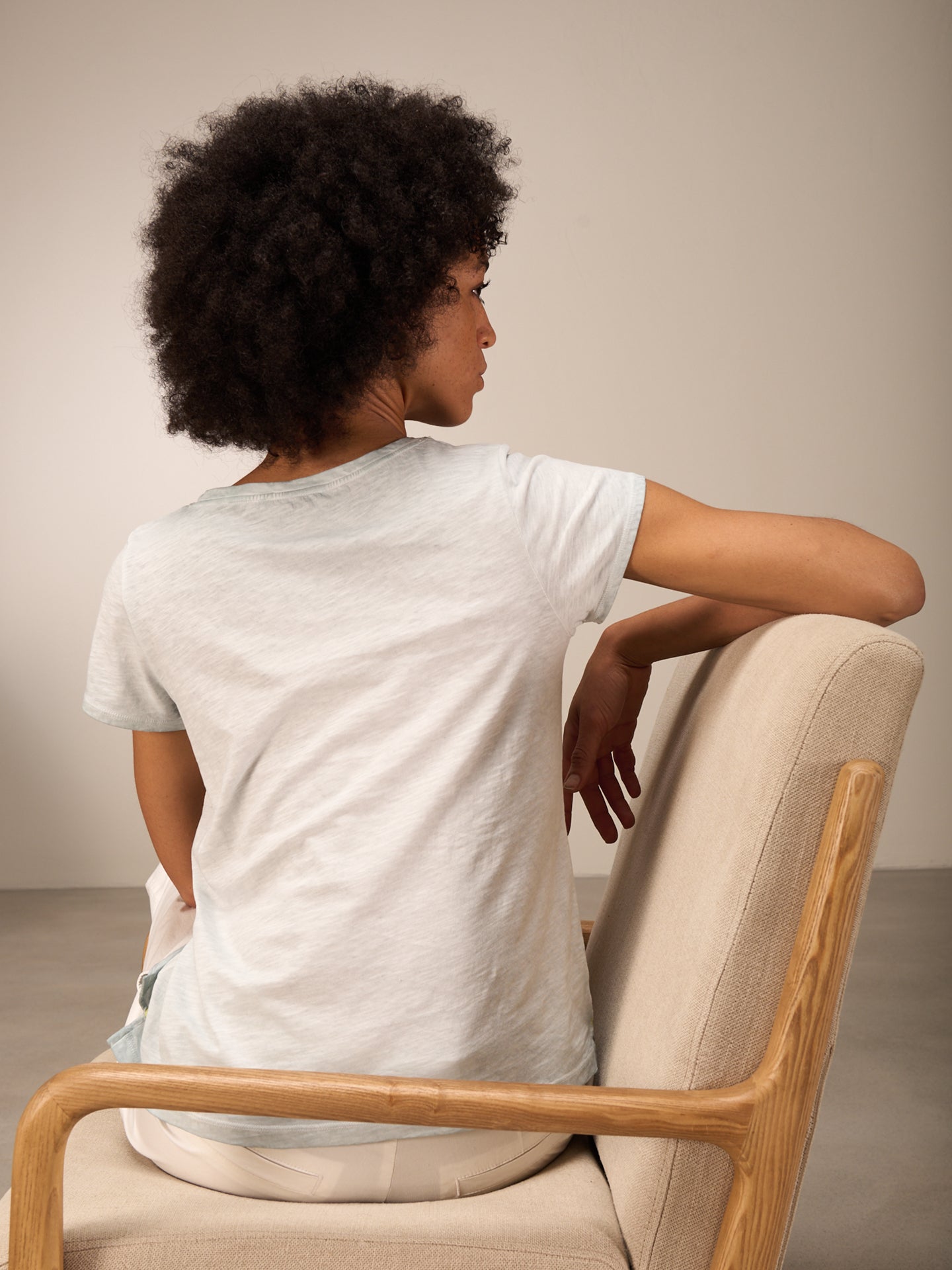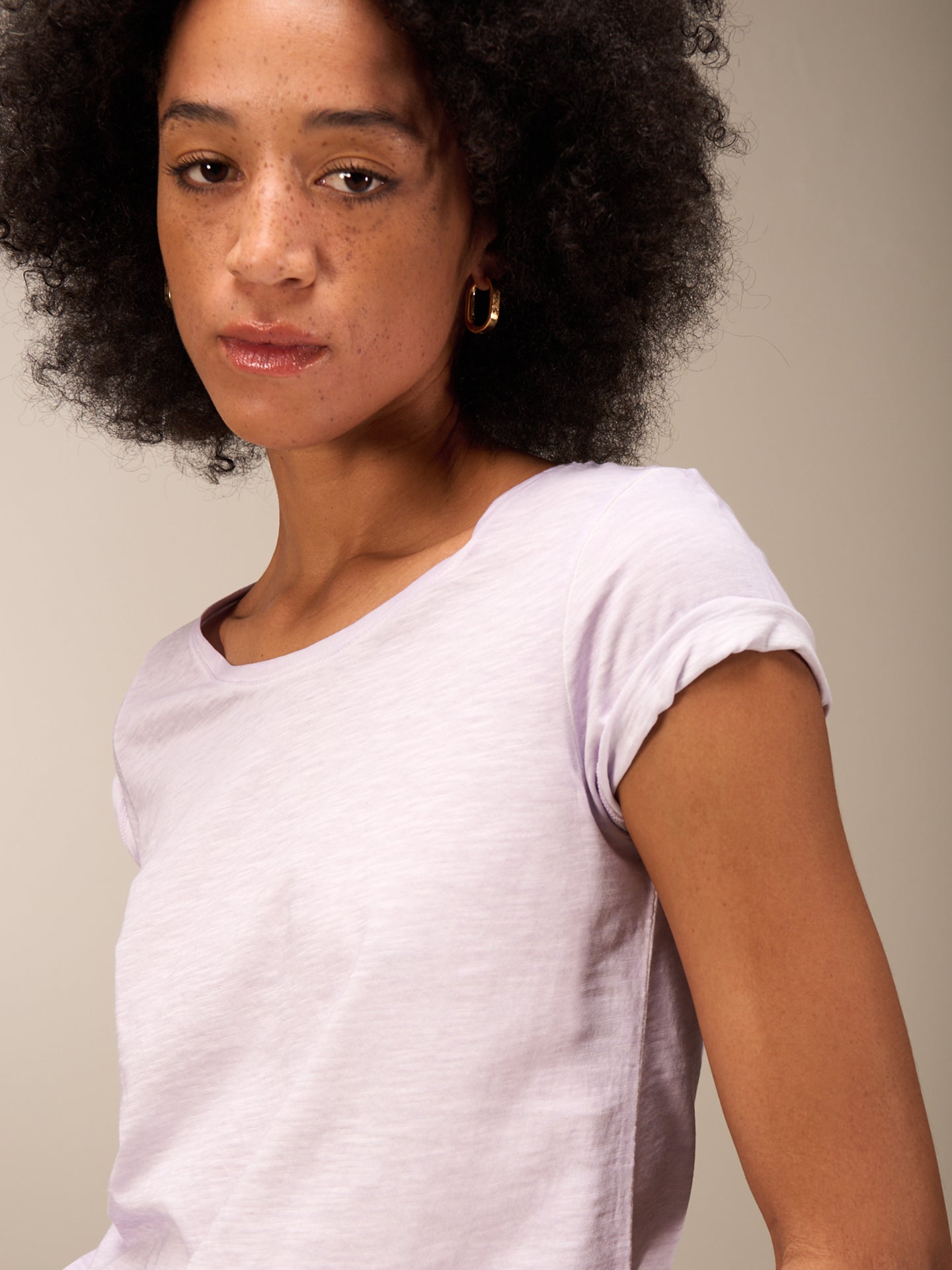Maglietta dal taglio morbido con spacchi laterali e scollo rotondo in jersey fiammato. 100% cotone biologico certificato GOTS. Maglietta dal taglio morbido con spacchi laterali e scollo rotondo in jersey fiammato. 100% cotone biologico certificato GOTS. Grazie a uno speciale processo di tintura interna, la maglietta assume un bellissimo effetto slavato. Le irregolarità nel colore rendono ogni capo unico. L'effetto slavato è accentuato.