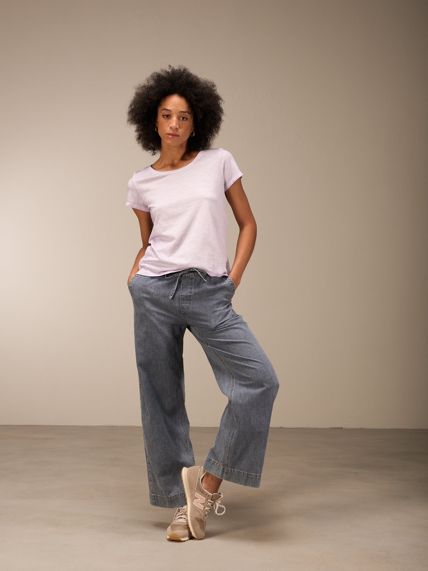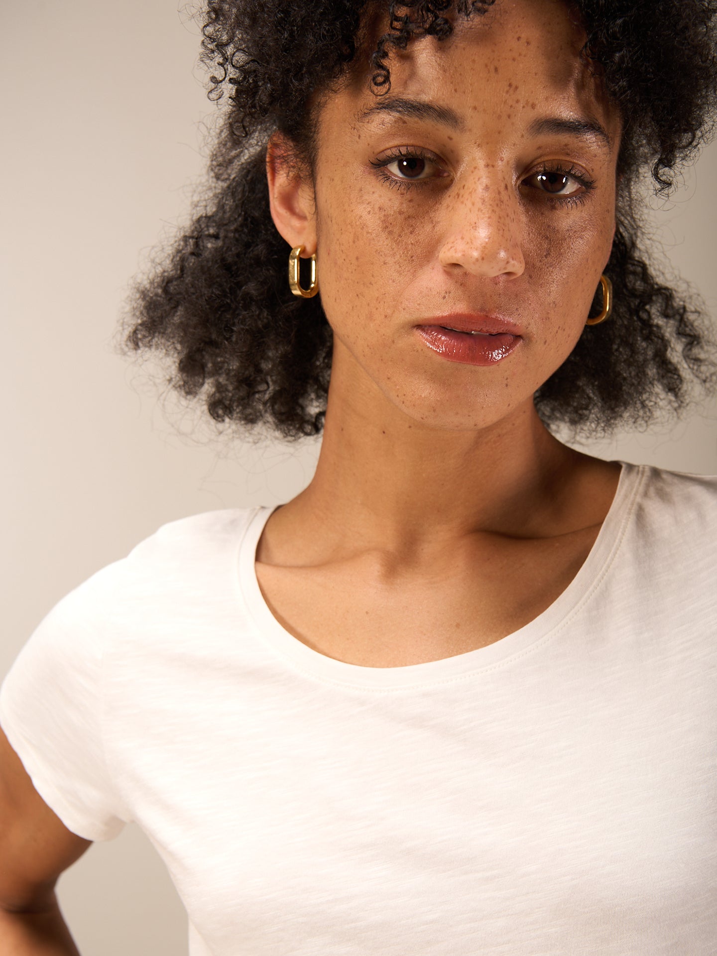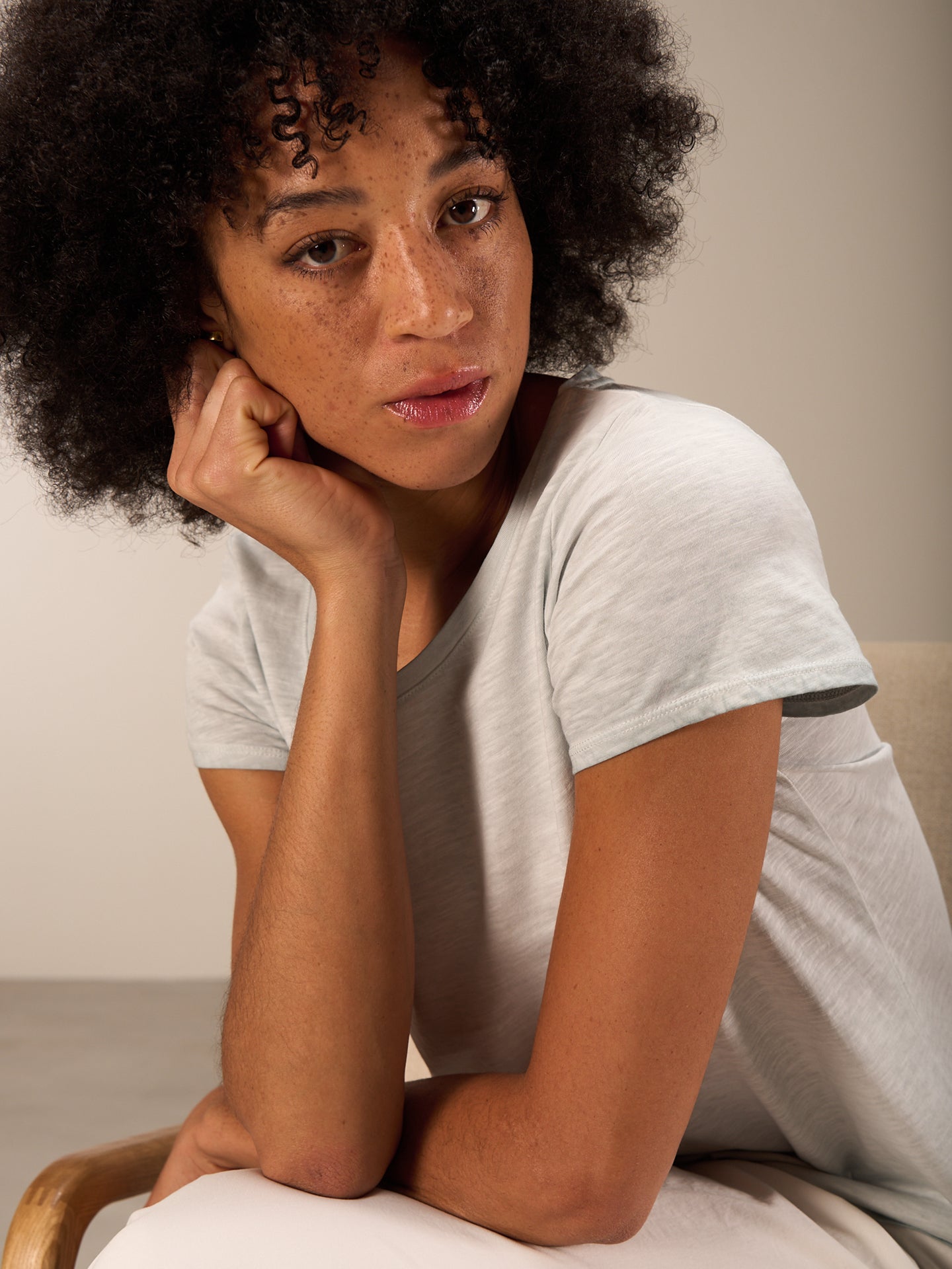 Maglietta dal taglio morbido con spacchi laterali e scollo rotondo in jersey fiammato. 100% cotone biologico certificato GOTS. Maglietta dal taglio morbido con spacchi laterali e scollo rotondo in jersey fiammato. 100% cotone biologico certificato GOTS. Grazie a uno speciale processo di tintura interna, la maglietta assume un bellissimo effetto slavato. Le irregolarità nel colore rendono ogni capo unico. L'effetto slavato è accentuato.