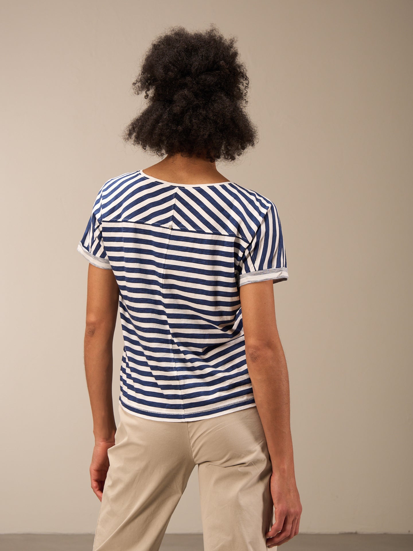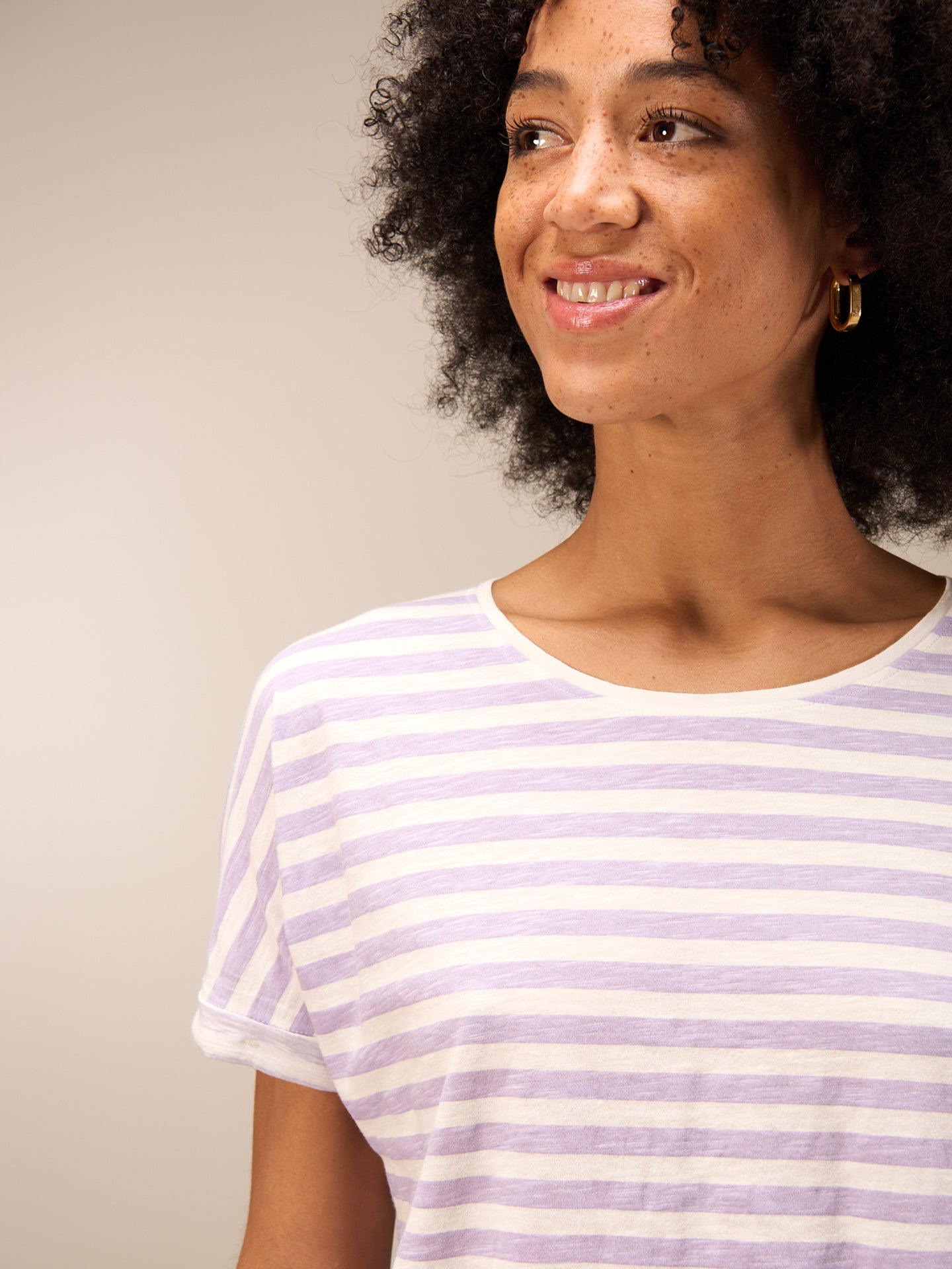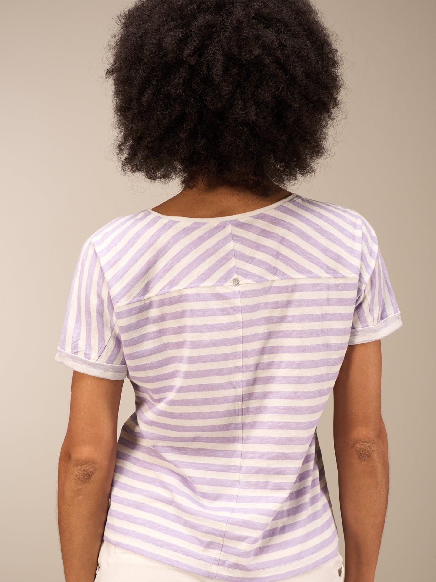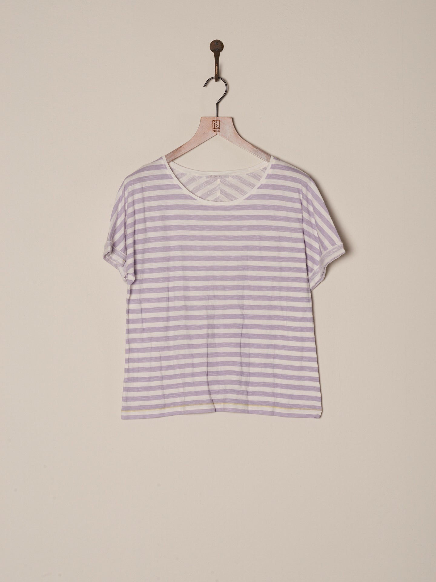 Maglia girocollo dal taglio morbido con maniche corte e arrotolate. La raffinata cucitura sulle spalle sul retro, il jersey fiammato e la stampa a righe su tutta la superficie rendono questo modello un capo irrinunciabile per l'estate.
