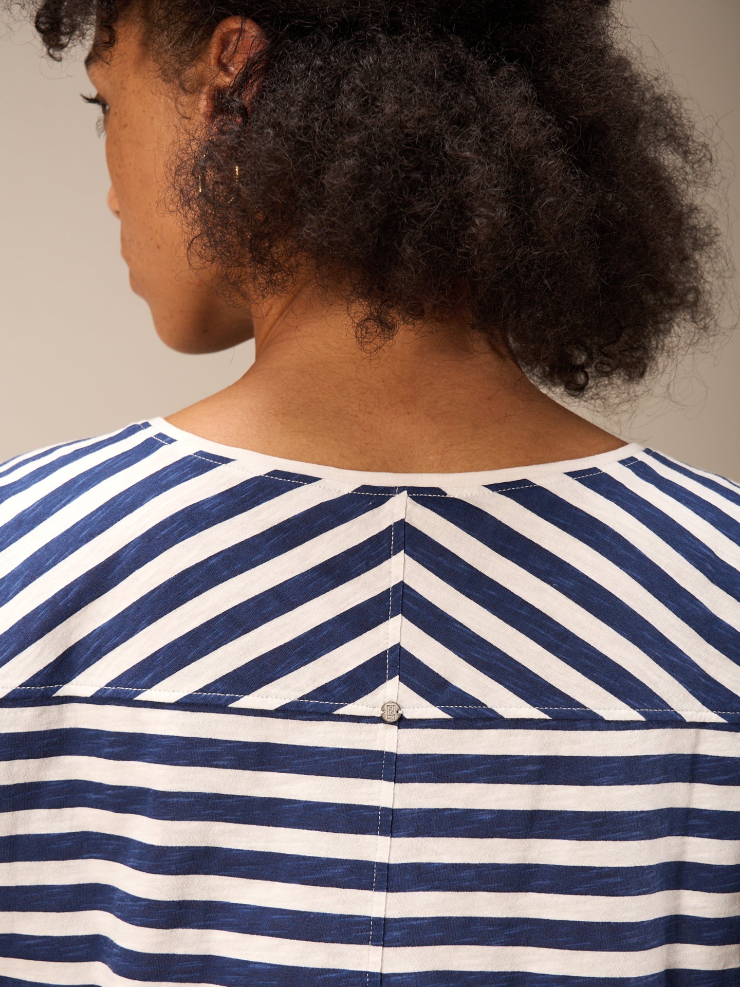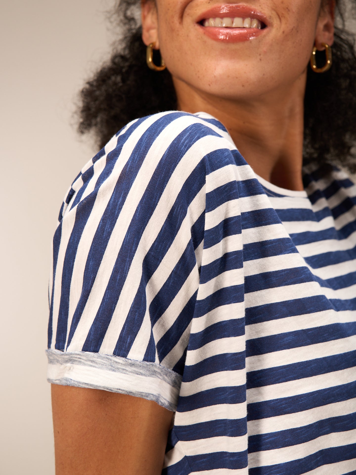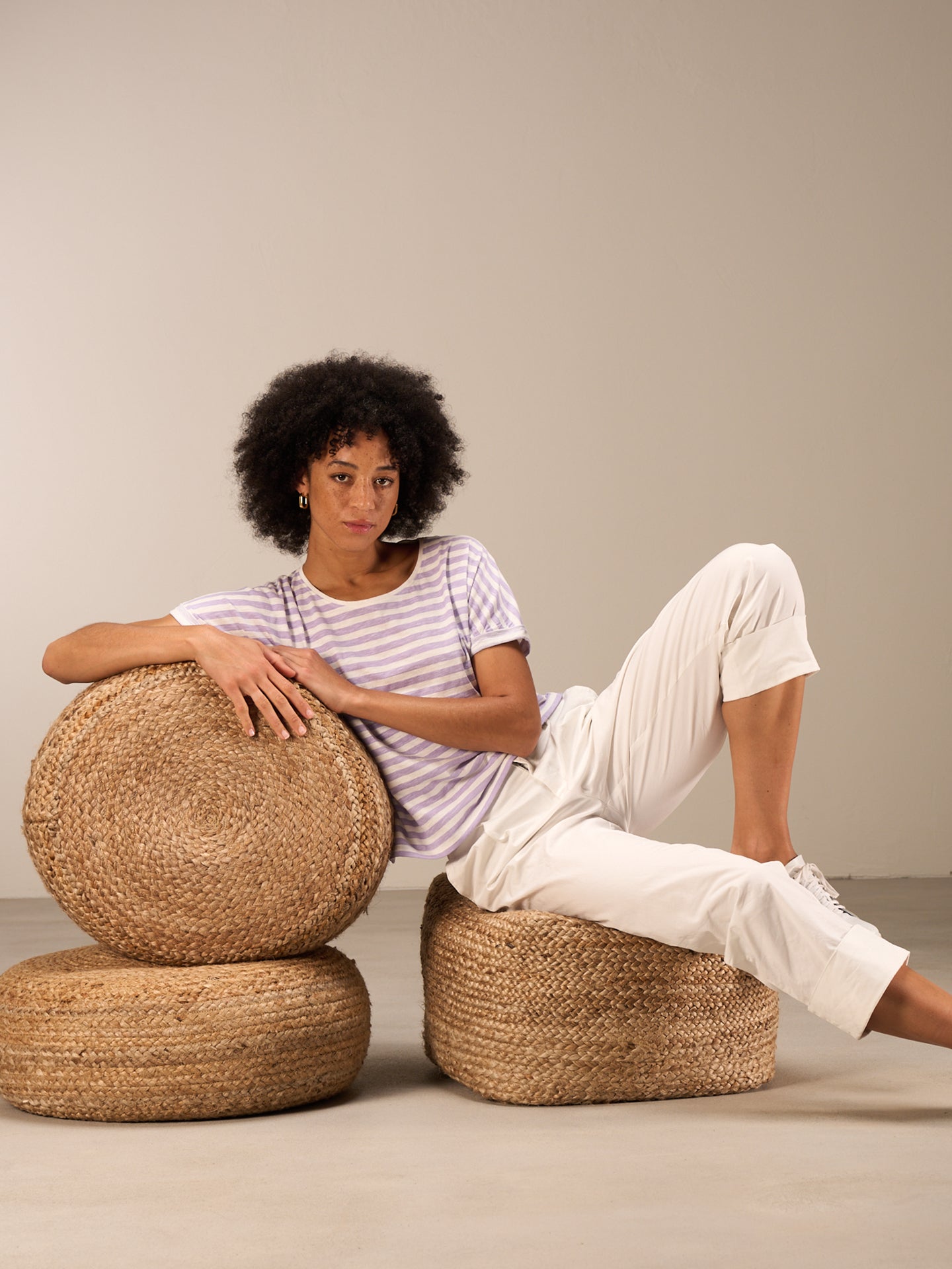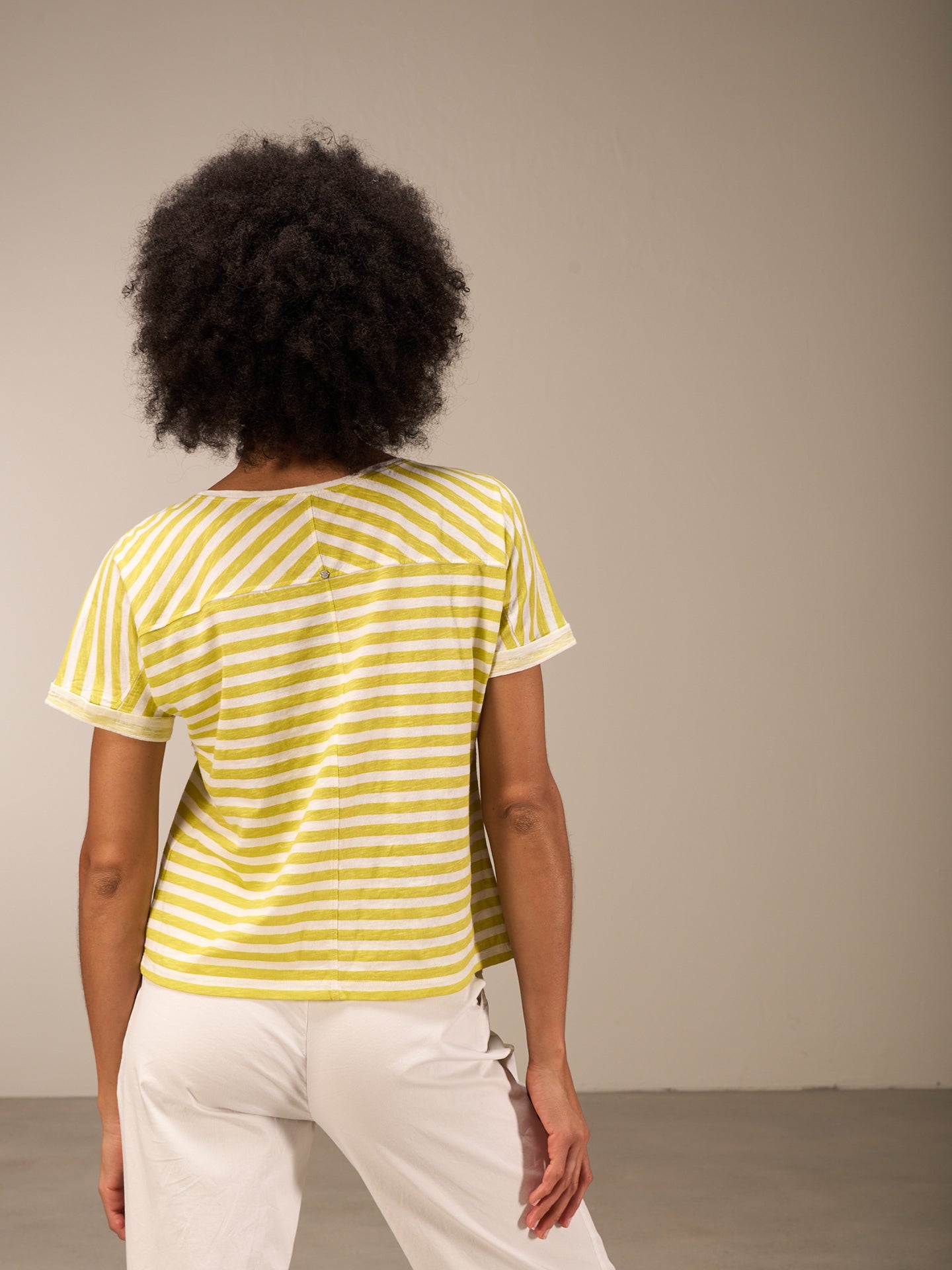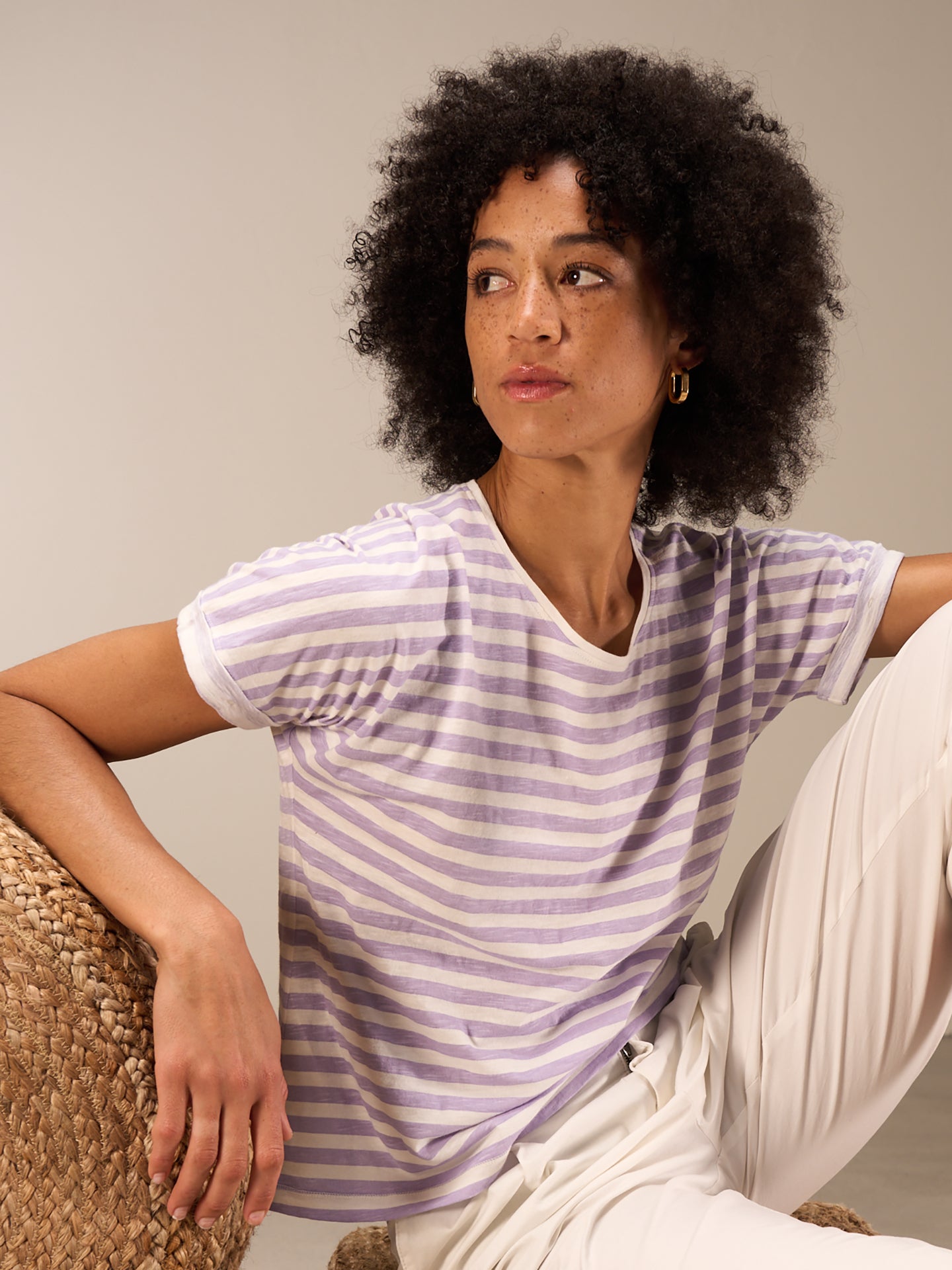 Maglia girocollo dal taglio morbido con maniche corte e arrotolate. La raffinata cucitura sulle spalle sul retro, il jersey fiammato e la stampa a righe su tutta la superficie rendono questo modello un capo irrinunciabile per l'estate.