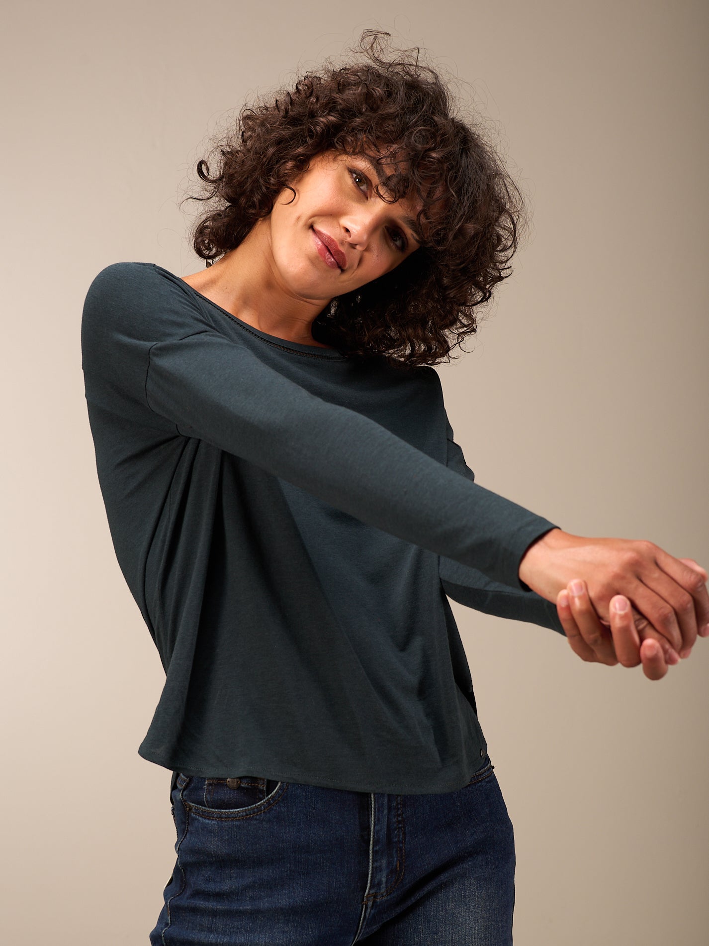 Camicia a maniche lunghe dal taglio ampio con scollo rotondo, spalle scese e maniche lunghe e strette. La parte posteriore leggermente più lunga, che riceve l'ampiezza necessaria dalla piega, crea un look casual.