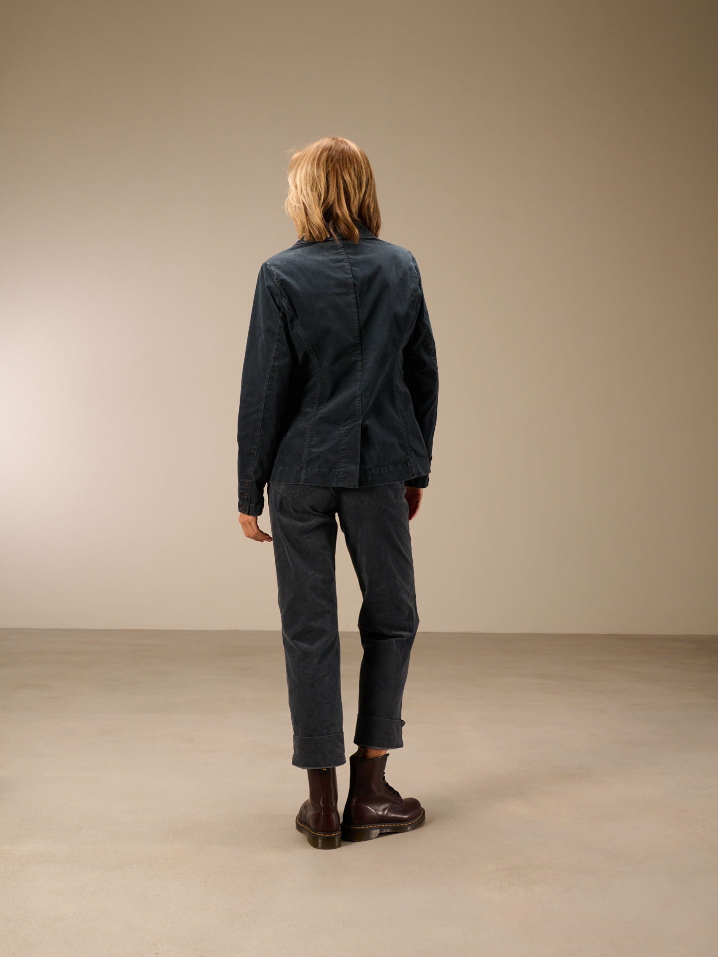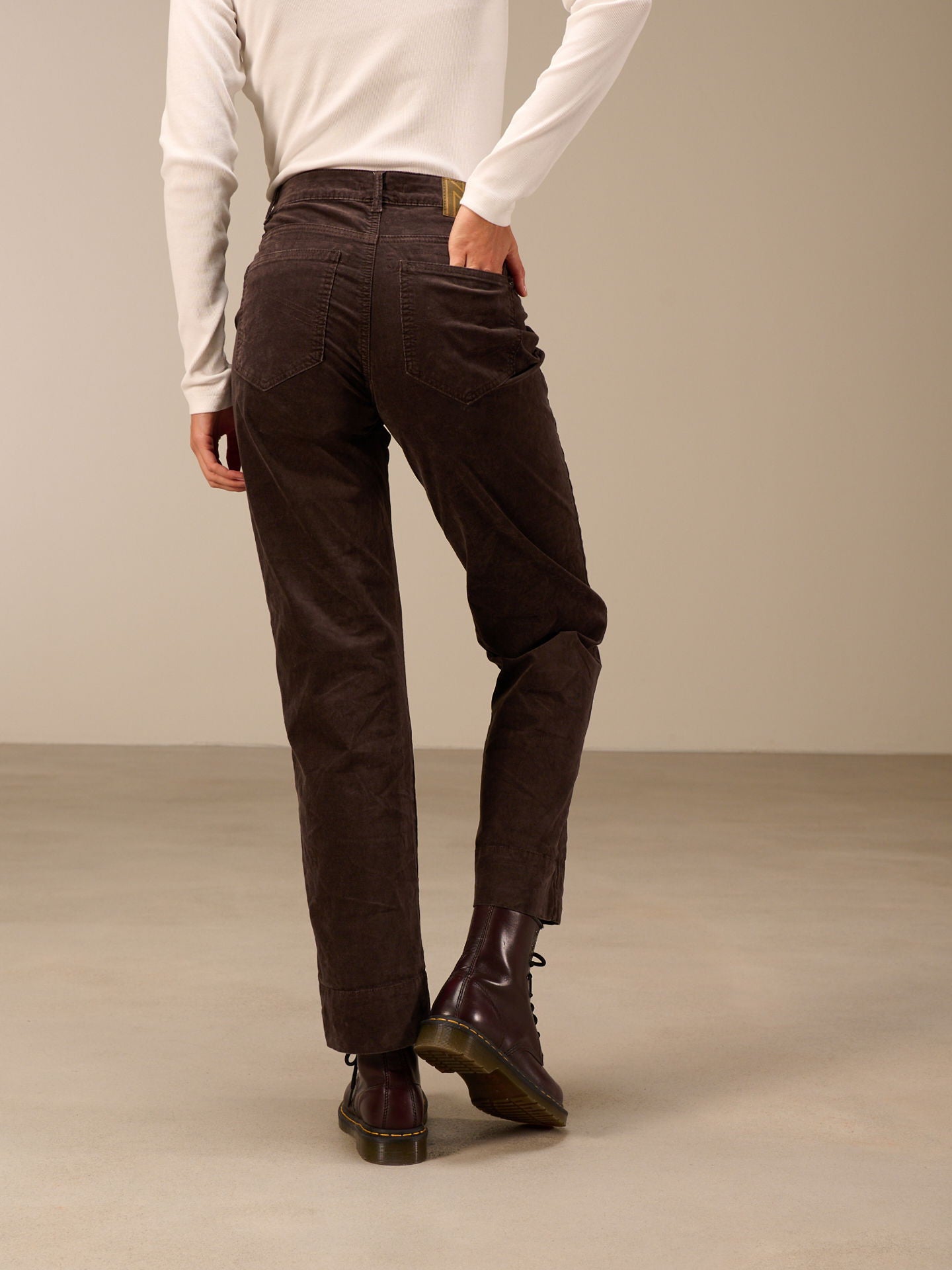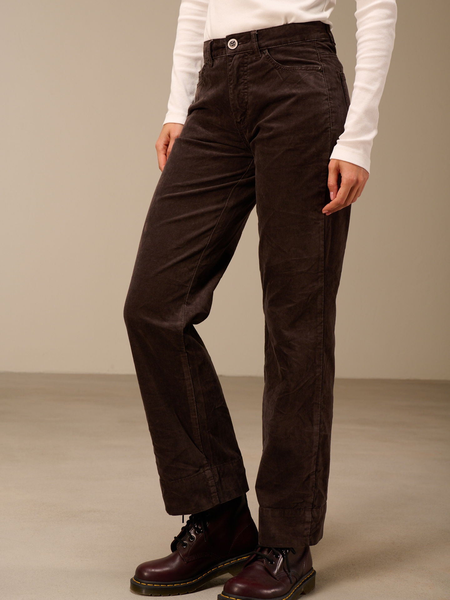 Pantaloni a gamba dritta con ampio risvolto e vita media. I pantaloni sono tinti in capo, il che comporta irregolarità nel colore, accentua l'effetto slavato e rende ogni capo unico.