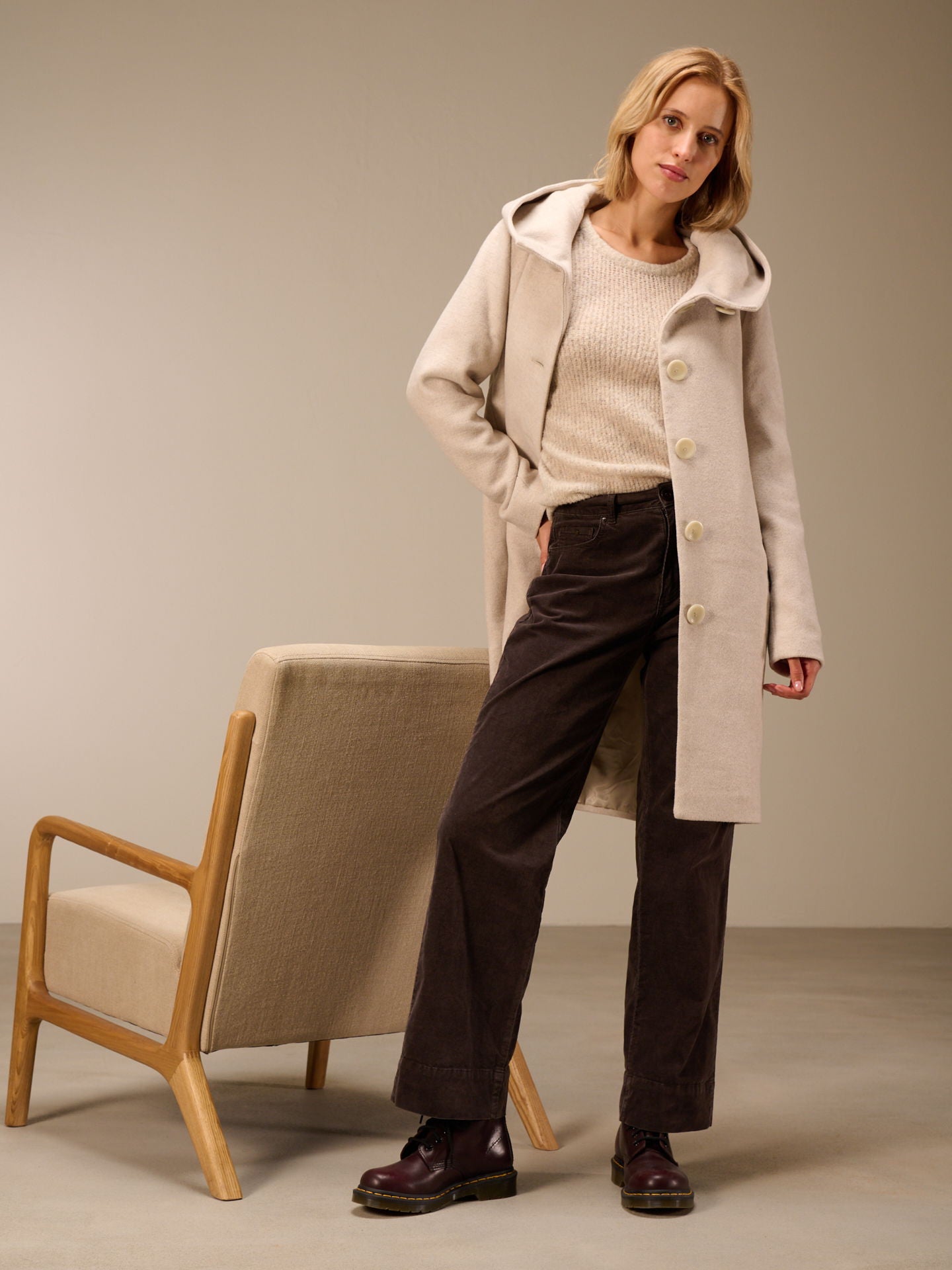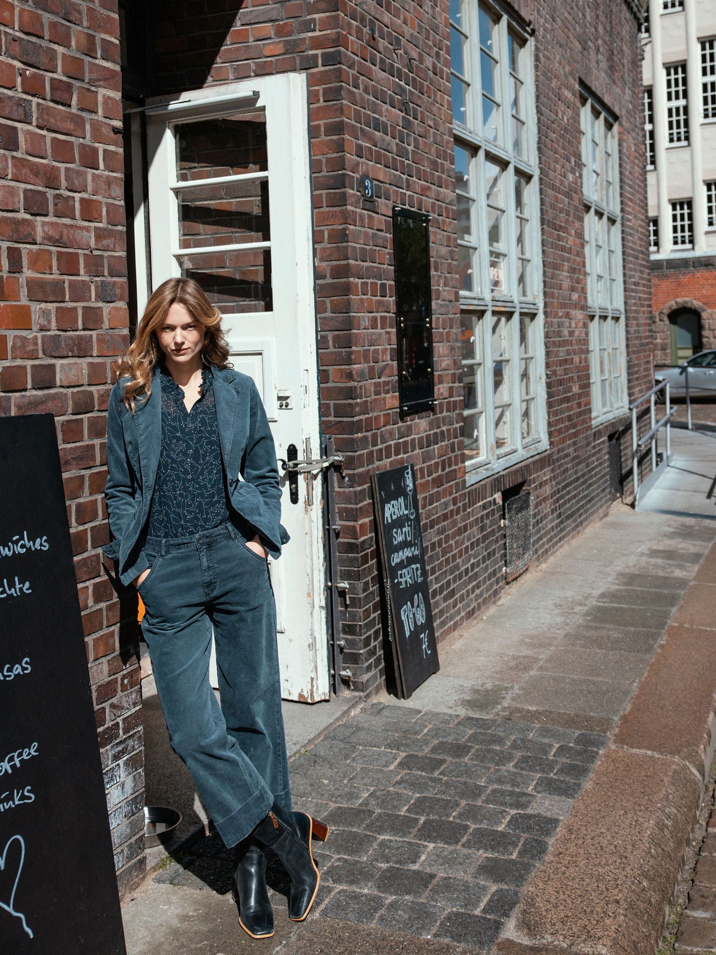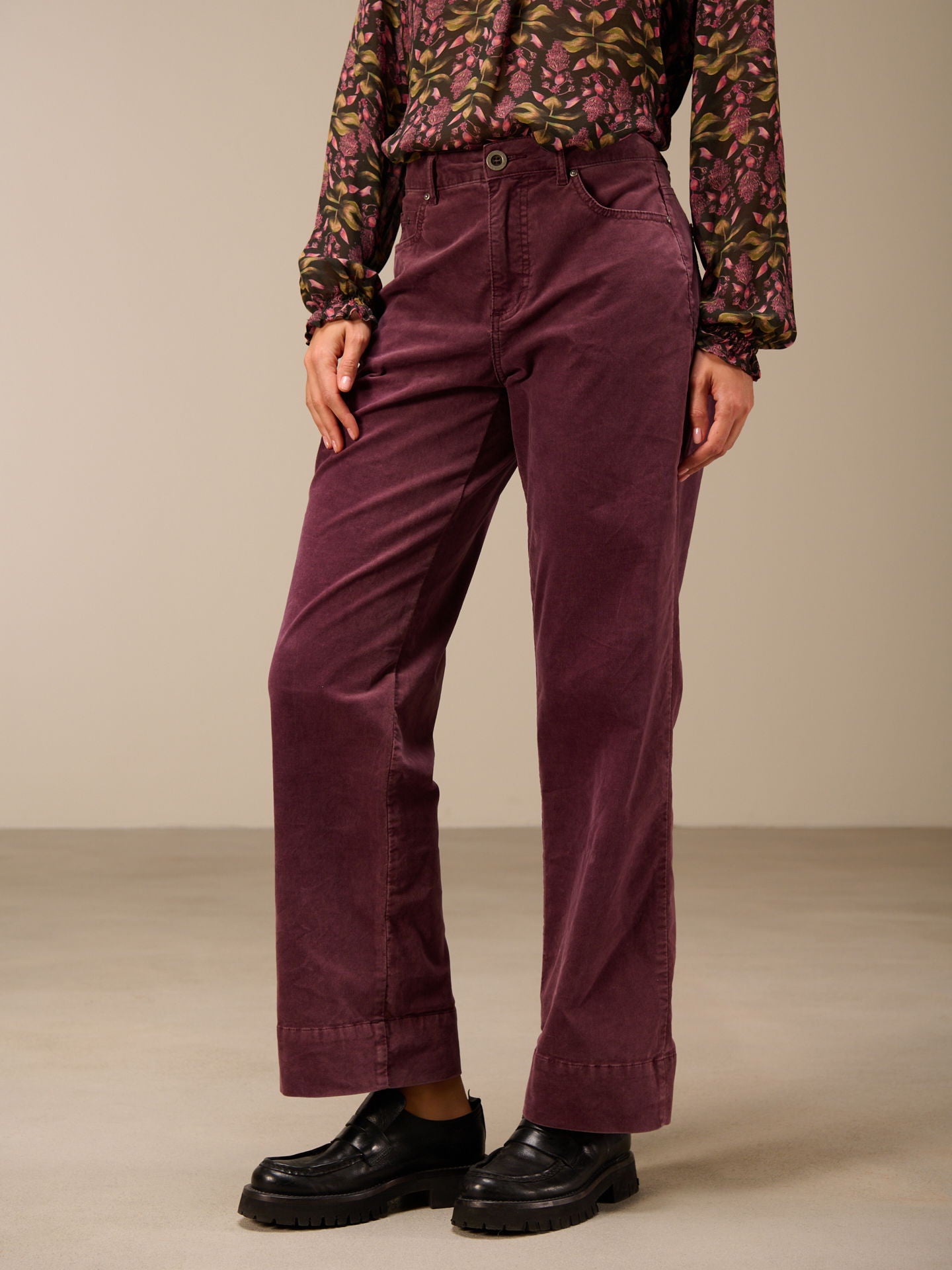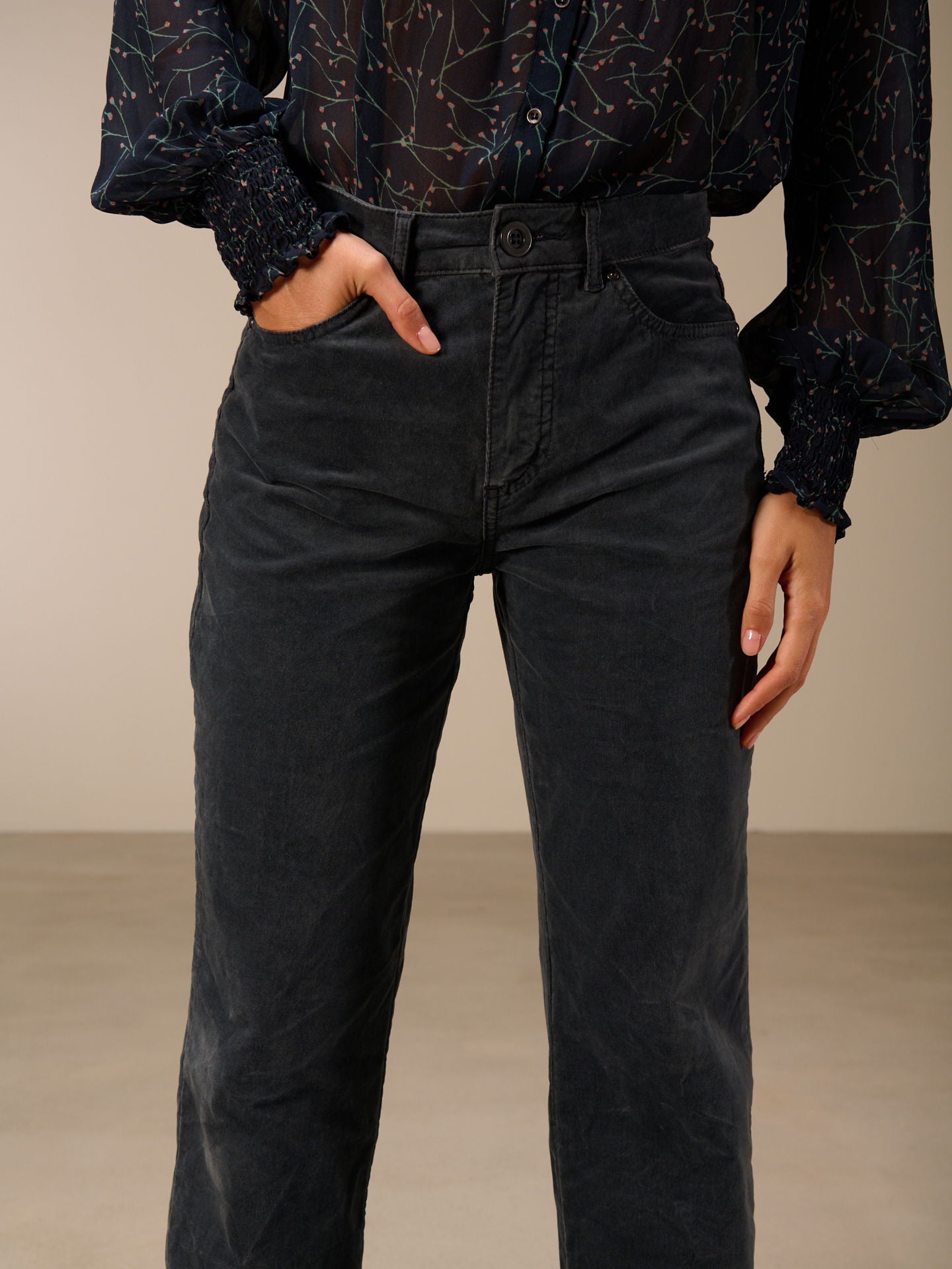 Pantaloni a gamba dritta con ampio risvolto e vita media. I pantaloni sono tinti in capo, il che comporta irregolarità nel colore, accentua l'effetto slavato e rende ogni capo unico.