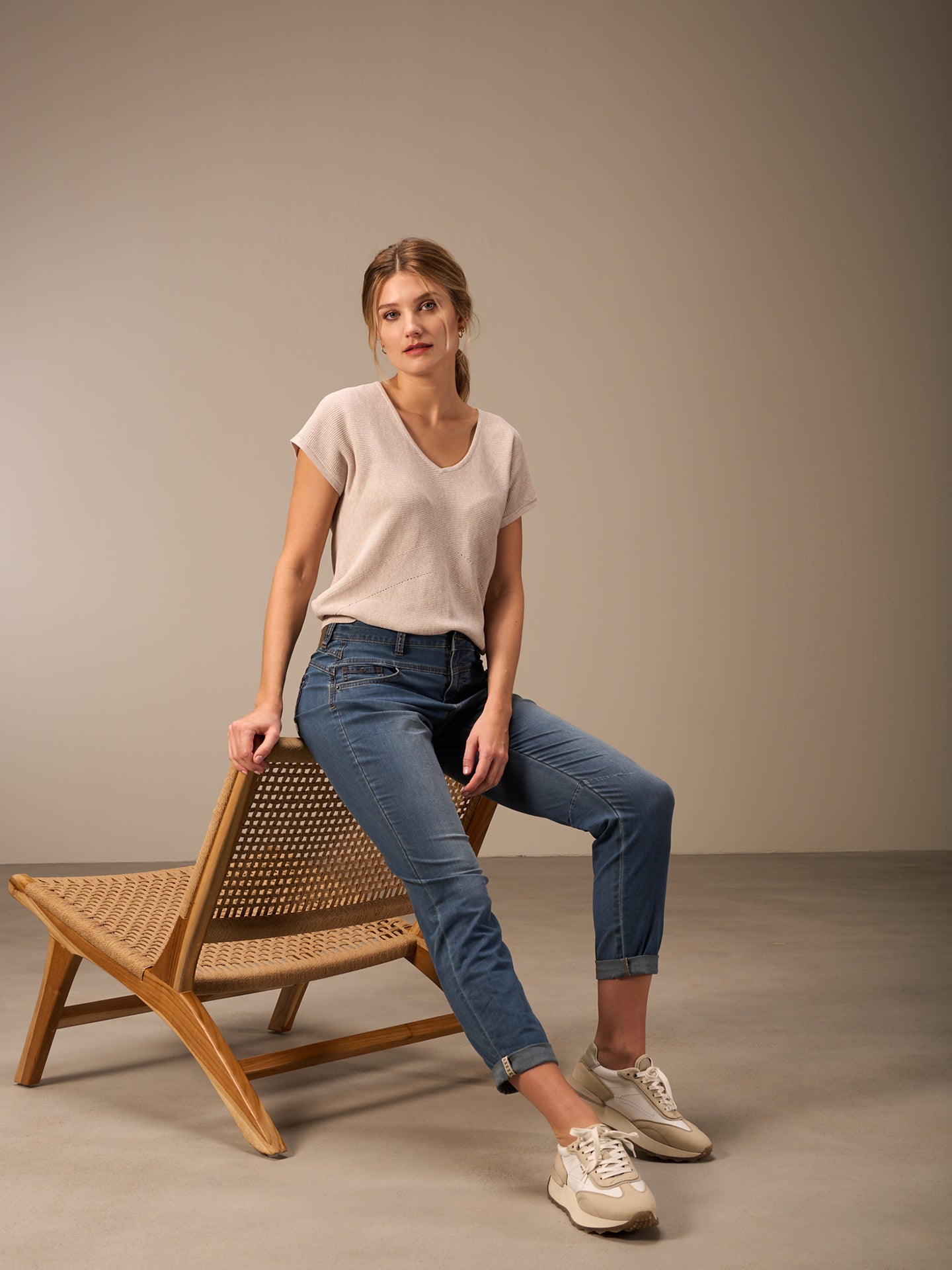 Pantaloni dalla vestibilità comoda sui fianchi, con gamba che si restringe verso la caviglia e risvolto alto per un look moderno. Lo speciale lavaggio conferisce al capo l'effetto cromatico desiderato. Le irregolarità del colore rendono ogni capo unico. L'effetto slavato è accentuato.
