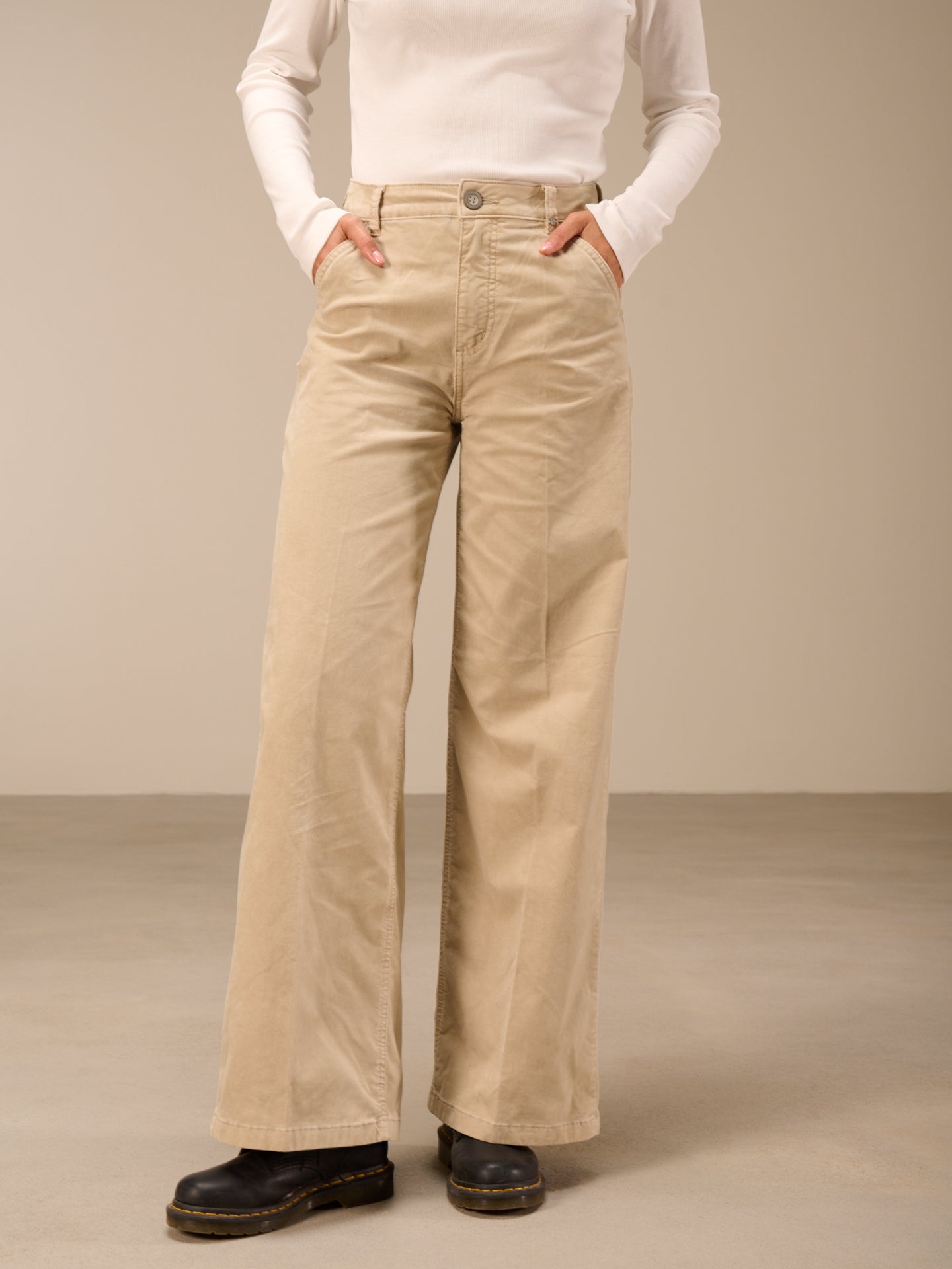 Pantaloni con gamba ampia leggermente svasata e vita media. I pantaloni sono tinti in capo, il che comporta irregolarità nel colore, accentua l'effetto slavato e rende ogni capo unico.