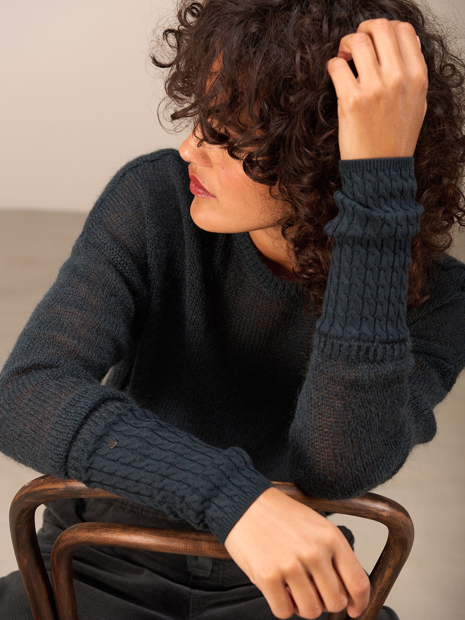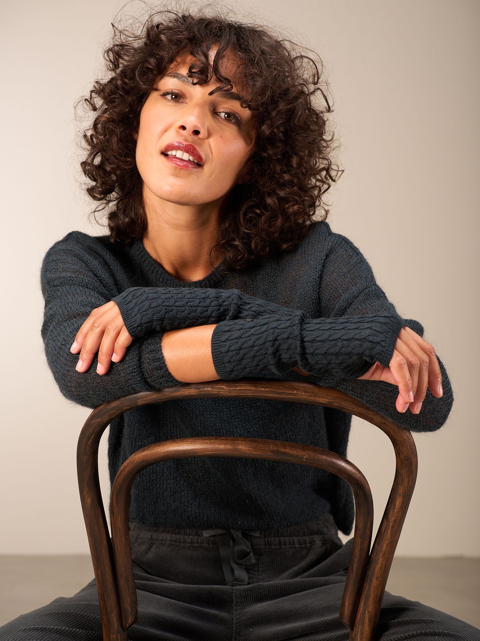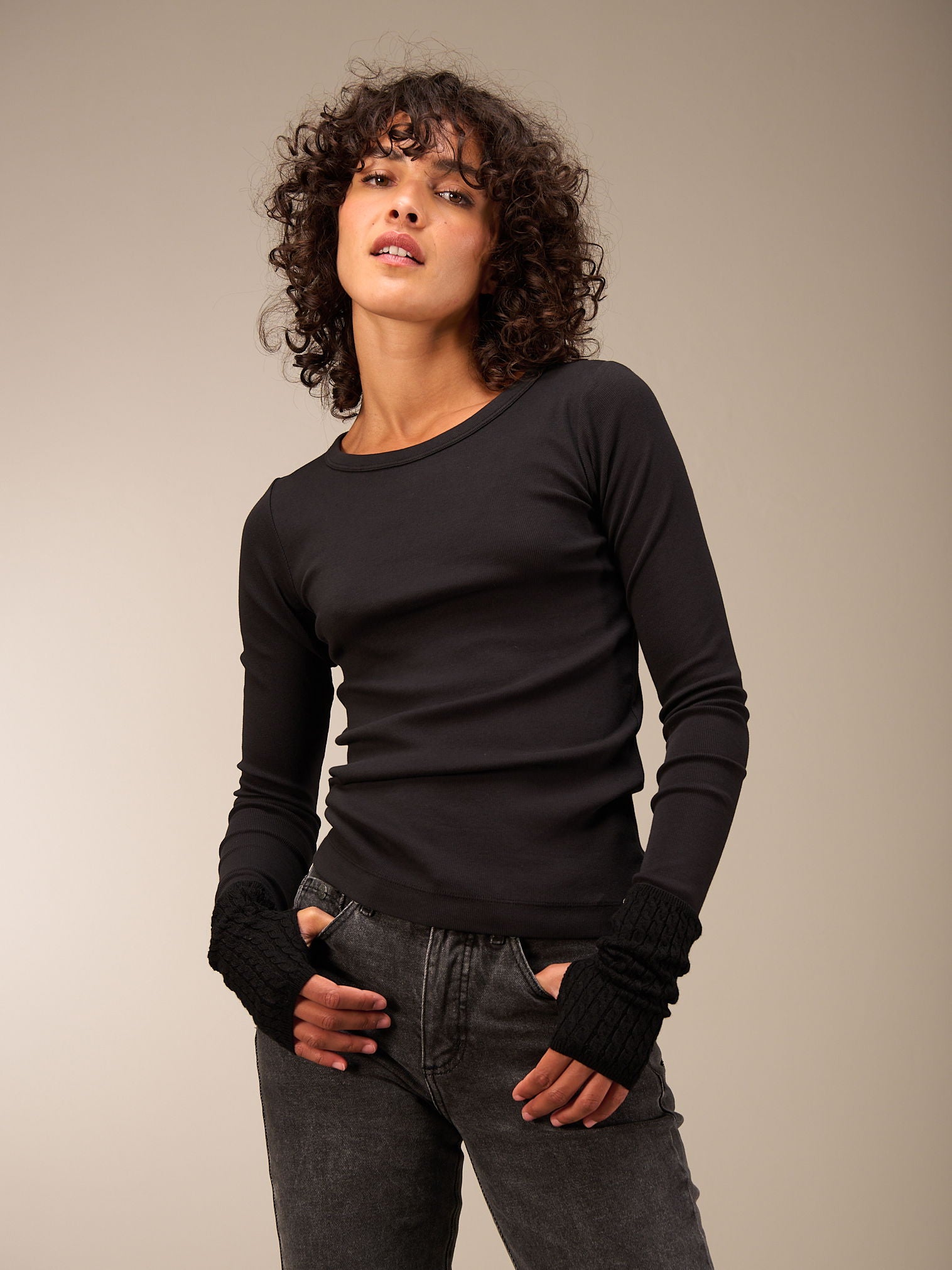 Scaldapolsi dal sofisticato look a maglia a treccia con pratici fori per il pollice, realizzati in uno speciale filato melange.