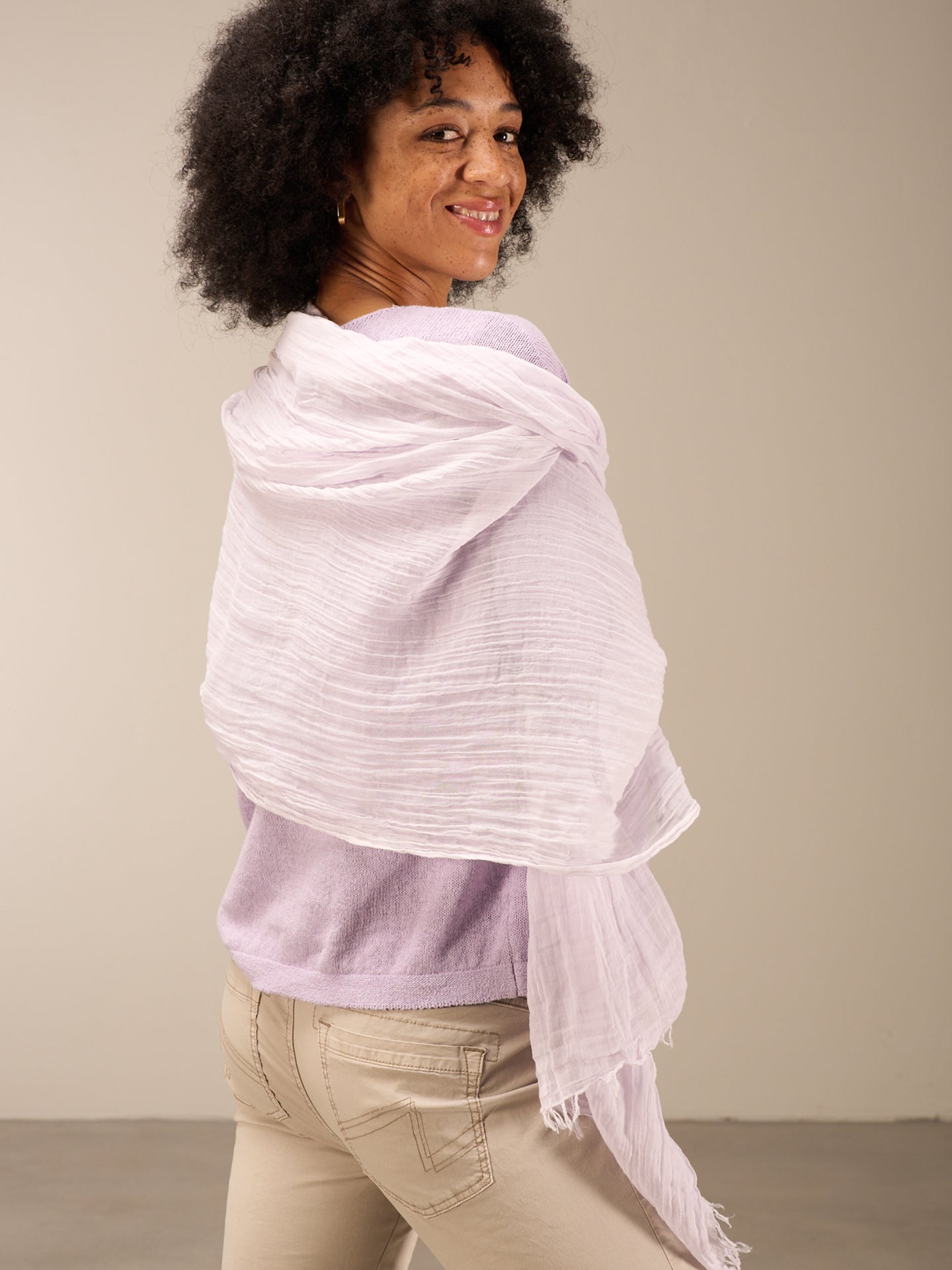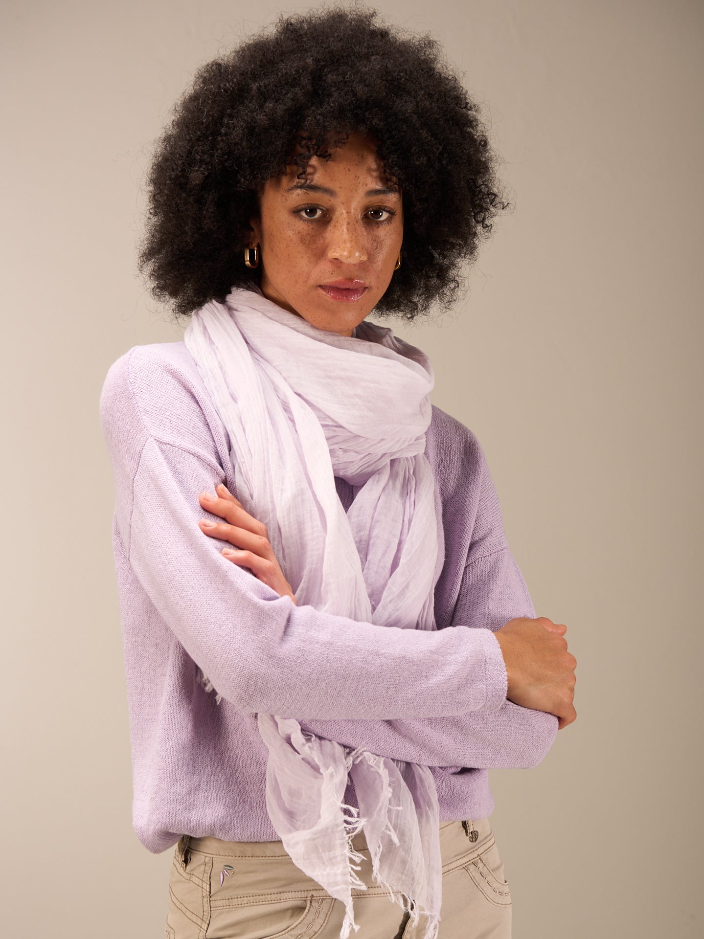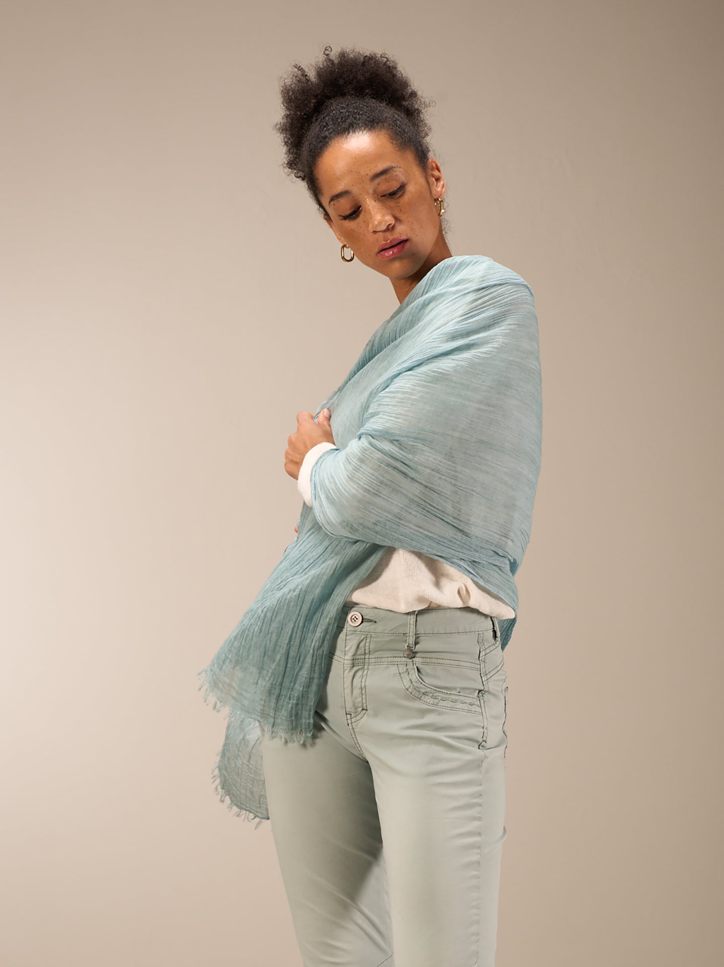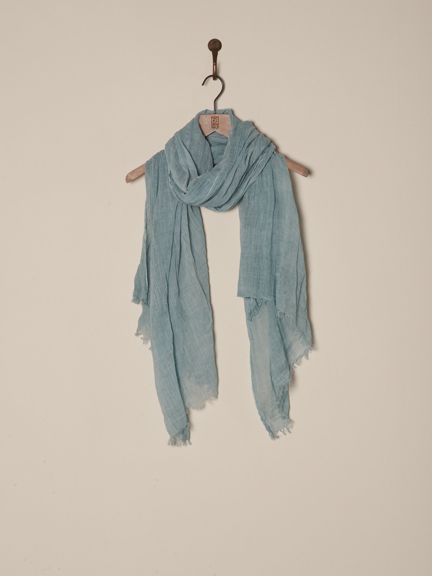 Einfarbiger Schal in der Grösse 100 x 200 cm. 100% Bio-Baumwolle aus zertifiziertem Anbau. Durch ein spezielles Färbeverfahren erhält der Schal einen schönen ausgewaschenen Look. Unregelmässigkeiten in der Farbe machen das Stück einzigartig. Der Ausbleicheffekt wird verstärkt.