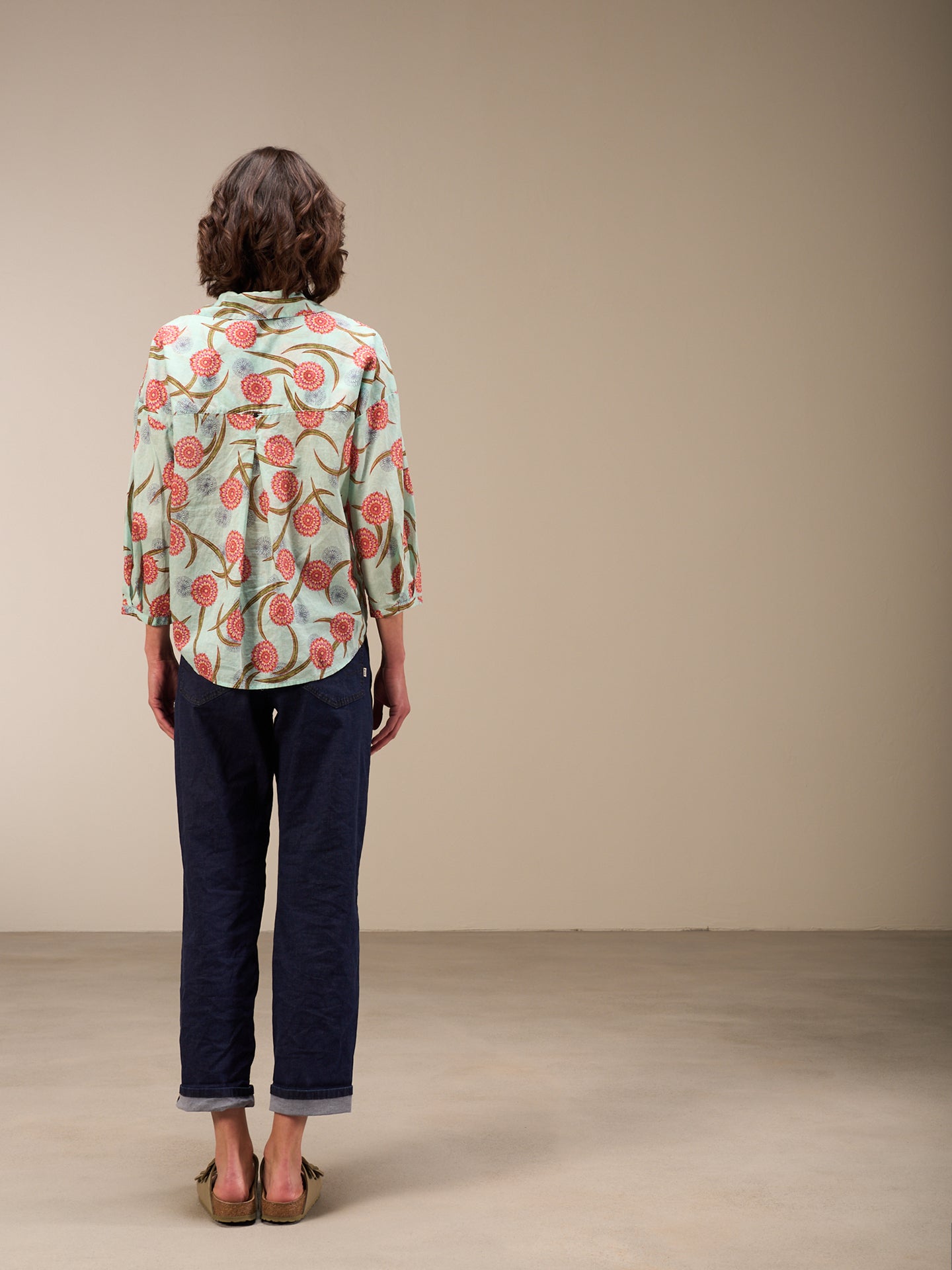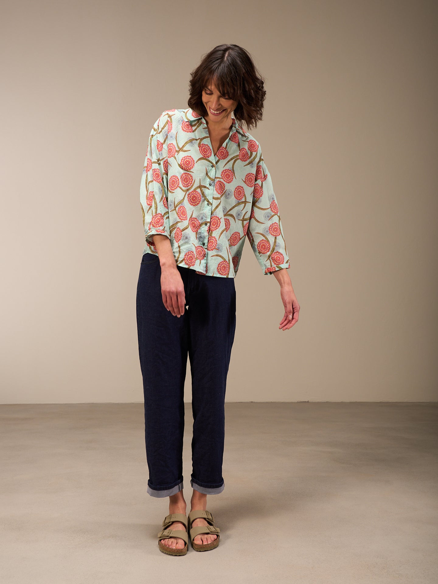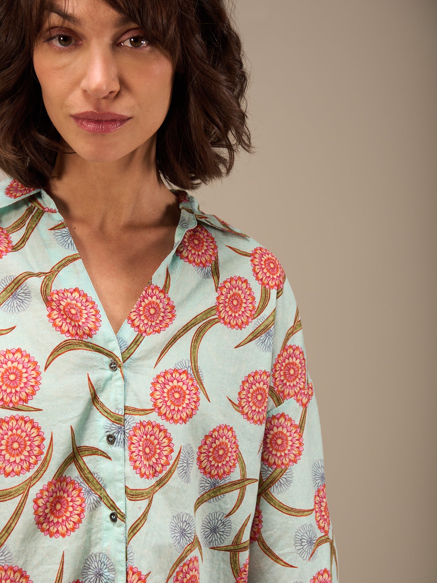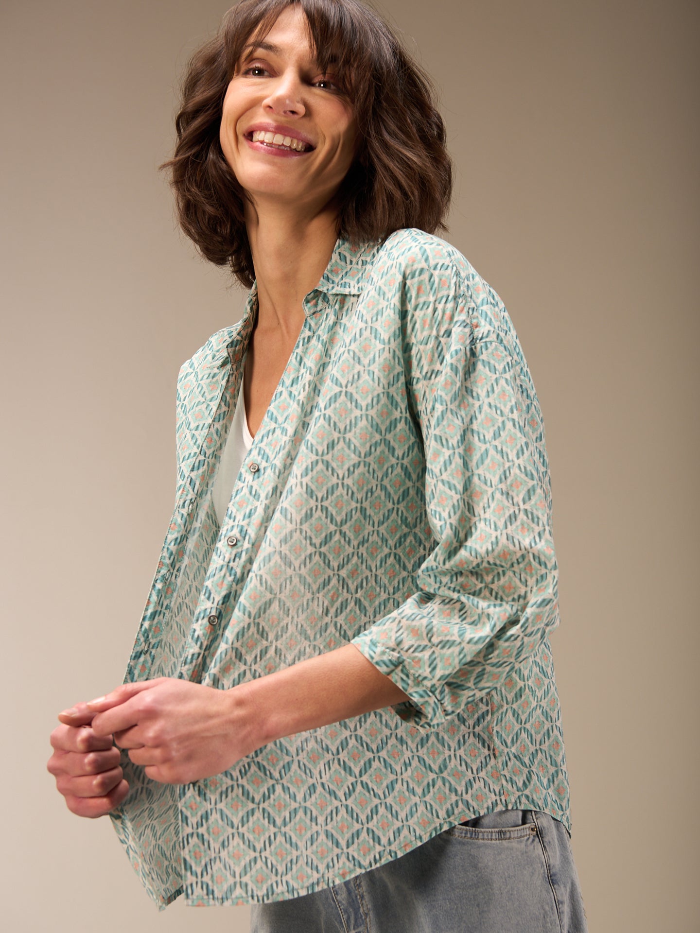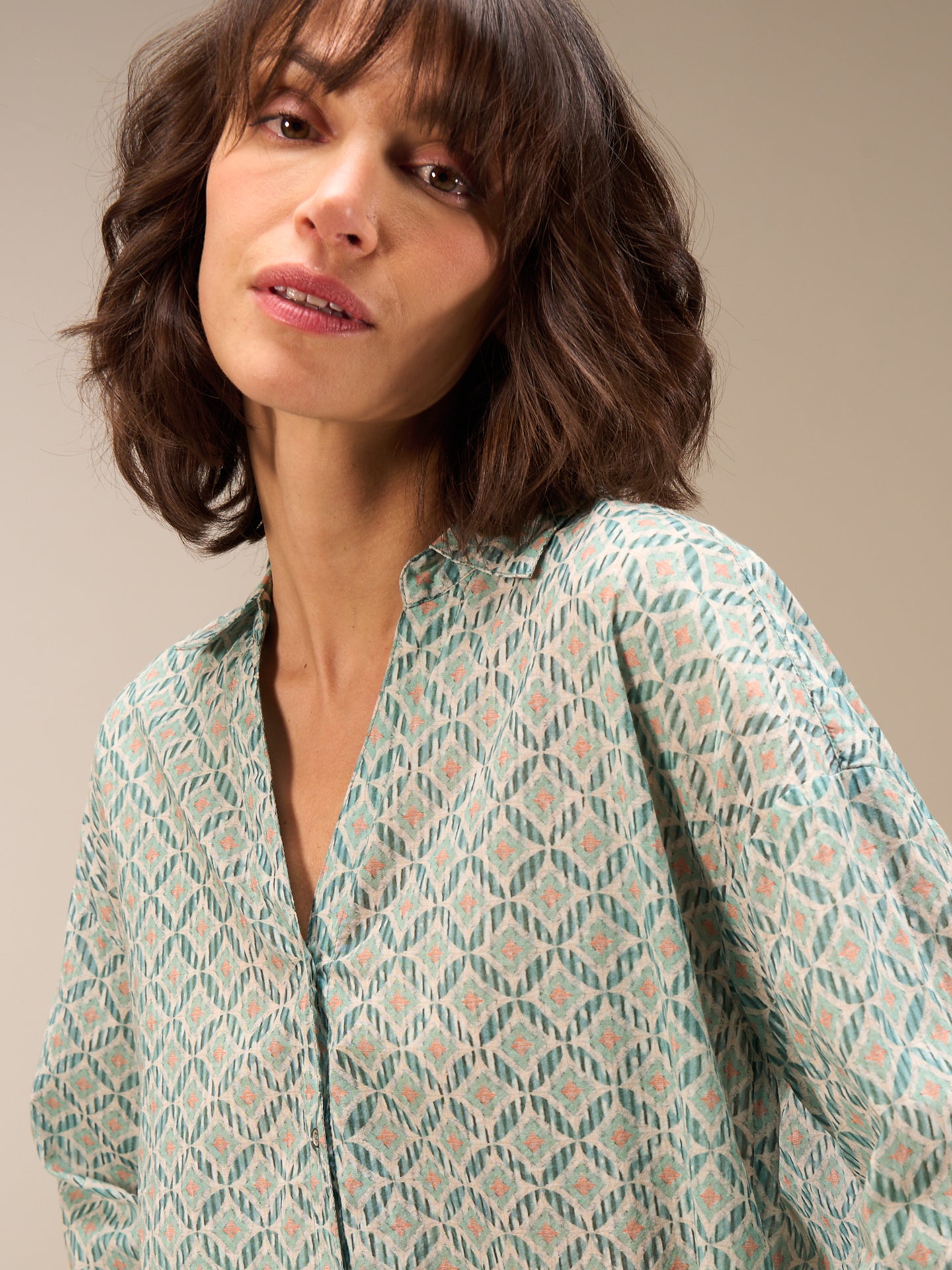 Sommerlich lässige, oversize geschnittene Bluse in handgezeichnetem Alloverprint mit Hemdkragen, kleinen Metallknöpfen und weiten Ärmeln mit Falten an der Arm-Manchette. 100% Bio-Baumwolle aus zertifiziertem Anbau.