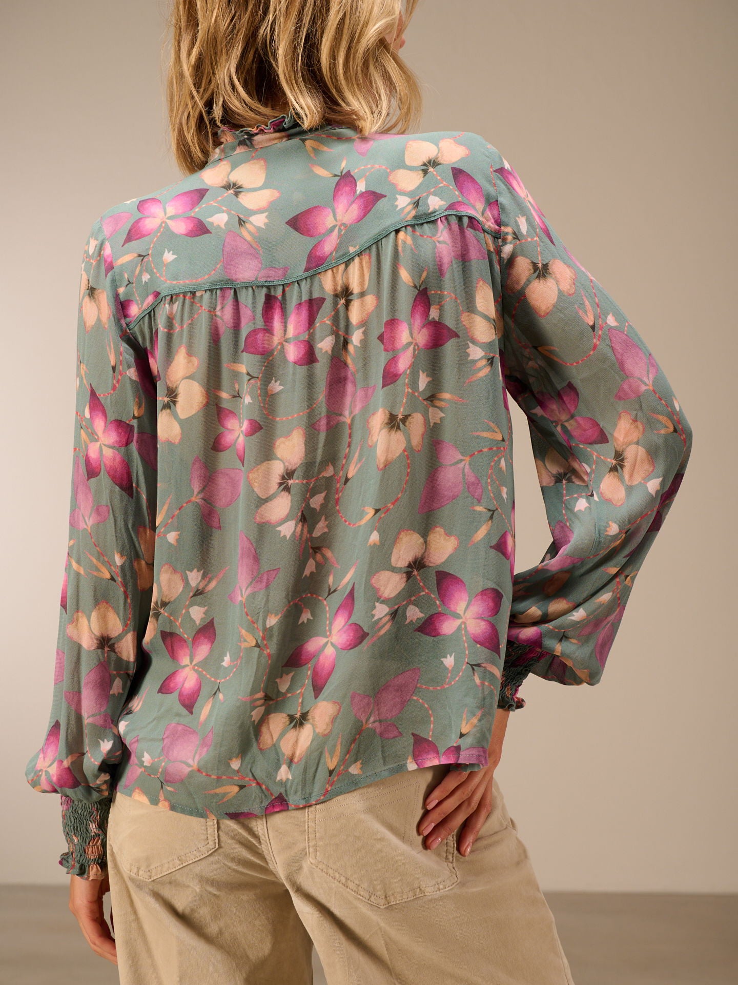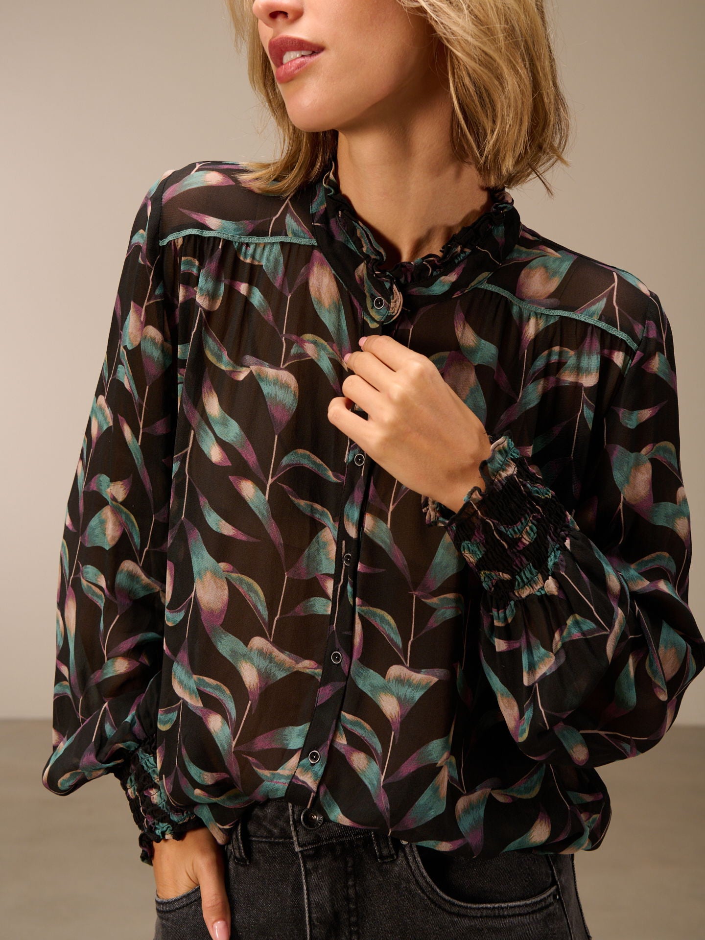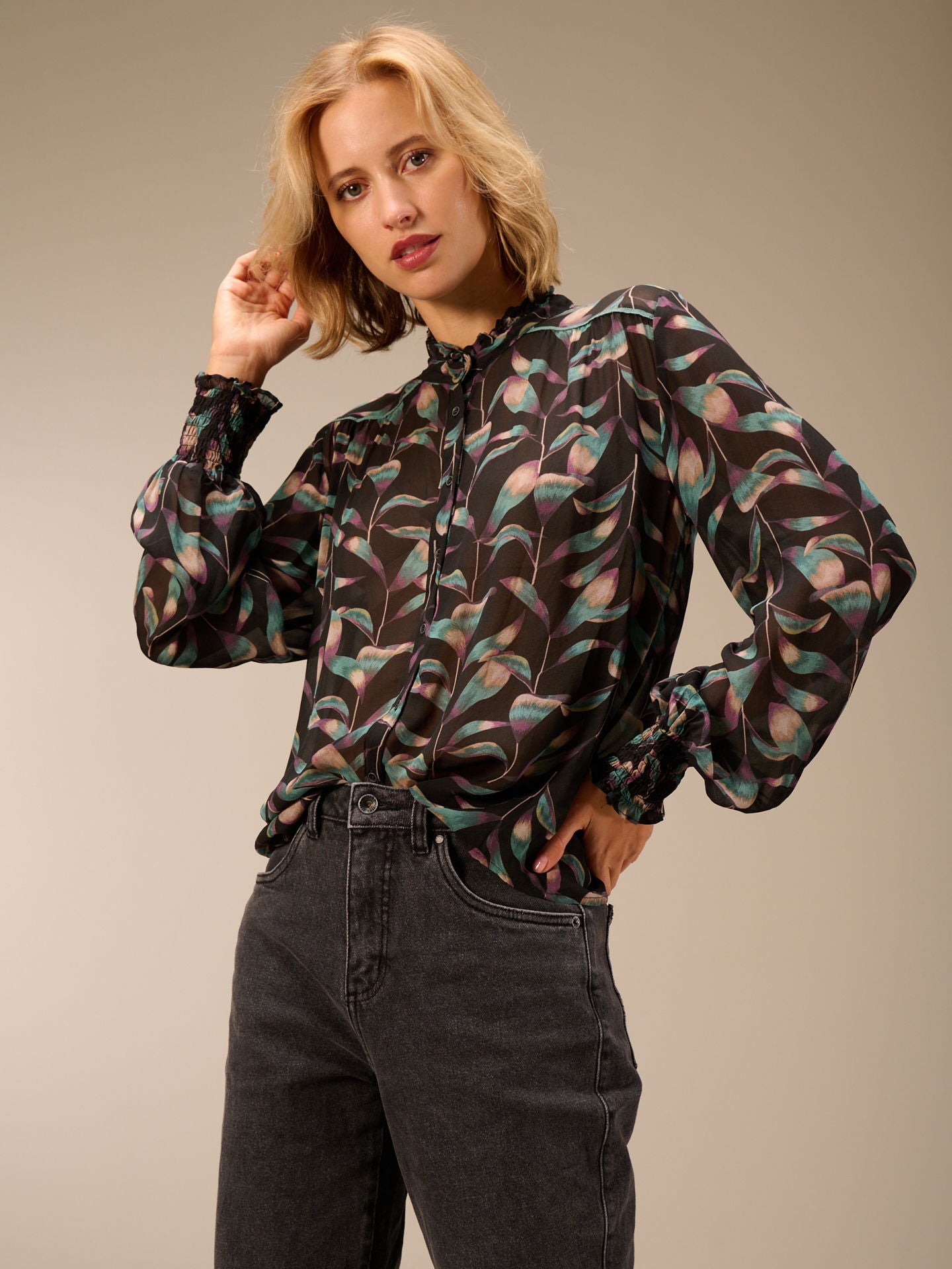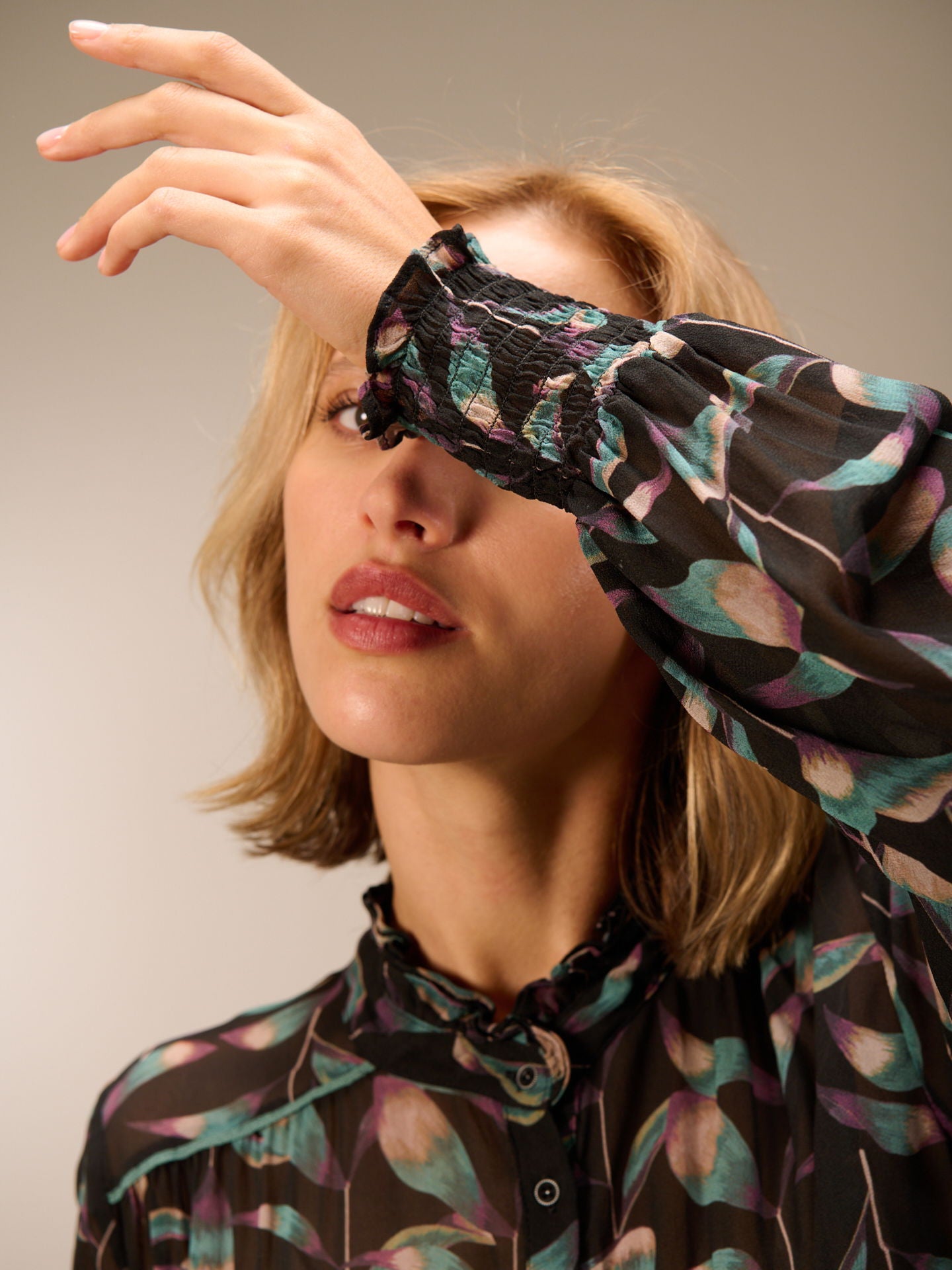 Weit geschnittene durchgeknöpfte Bluse in handgezeichnetem Allover Print mit langen Ärmeln und hübschen gesmockten Details an den Armmanchetten. Der kleine gerüschte Stehkragen und die edlen Metallknöpfe runden den Style ab.