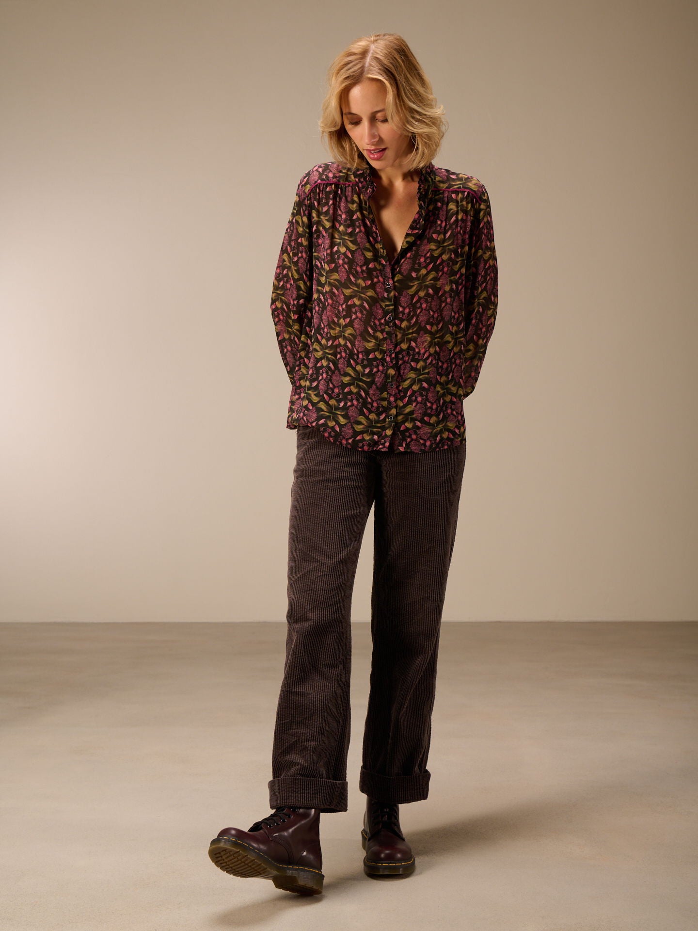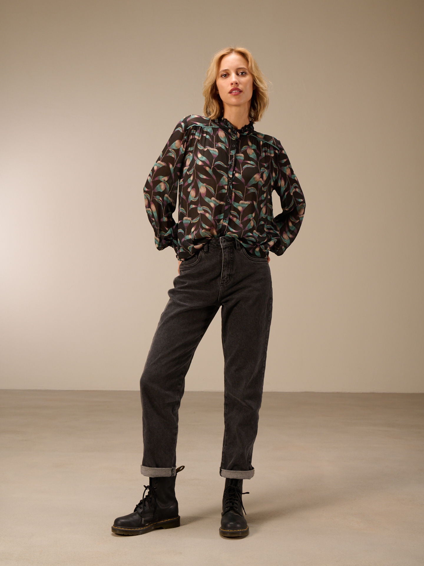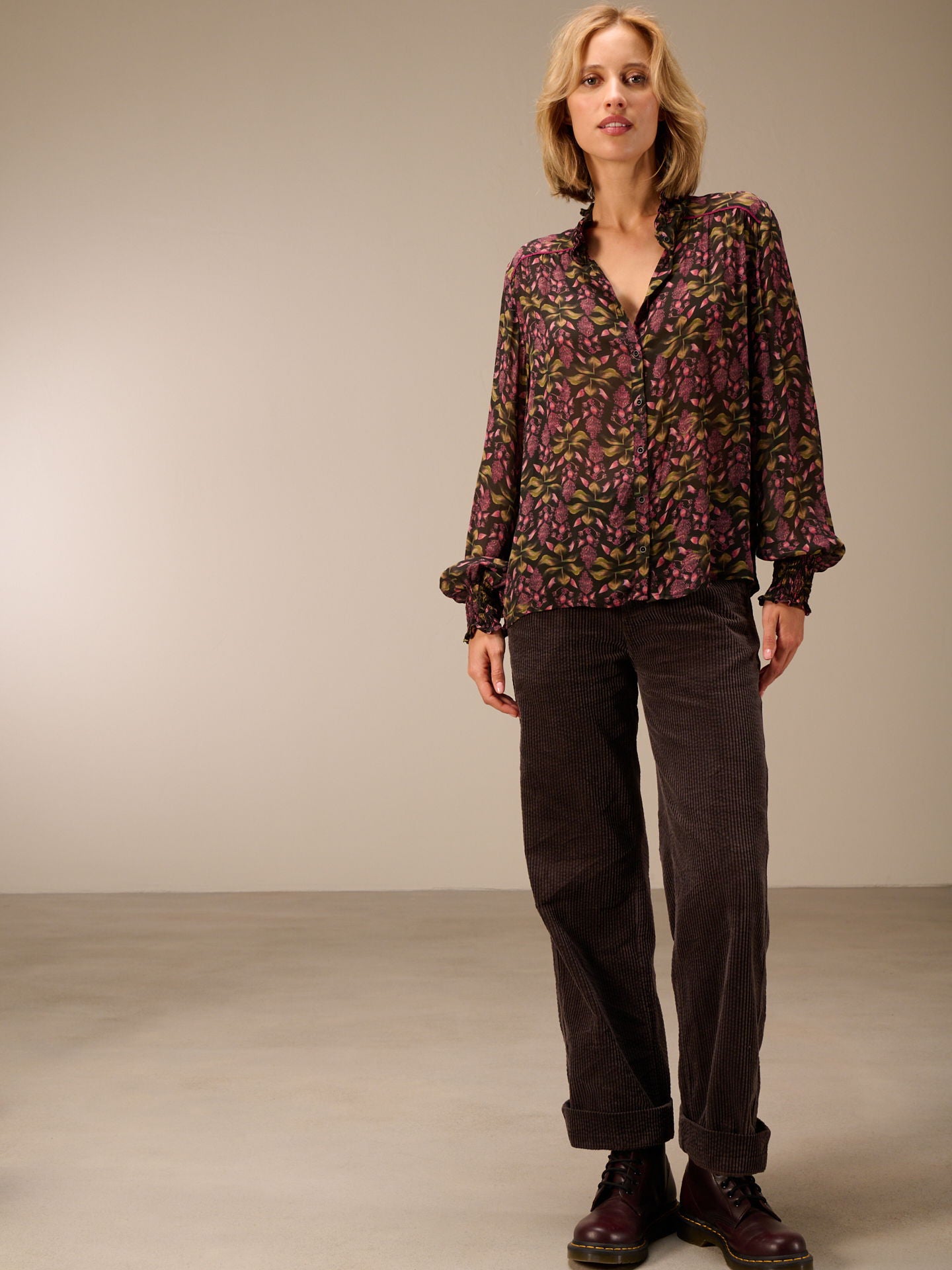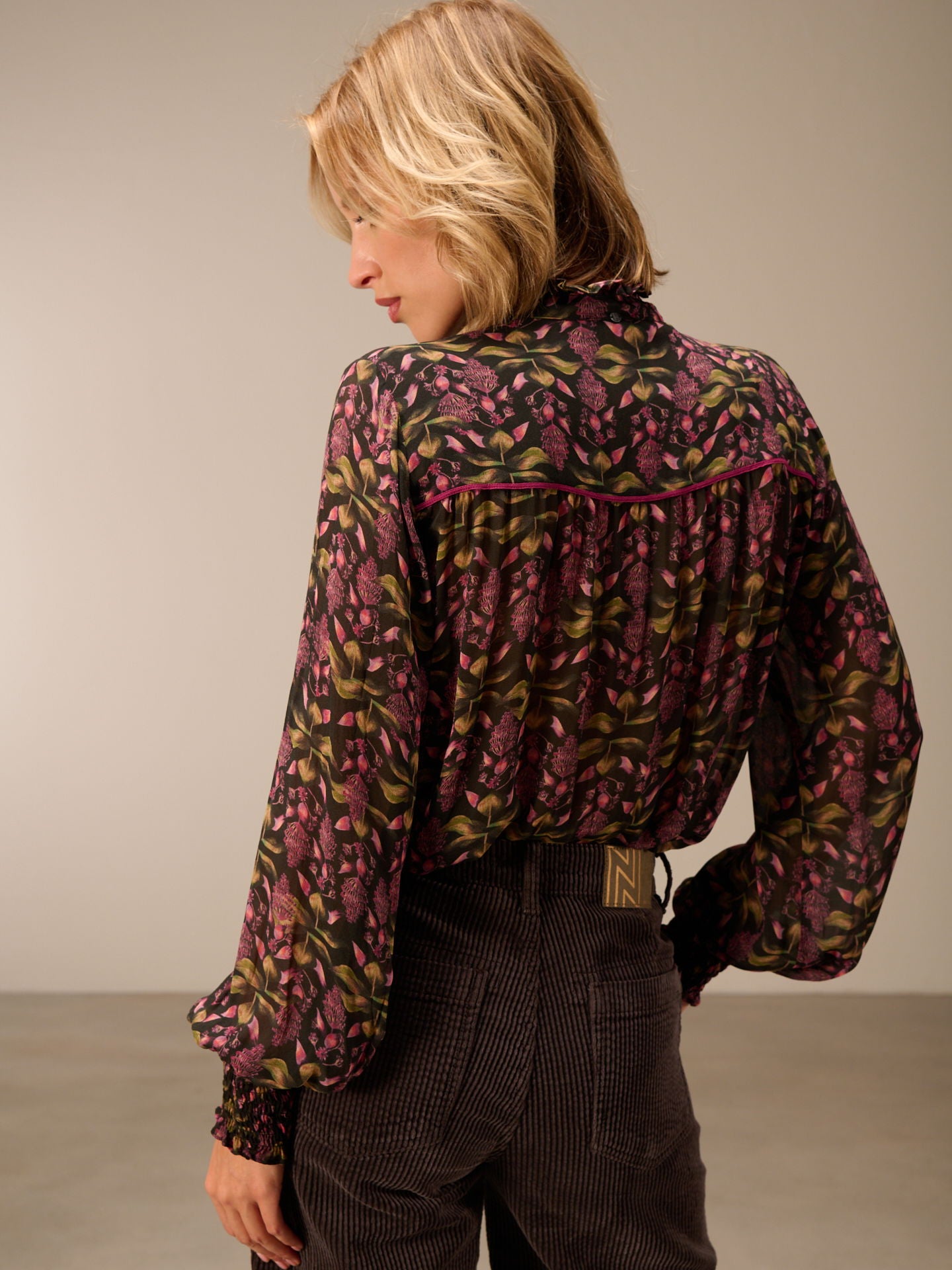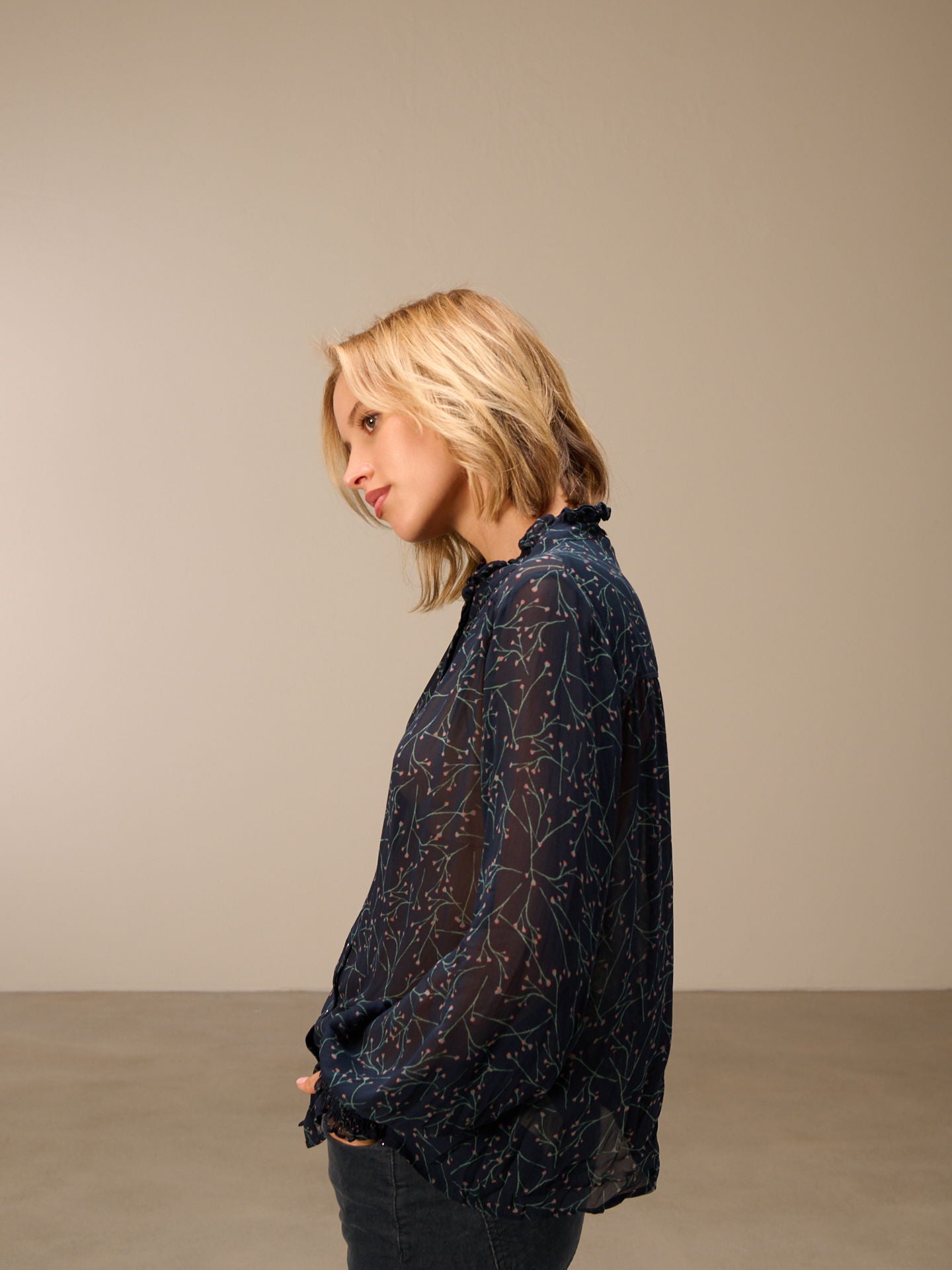 Weit geschnittene durchgeknöpfte Bluse in handgezeichnetem Allover Print mit langen Ärmeln und hübschen gesmockten Details an den Armmanchetten. Der kleine gerüschte Stehkragen und die edlen Metallknöpfe runden den Style ab.