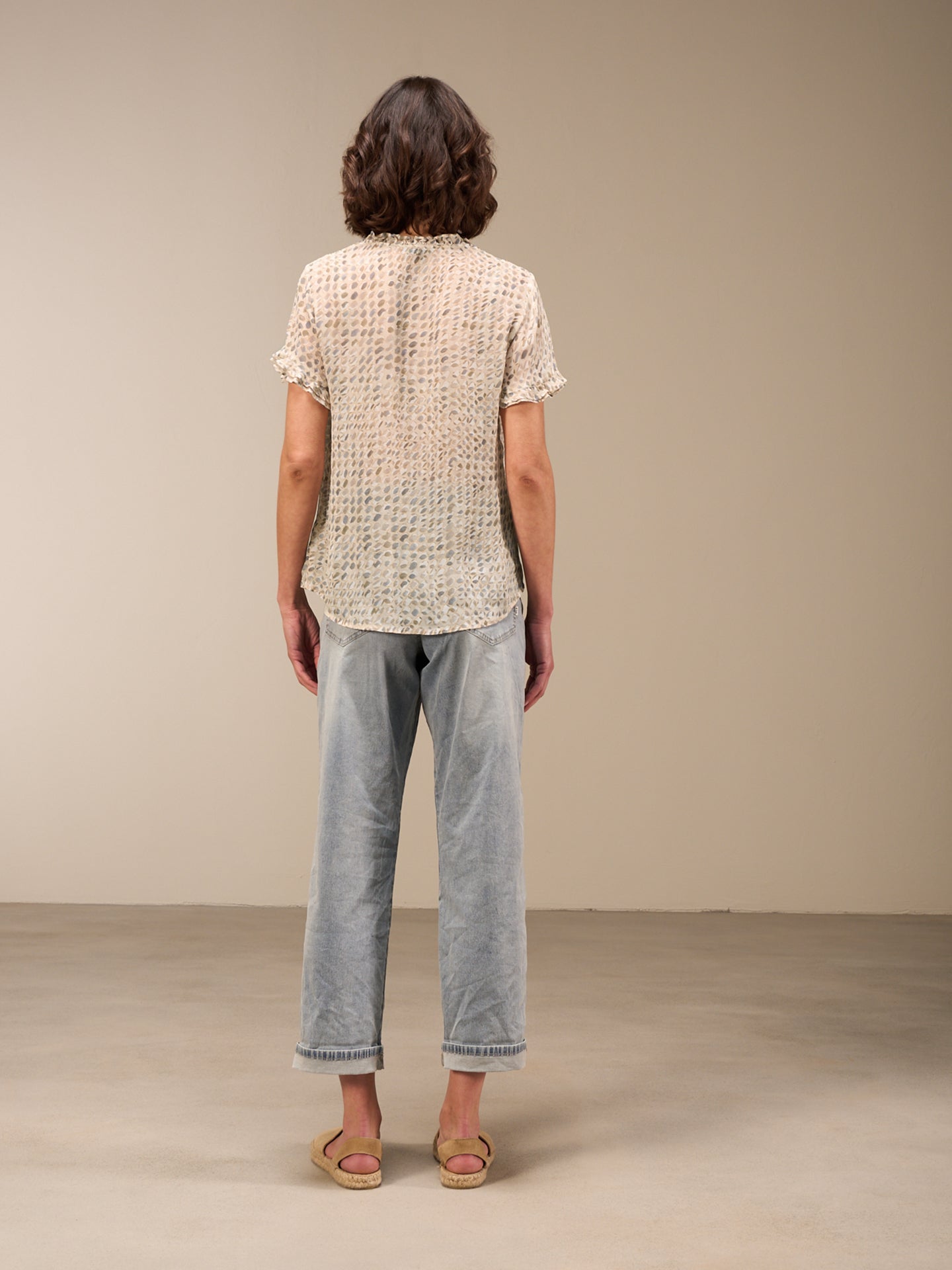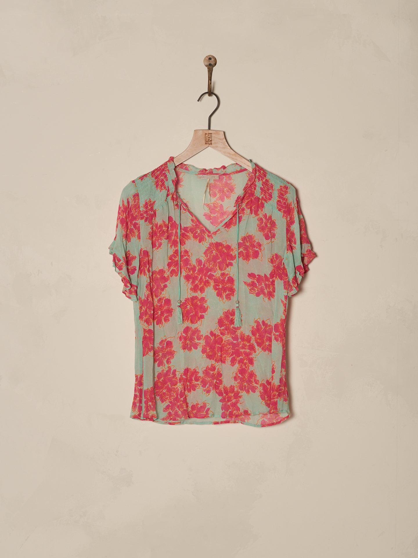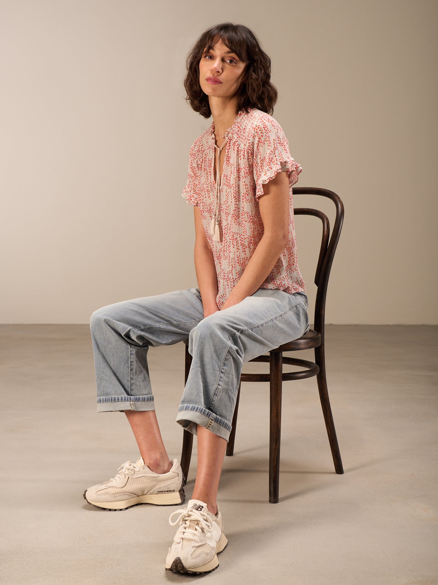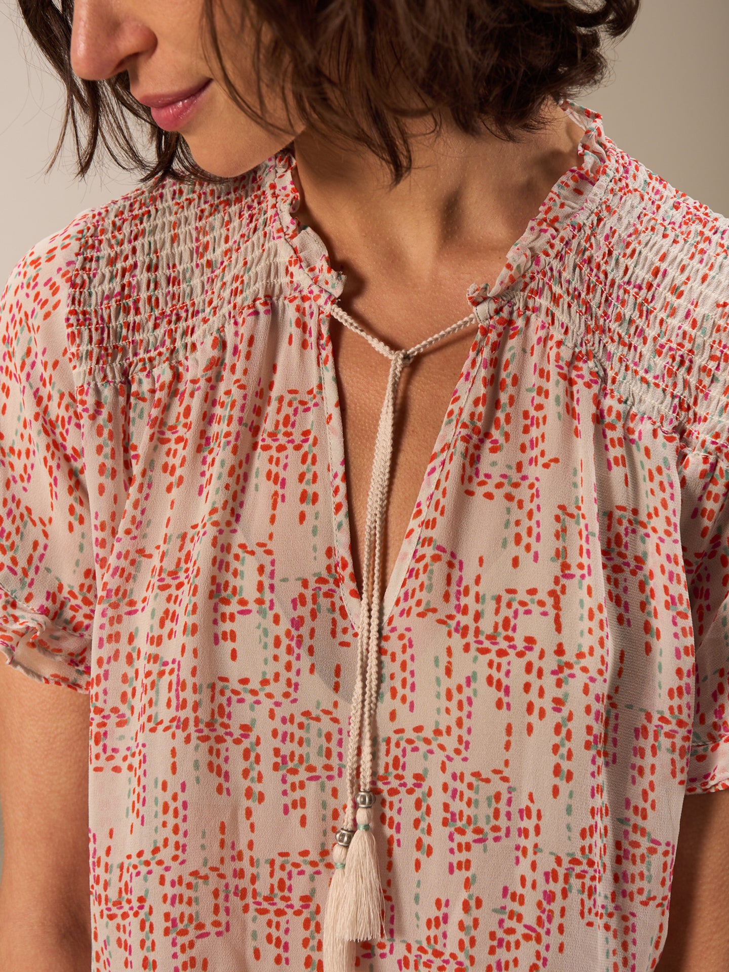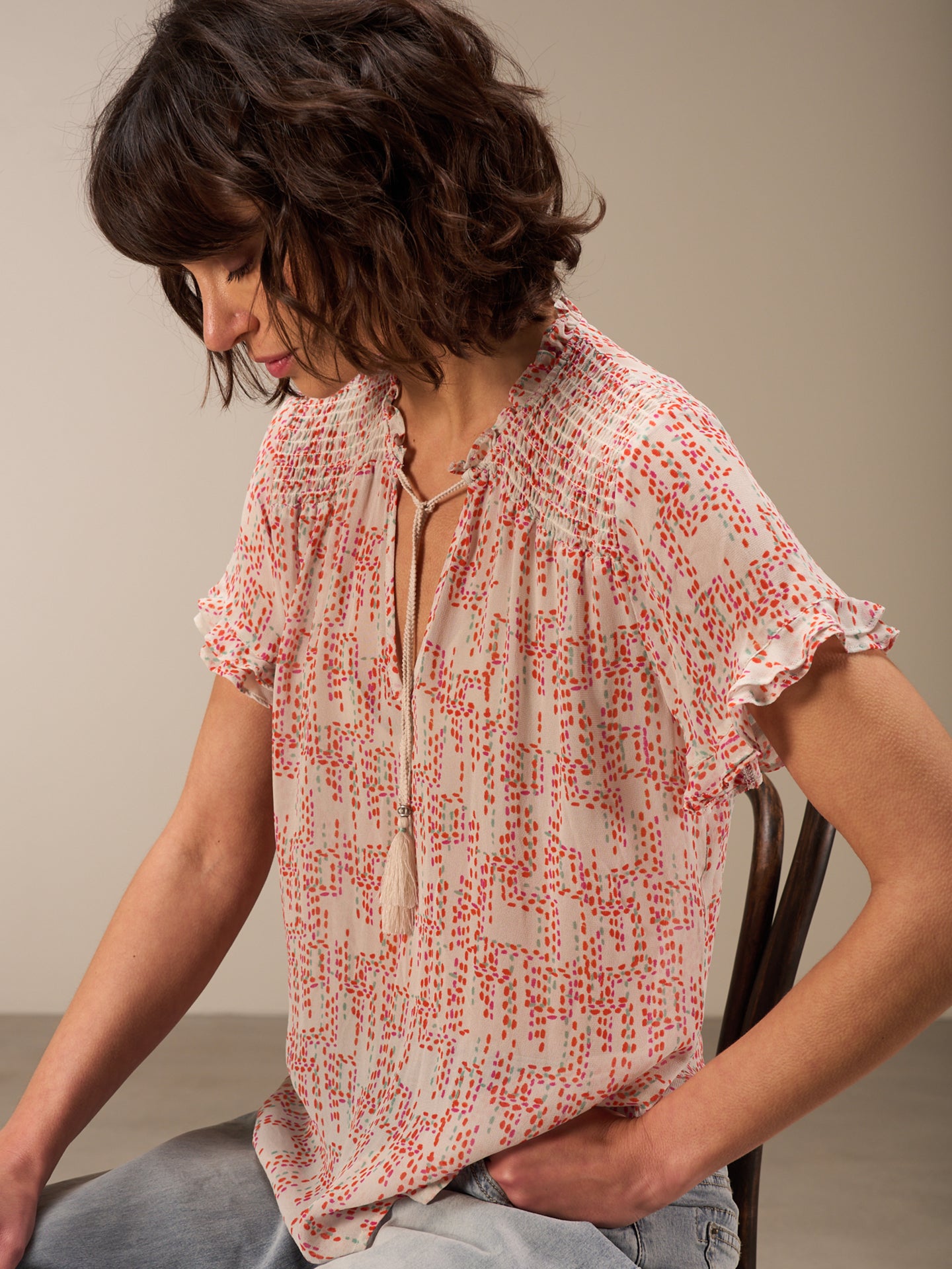 Lässig geschnittene Kurzarmbluse mit verspielten Details an Rüschenstehkragen und Ärmeln. Die gesmockte Schulterpartie und die dekorativen Bänder am Ausschnitt runden den sommerlichen Style ab.