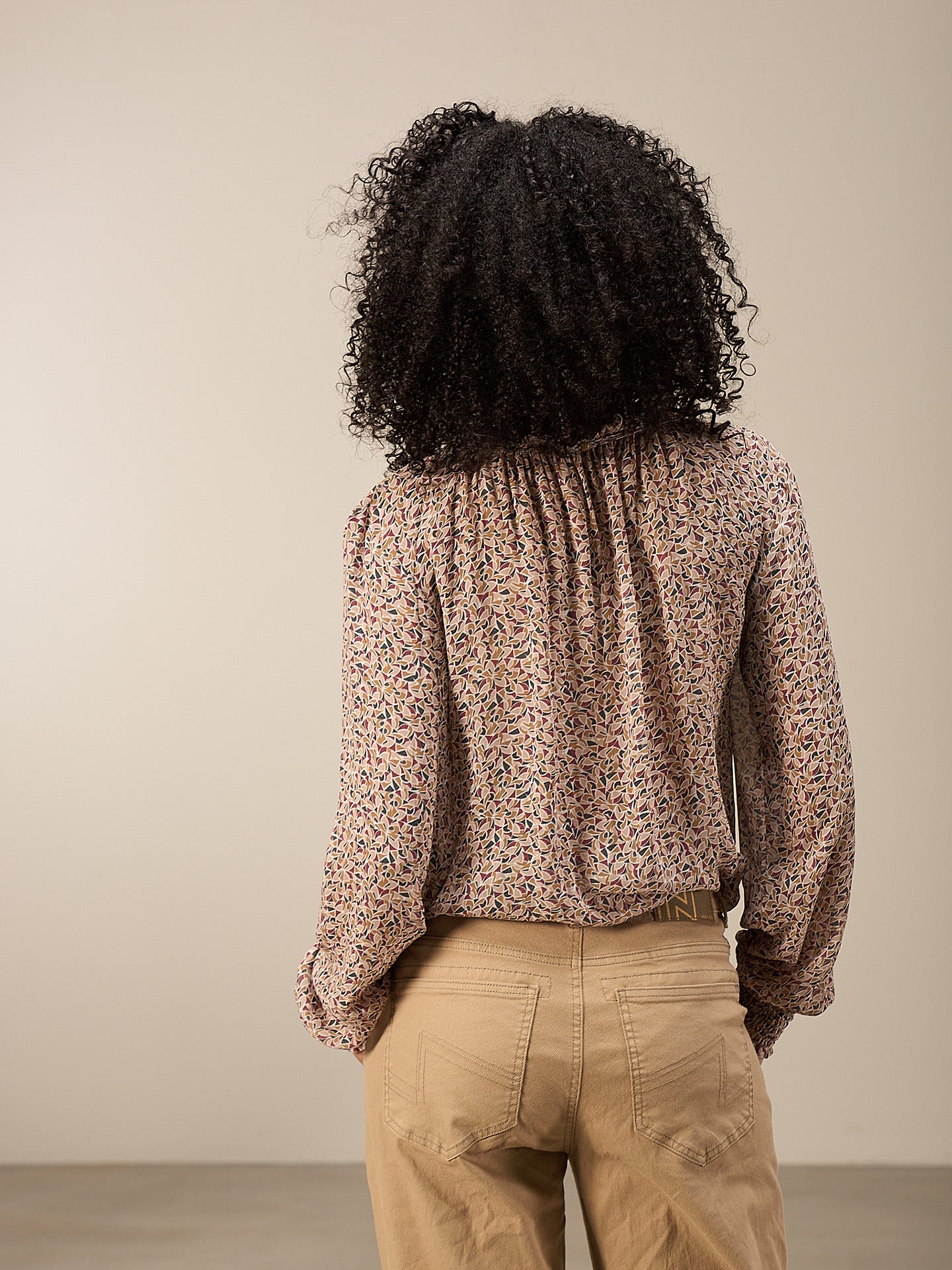 Leicht taillierte Bluse in romantischer Optik mit kleinem Rüschenstehkragen mit Zierbändern. Die langen Ärmel haben einen dekorativ gesmokten Manchettenabschluss. Der passende handgezeichnete Alloverprint runden den Look der Bluse ab. Aus 100% Eco Viskose, die aus nachhaltiger Holzwirtschaft gewonnen wird.