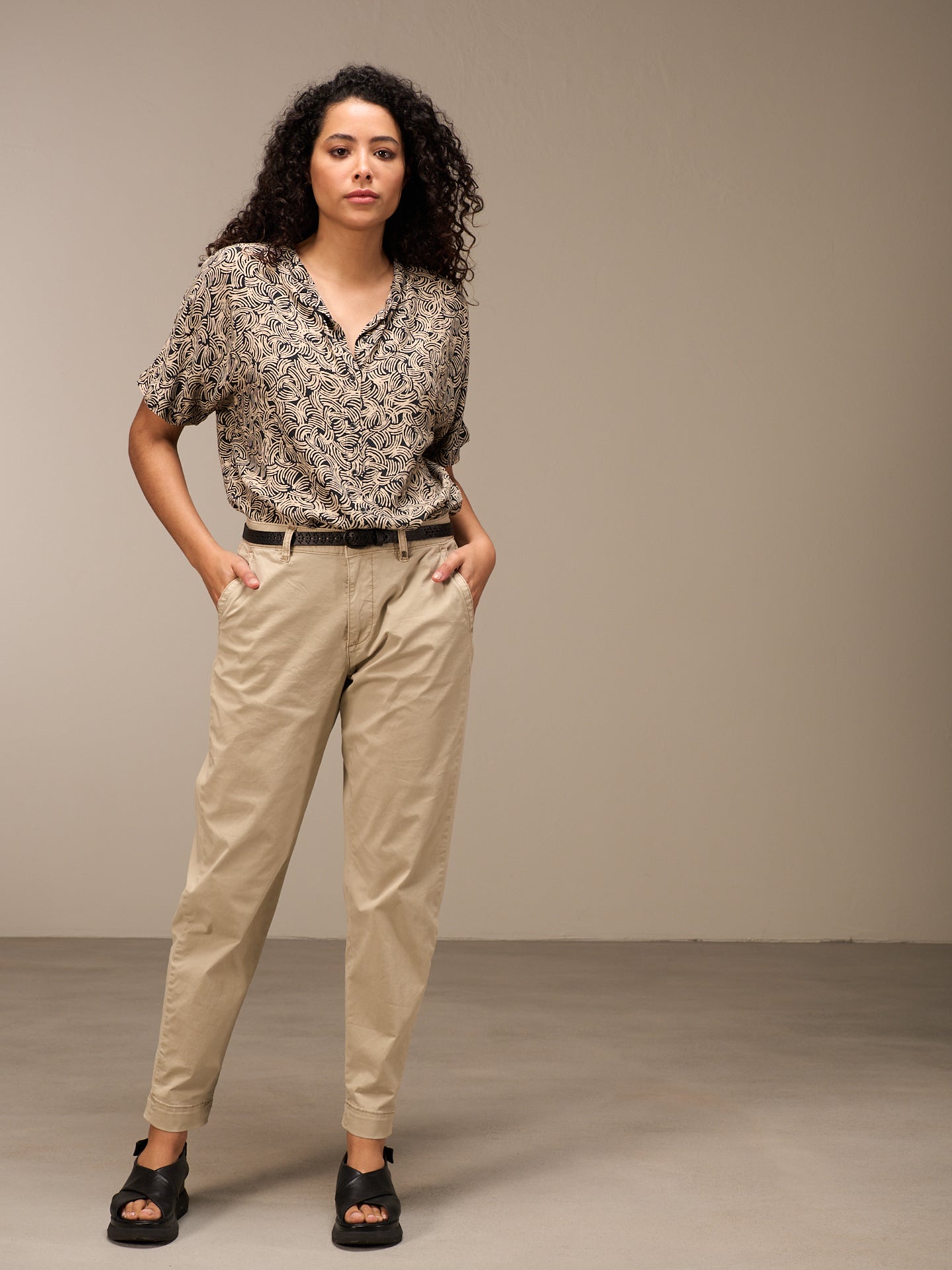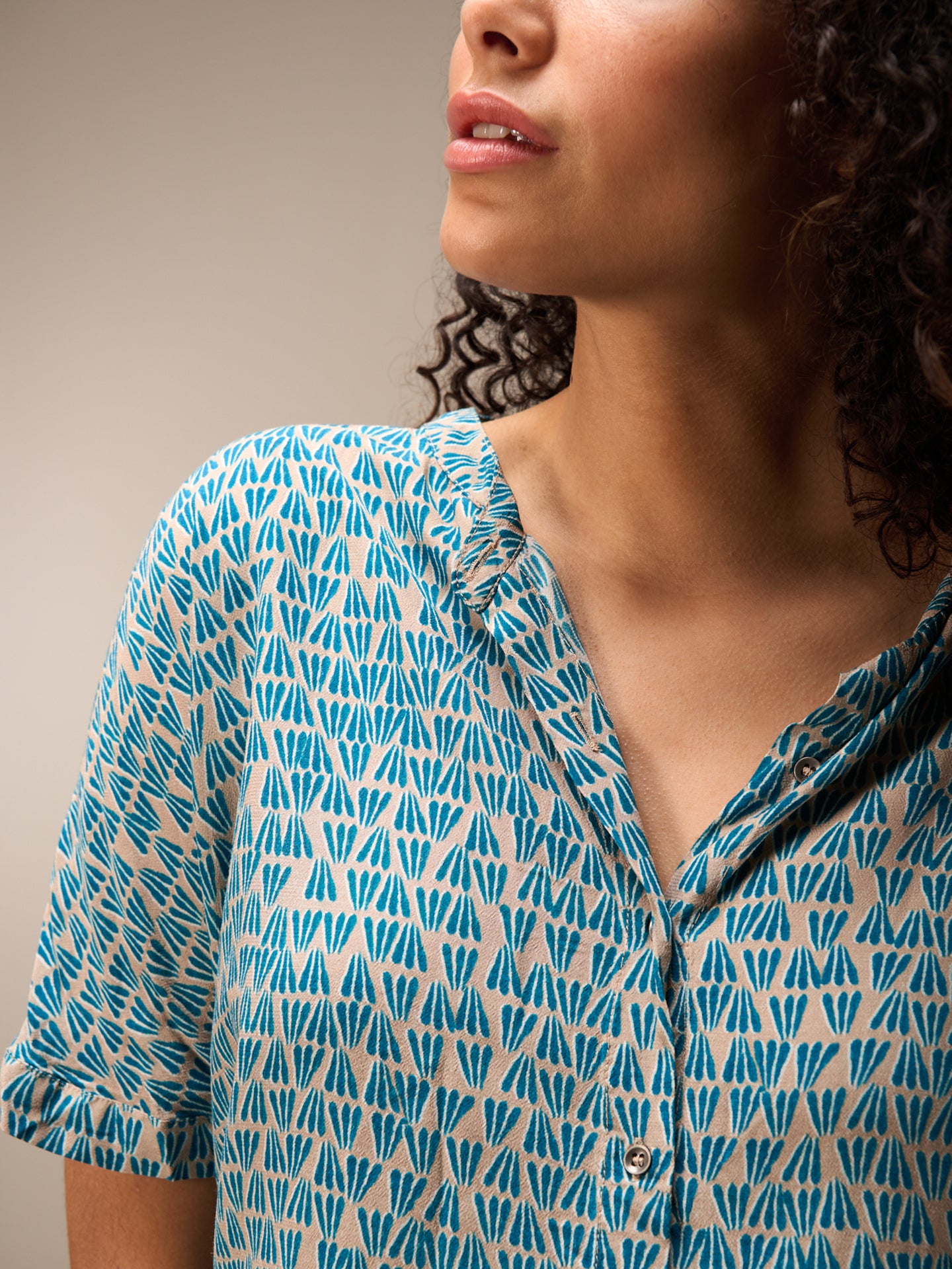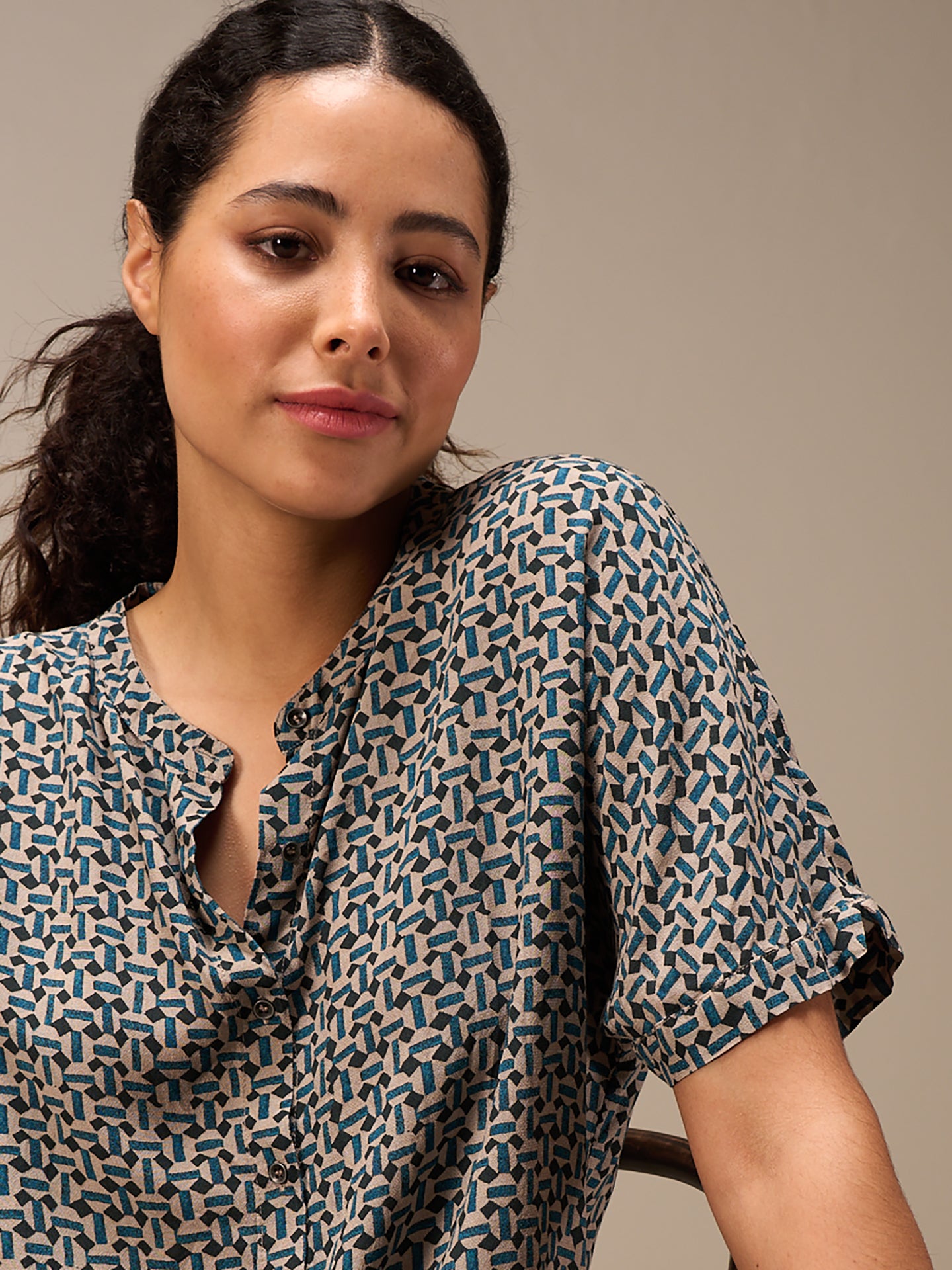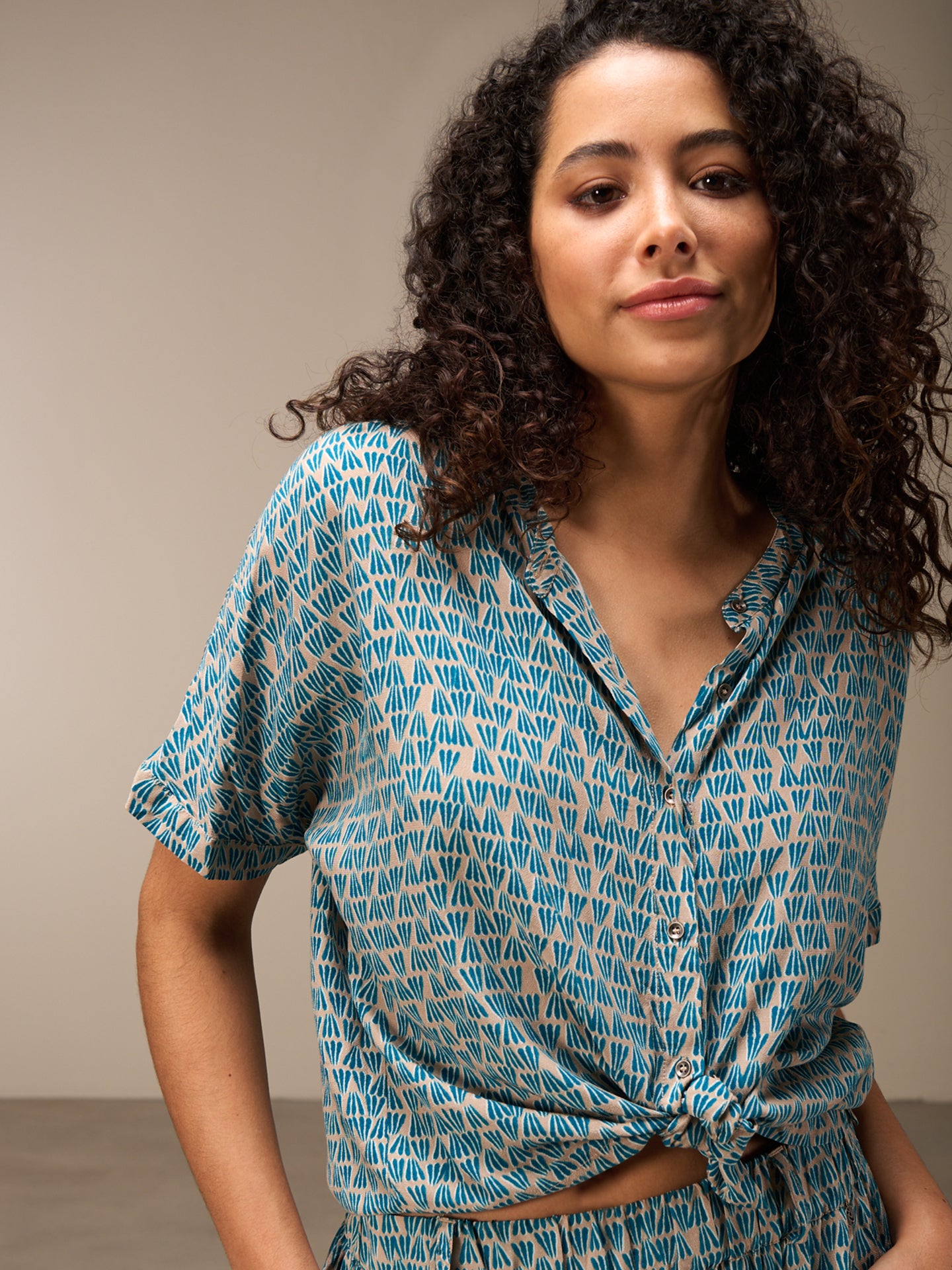 Lässige durchgeknöpfte Kurzarmbluse in verkürzter, kastiger Form und handgezeichnetem Alloverprint.