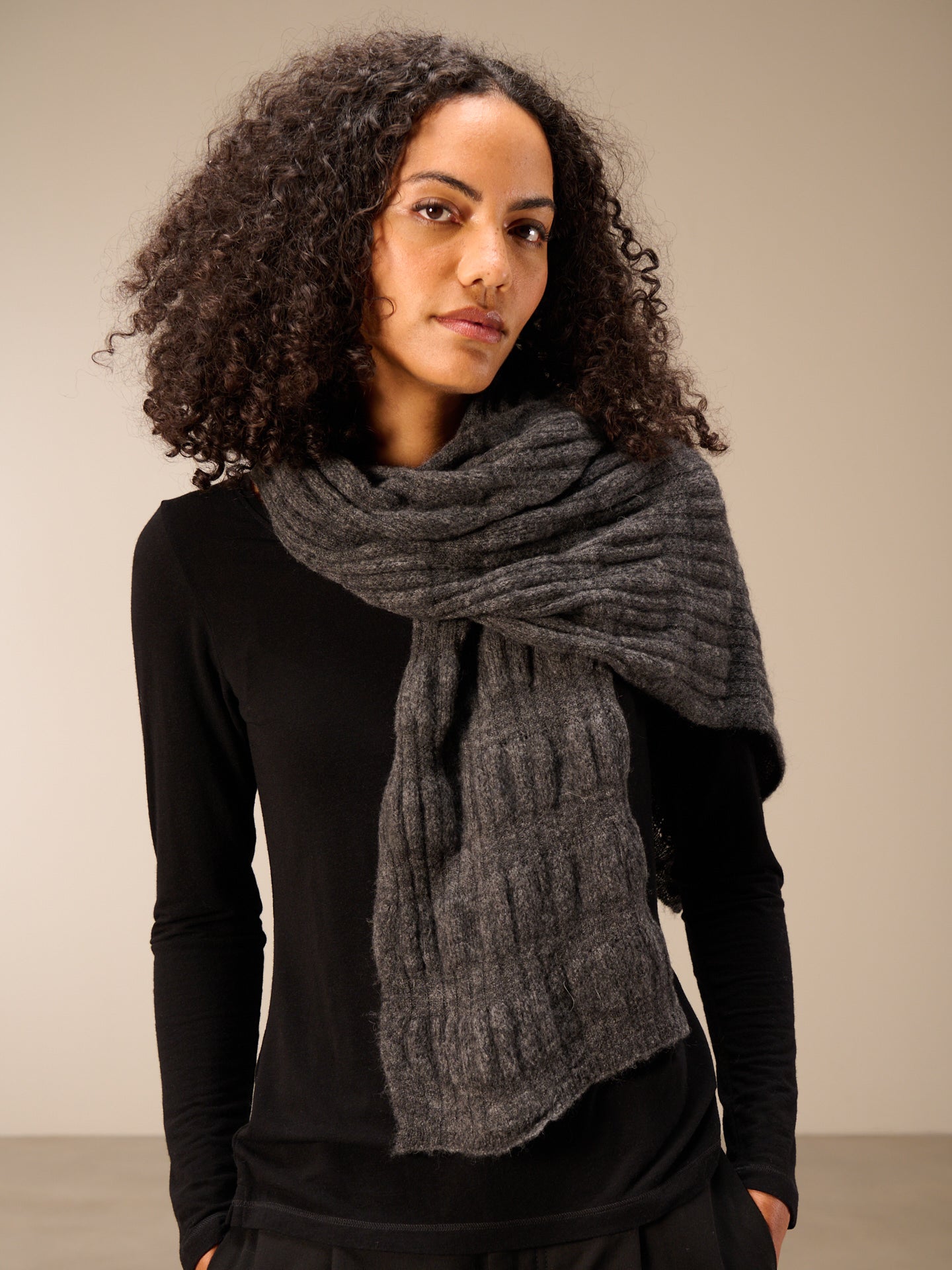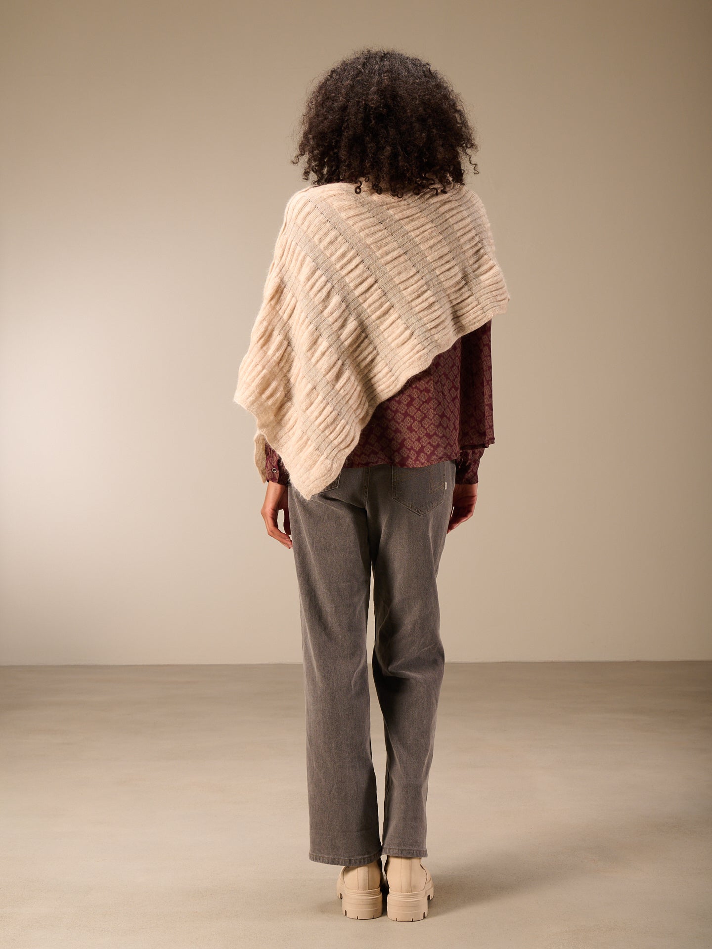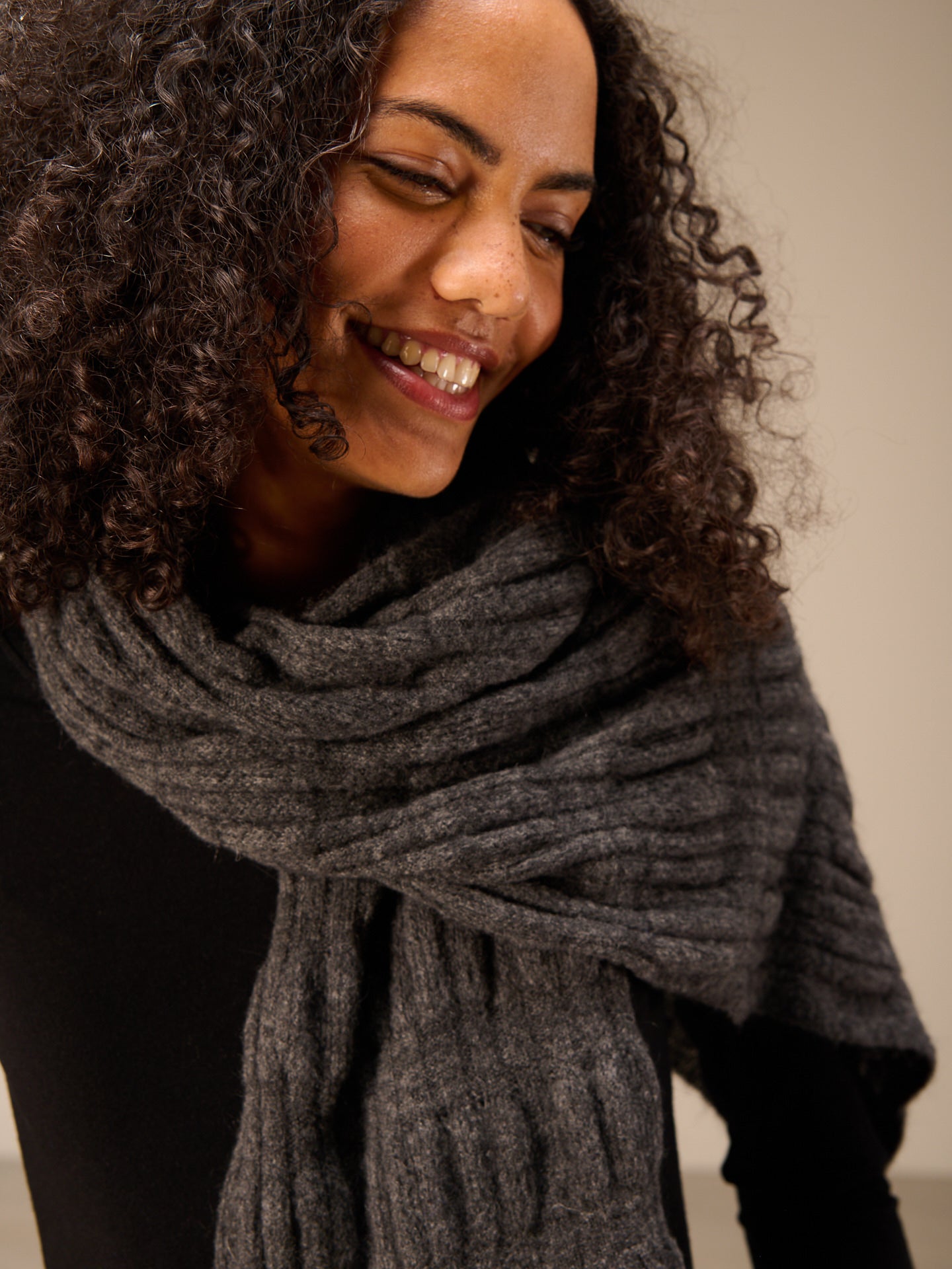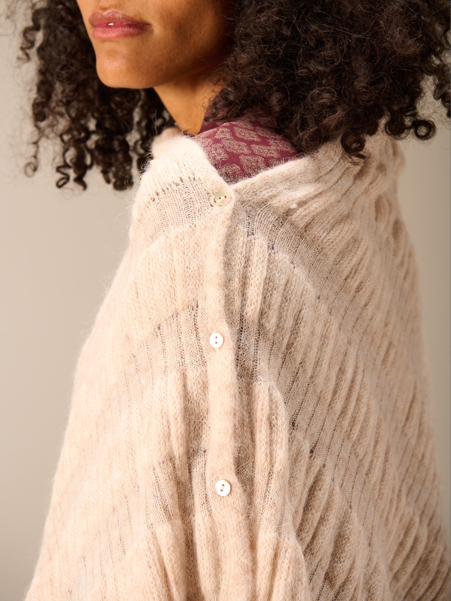 Multifunktionales Strickteil, welches als Schal oder als Cape getragen werden kann. Für die verschiedenen Stylevarianten hat es einen Verschluss mit 3 Perlmutt-Knöpfen. Das Bubble Strickmuster aus haarigem, meliertem Garn macht das Teil zum stylischen Hingucker