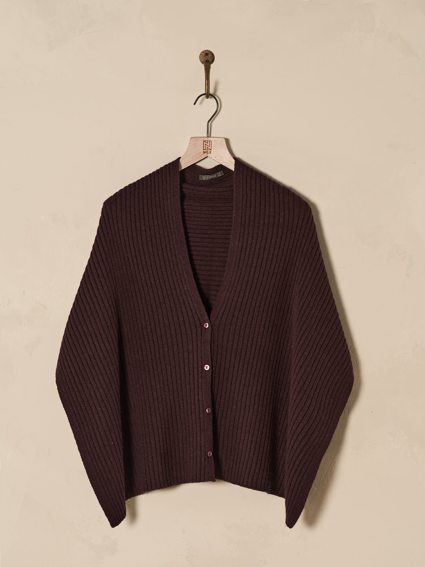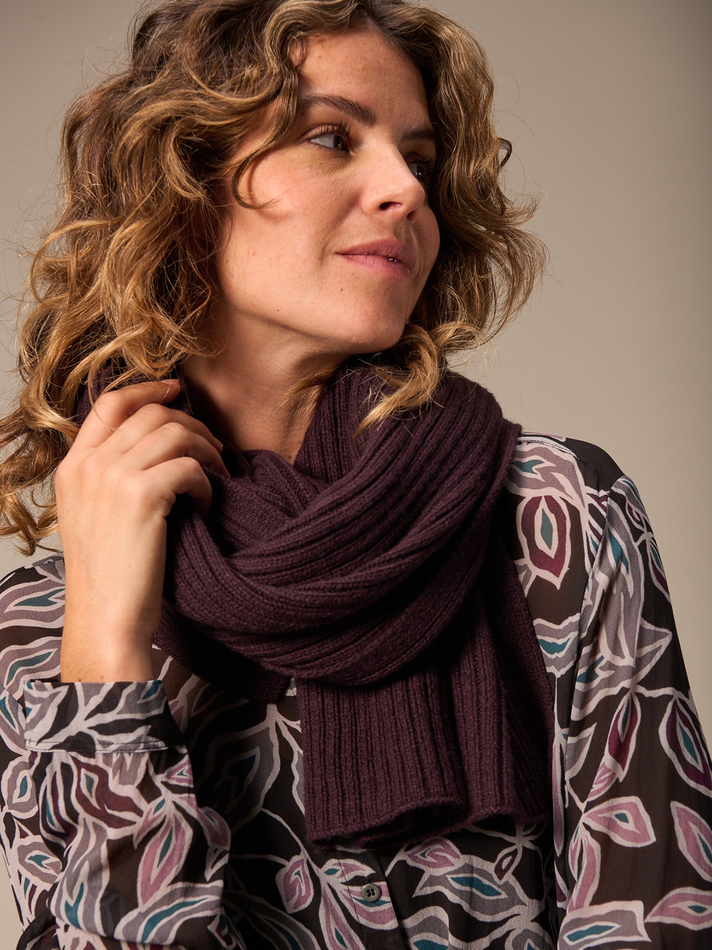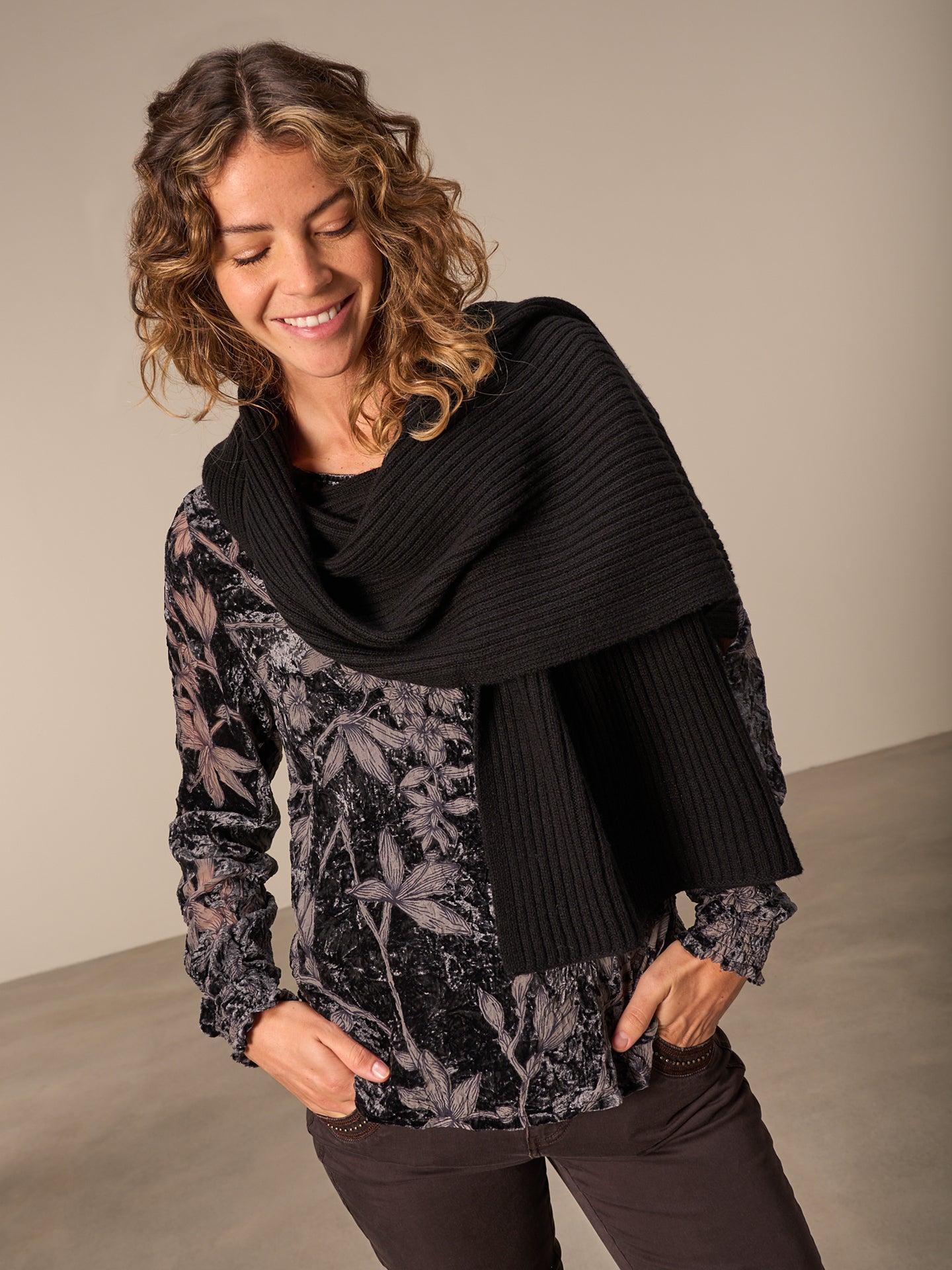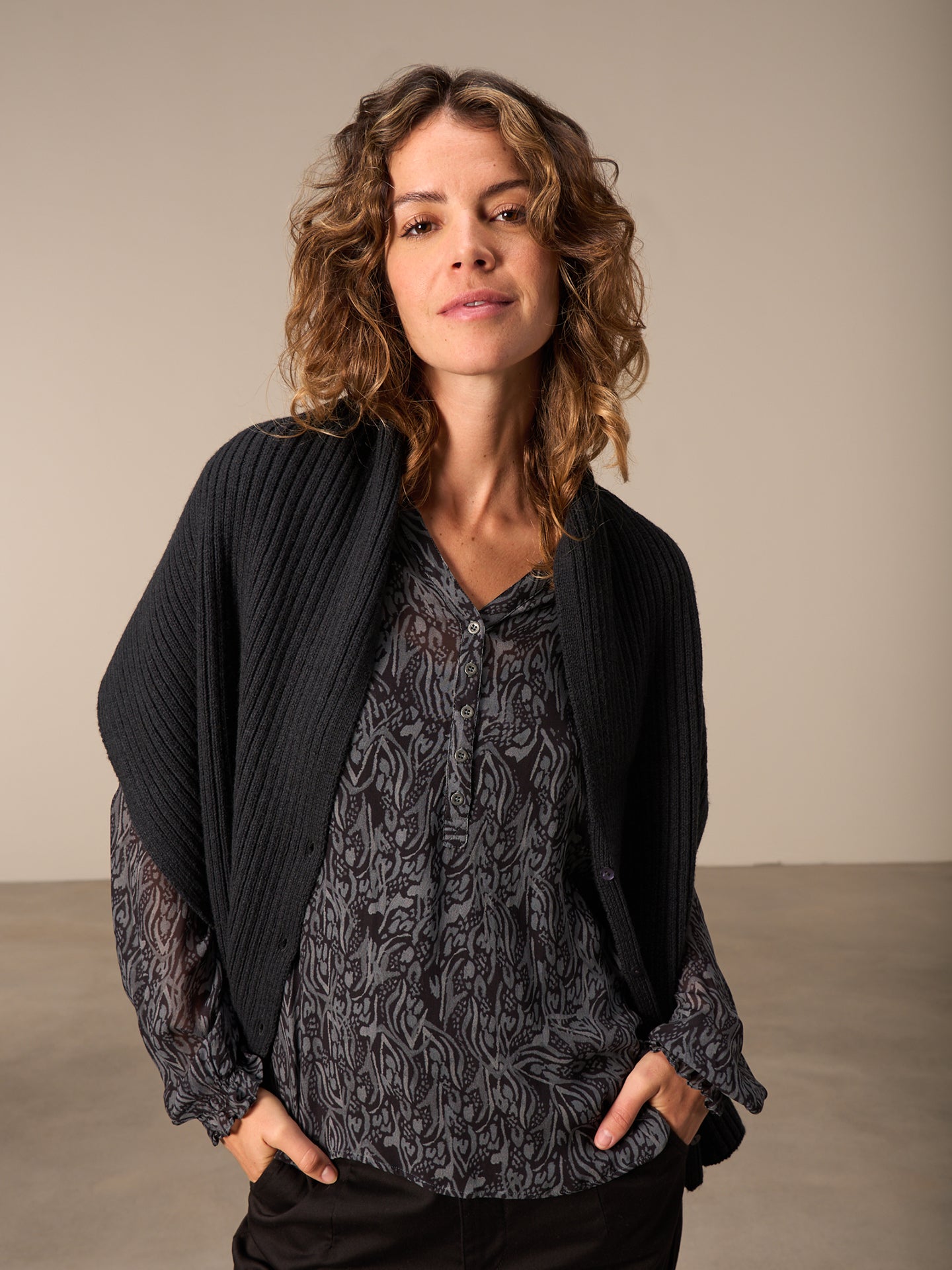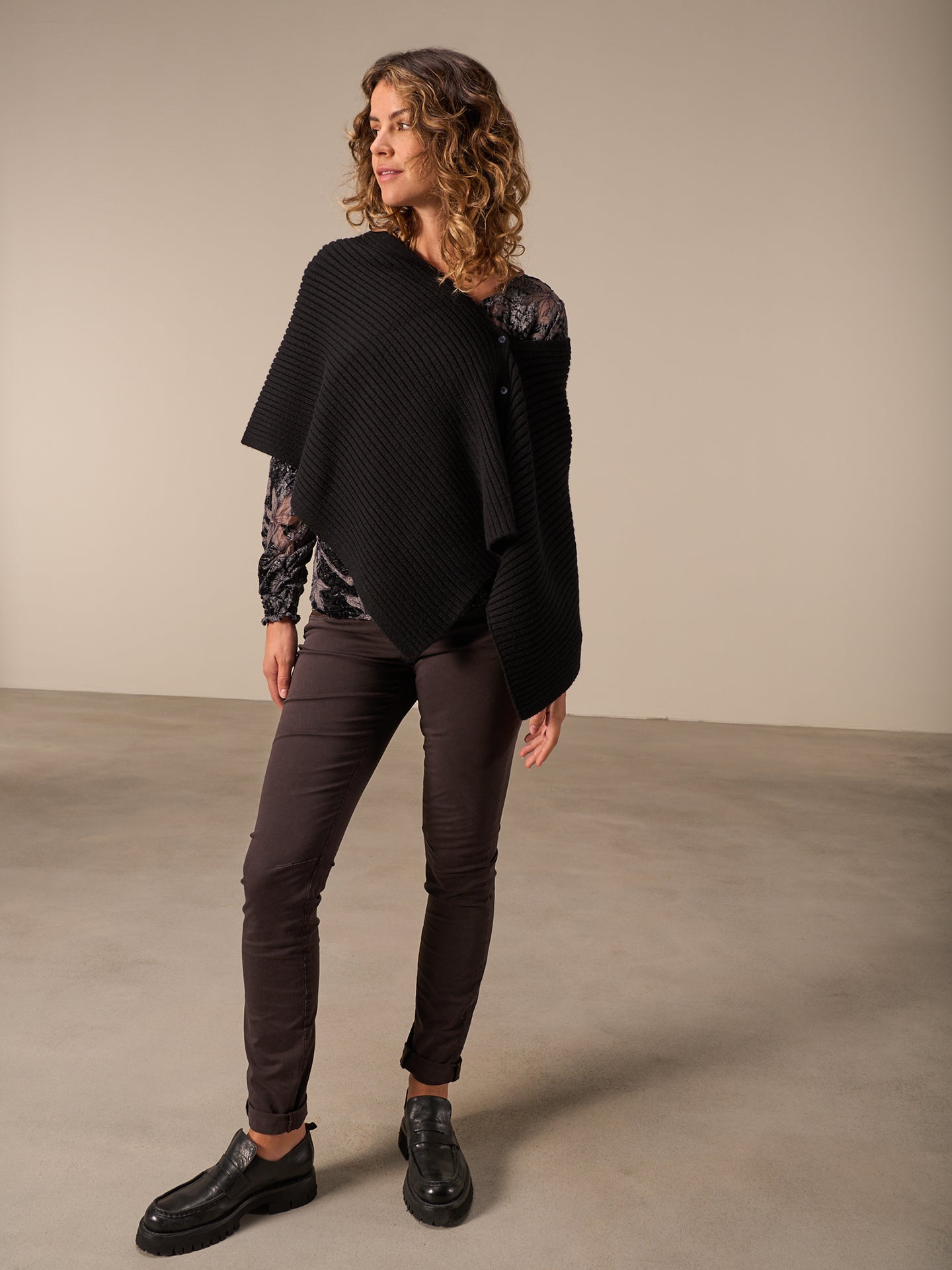 Multifunktionales Strickteil, welches als Schal oder als Cape getragen werden kann. Für die verschiedenen Stylevarianten hat es einen Verschluss mit vier Perlmutt-Knöpfen.
