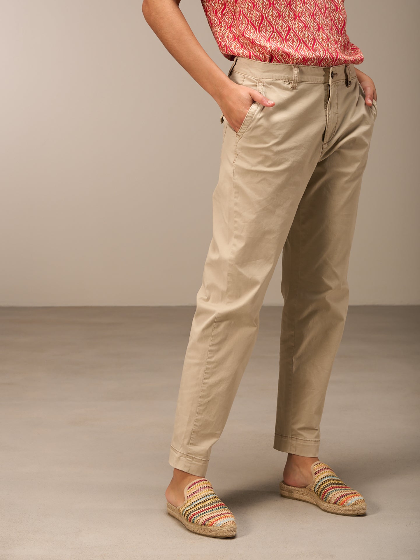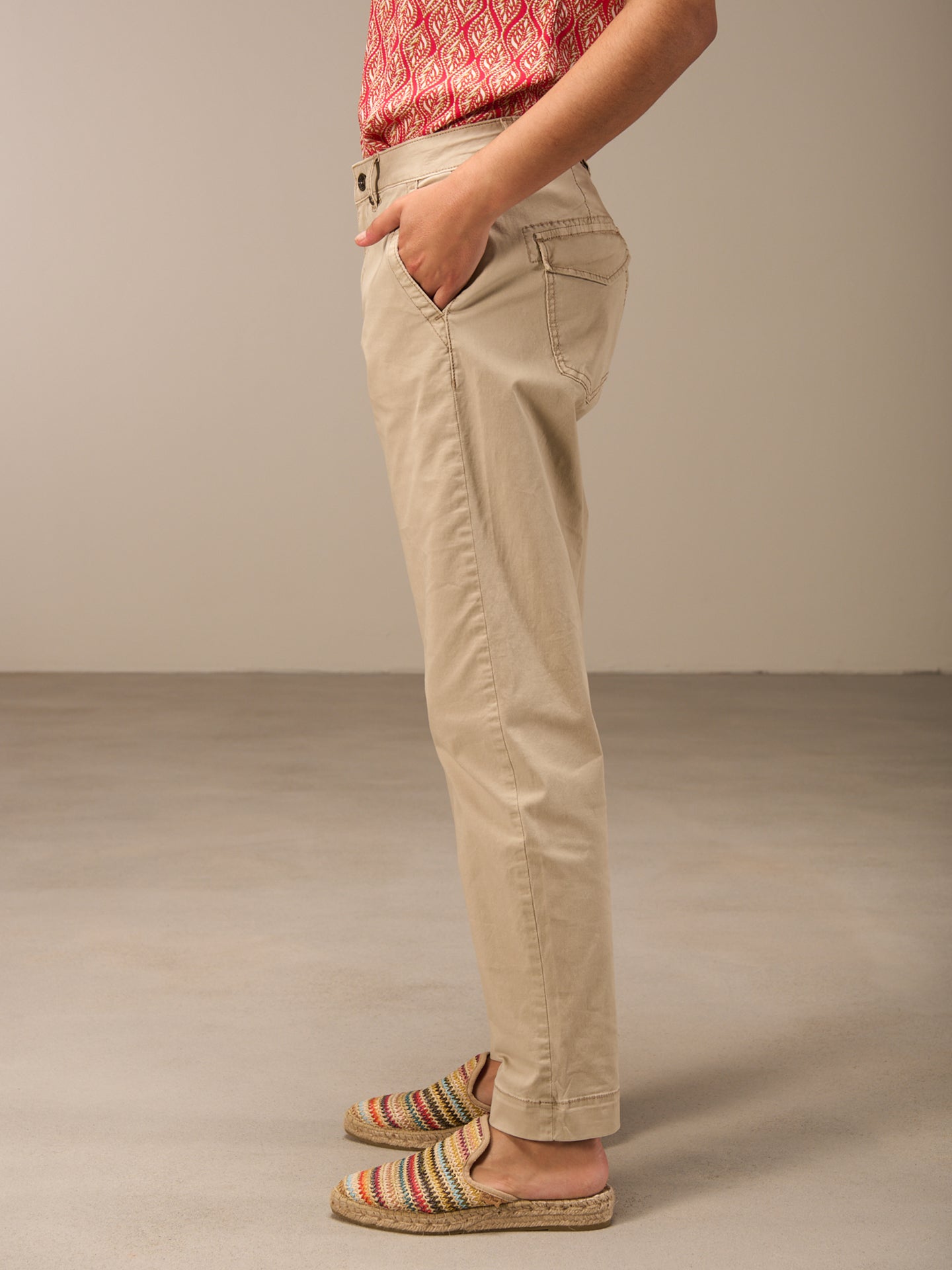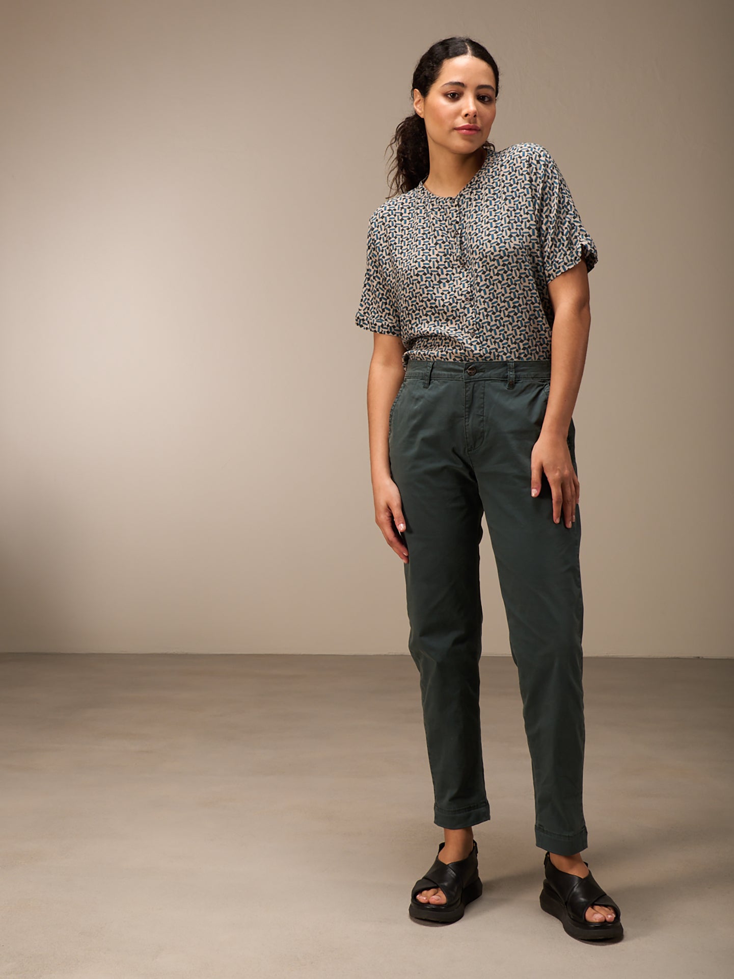 Locker sitzende Hose mit anliegendem Bein, mittelhohem Bund mit Gürtelschlaufen, Reisverschluss und seitlichen Eingrifftaschen und Klappentaschen am Gesäss.