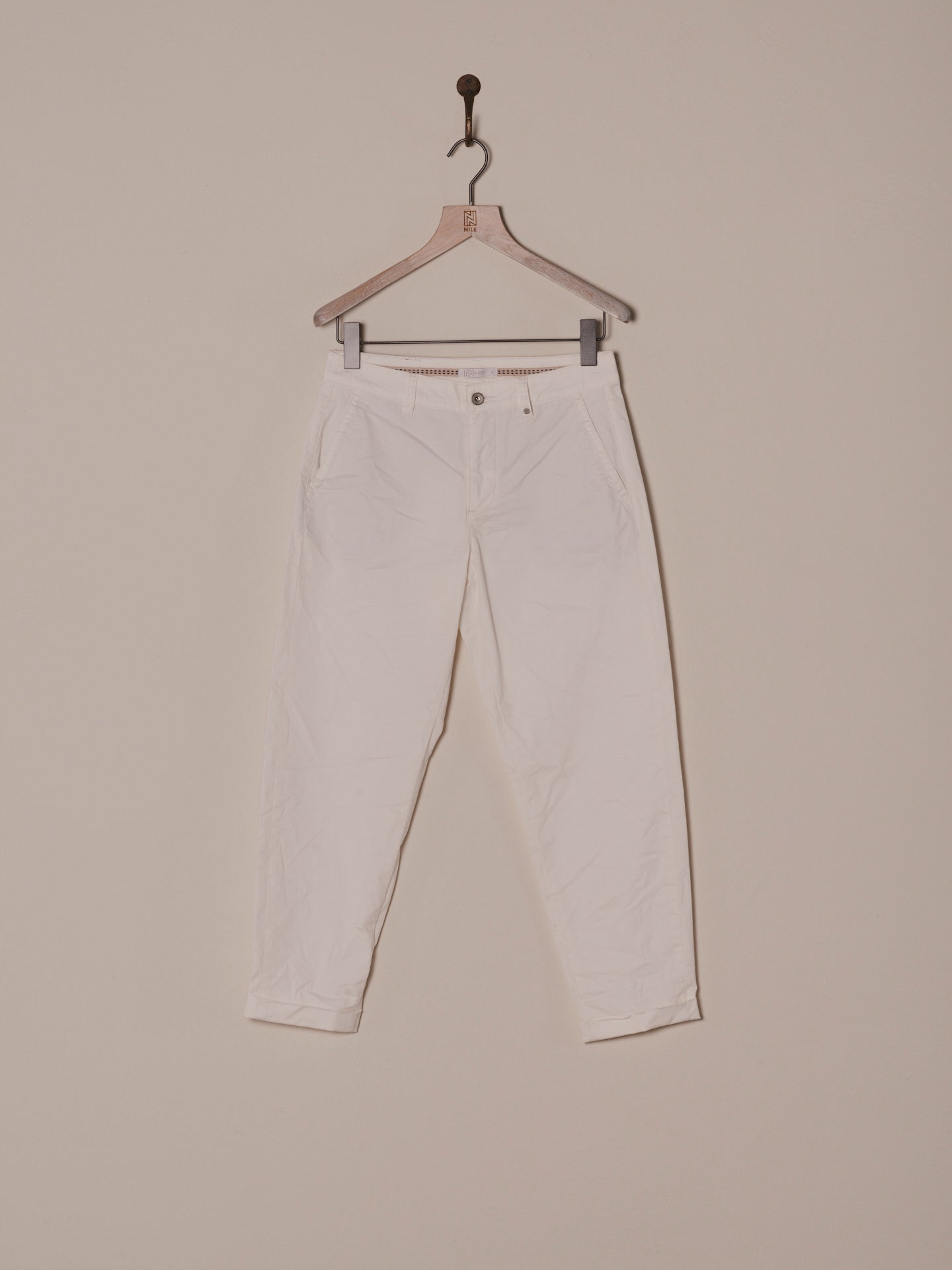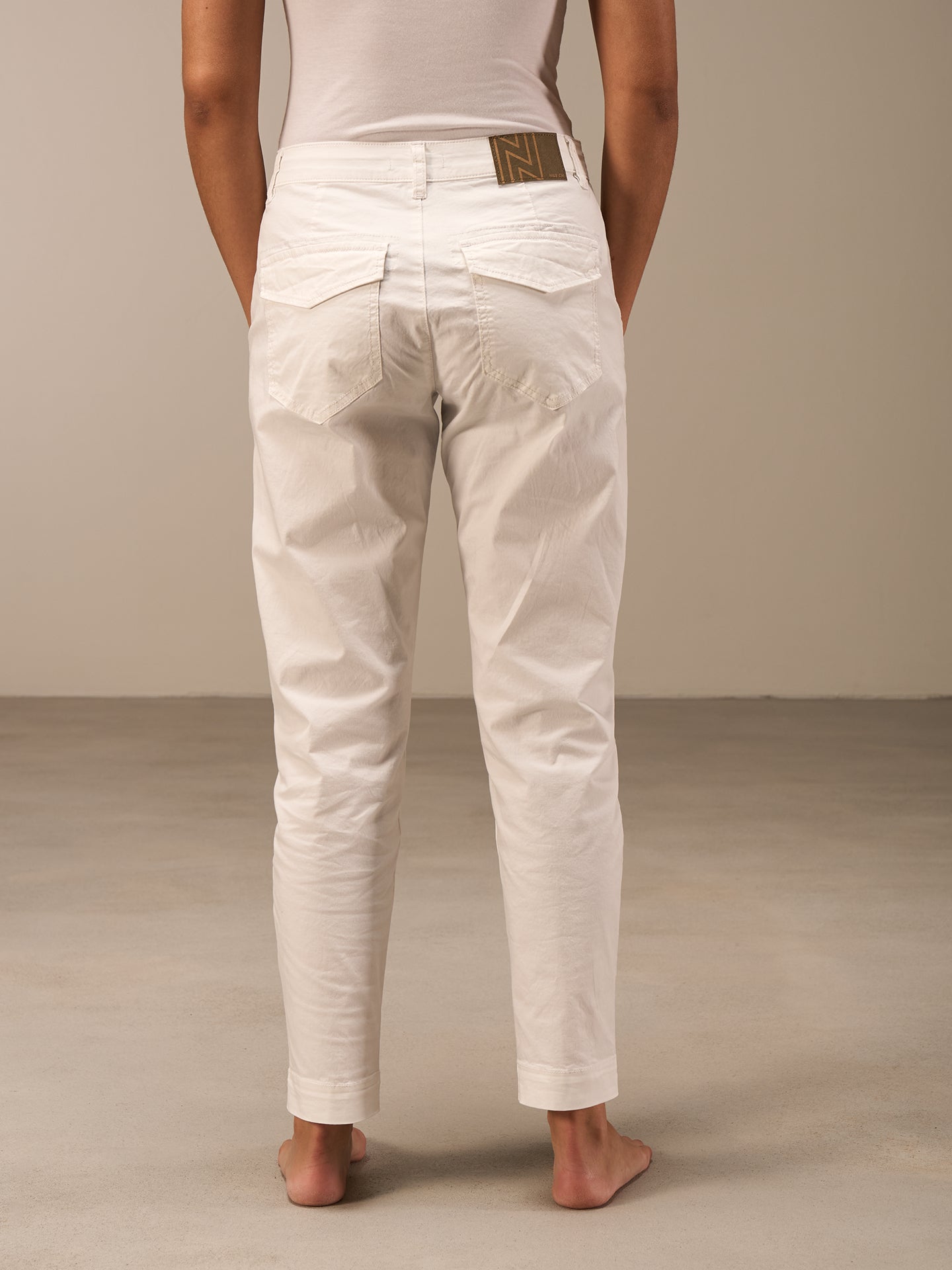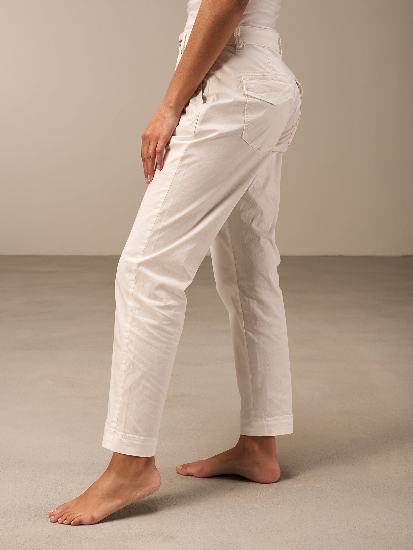 Locker sitzende Hose mit anliegendem Bein, mittelhohem Bund mit Gürtelschlaufen, Reisverschluss und seitlichen Eingrifftaschen und Klappentaschen am Gesäss.