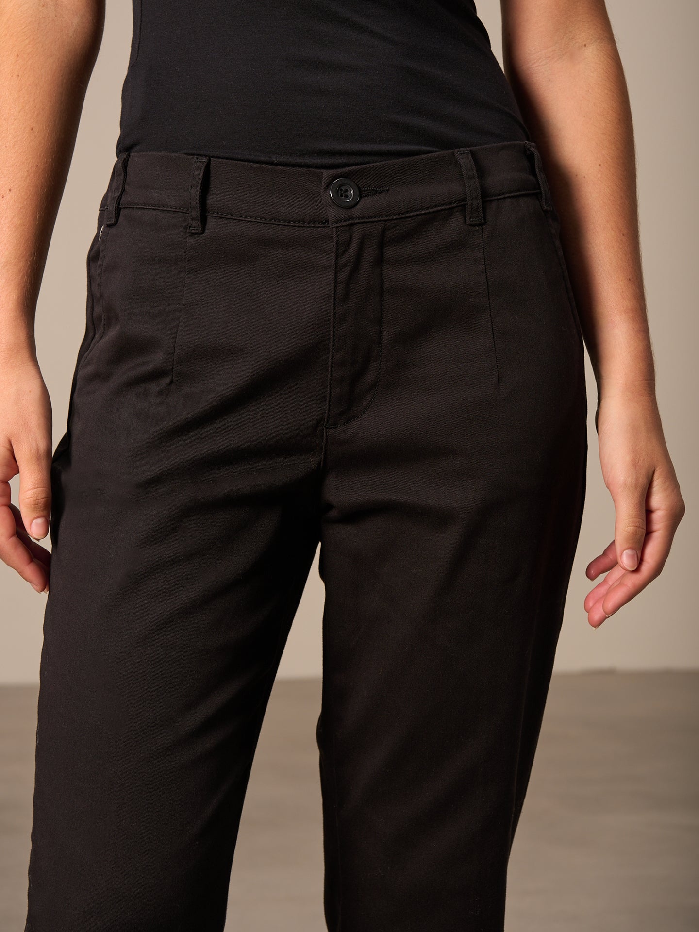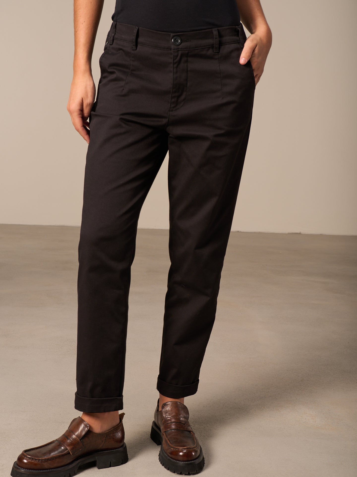 Locker sitzende Hose in zeitlosem Design mit schmalem Bein, mittelhohem Bund, Gurtschlaufen, Eingrifftaschen vorne und Fake Leistentaschen hinten. Aus elastischem Stoff mit dezentem Glanz.