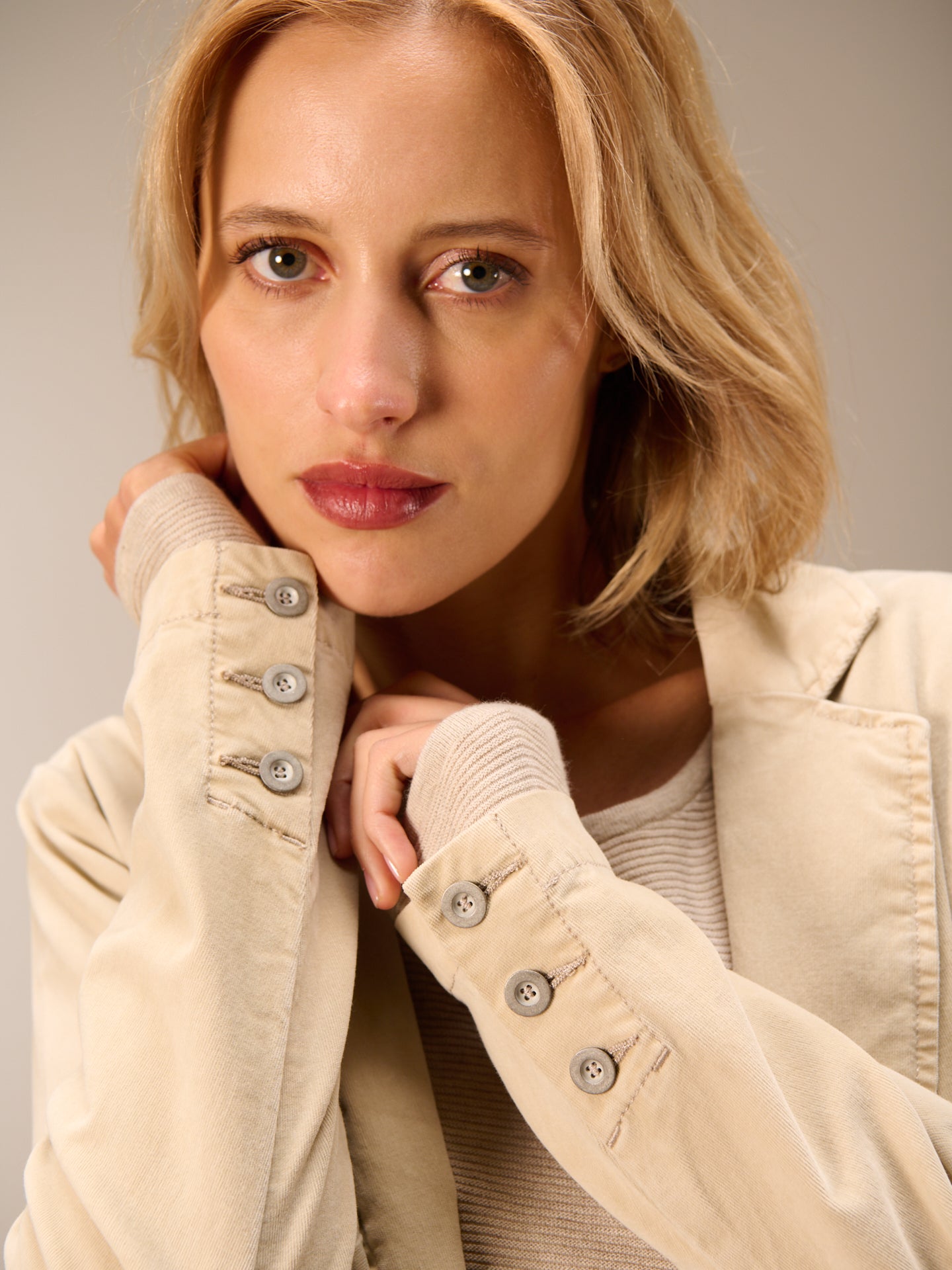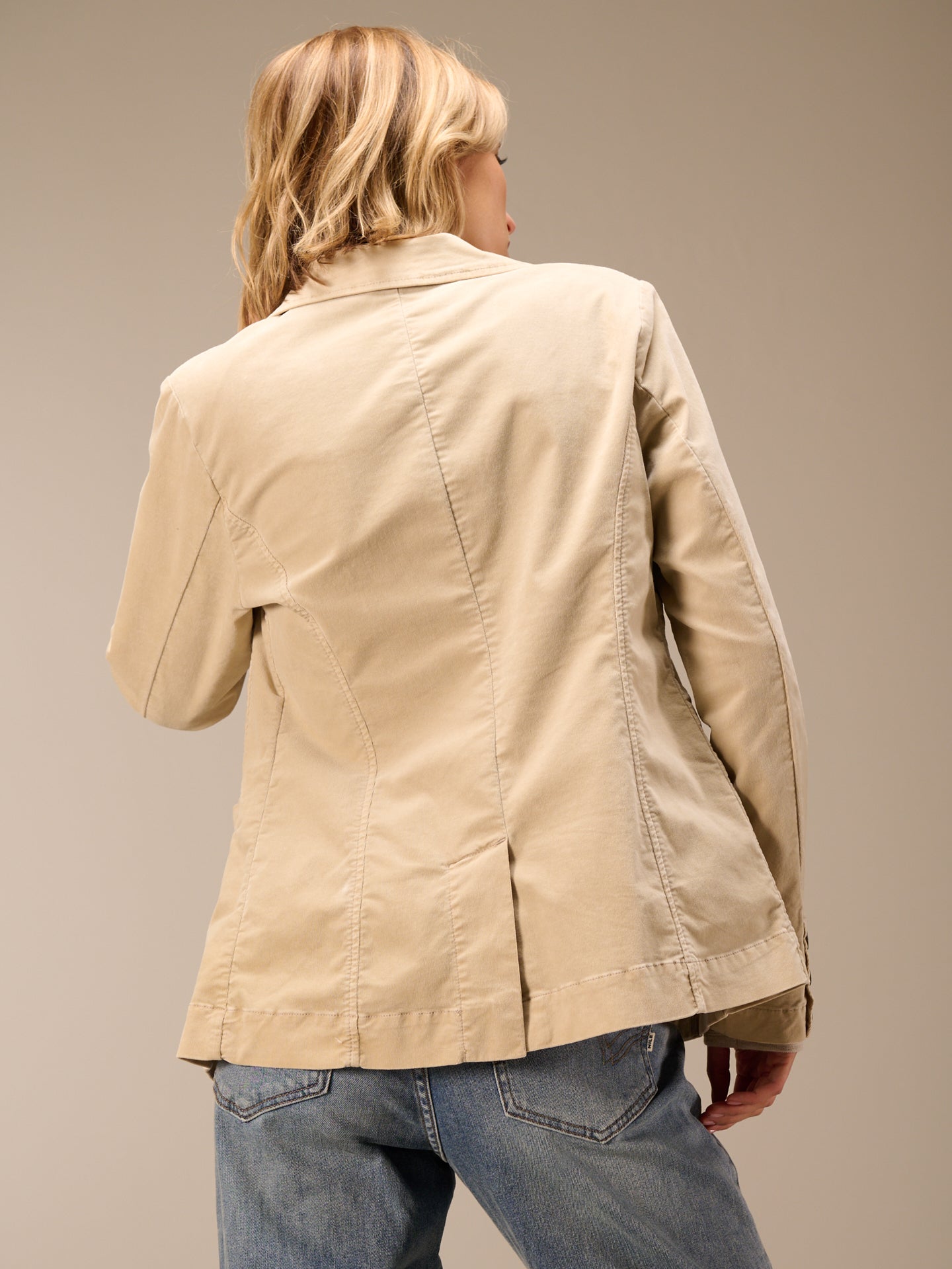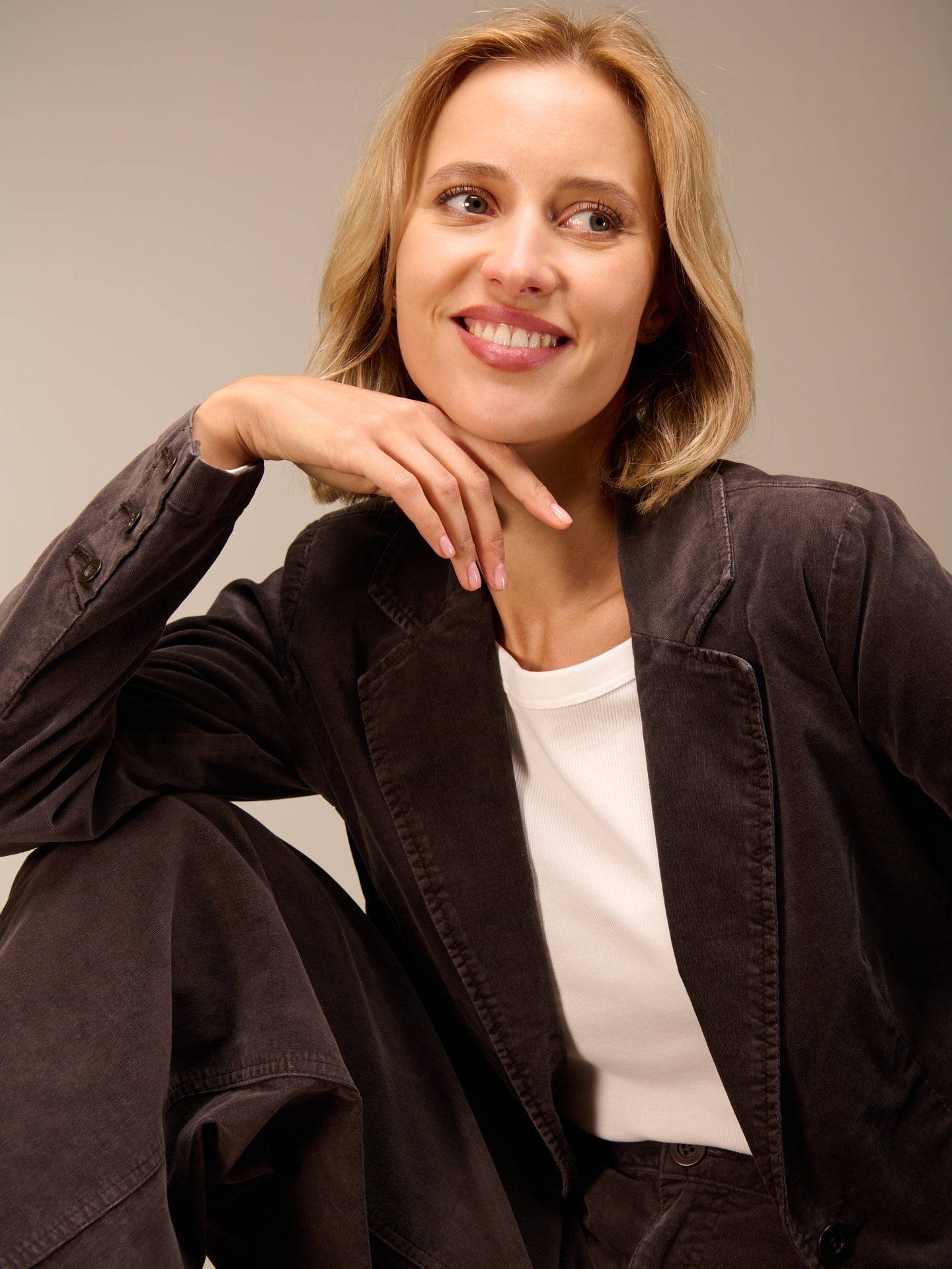 Leicht oversized geschnittener Blazer mit Reverskragen, Rückenschlitz, formenden Abnähern und Leistentaschen. Der Blazer ist stückgefärbt, was zu Unregelmässigkeiten in der Farbe führt, den Ausbleicheffekt verstärkt und das Stück einzigartig macht.