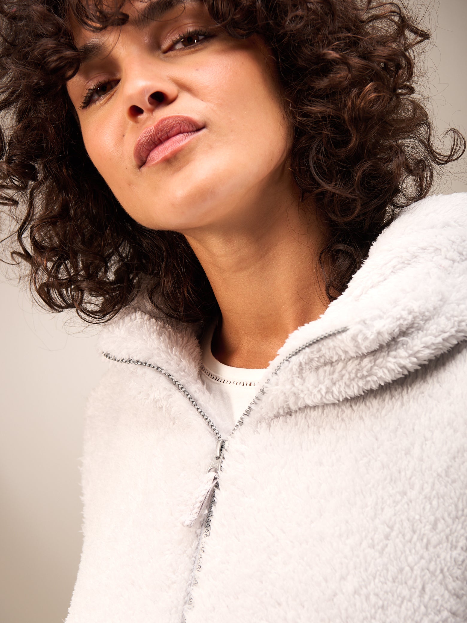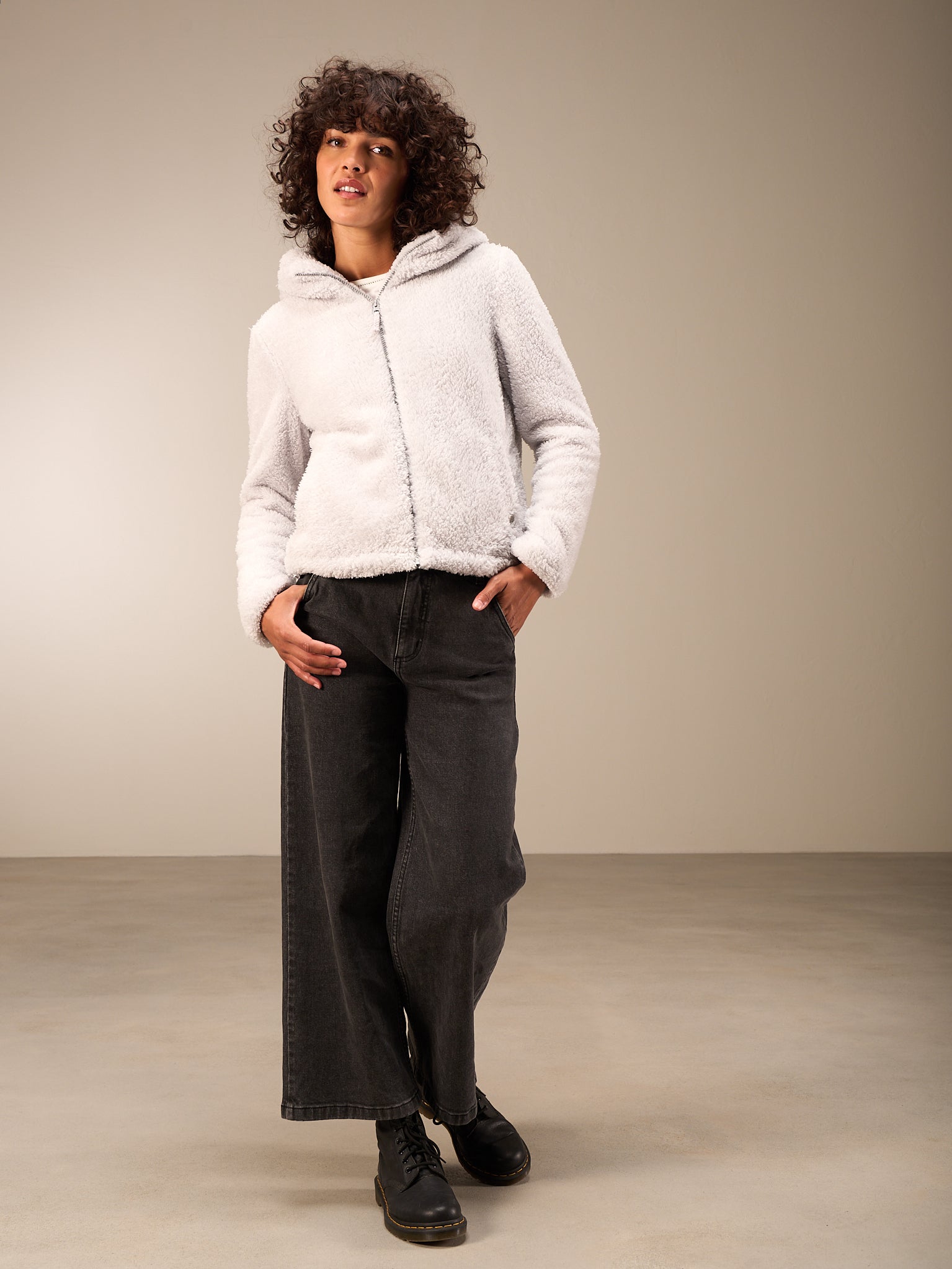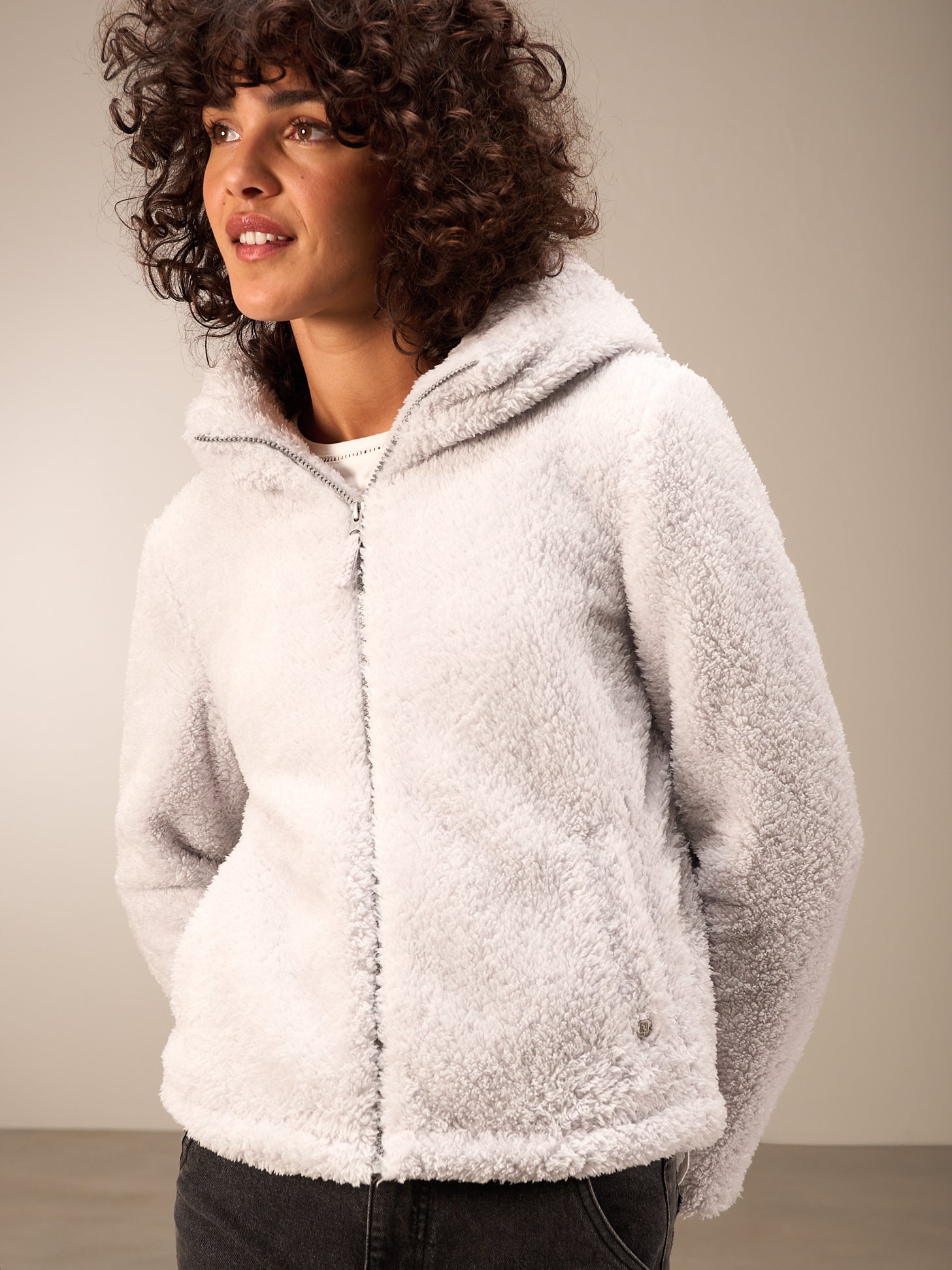 Superflauschige Jacke in kurzer, weiter Passform mit kuscheligem Kragen, dezenten Eingriffstaschen und leichtem Reissverschluss. Elastischer Abschluss am Ärmel.