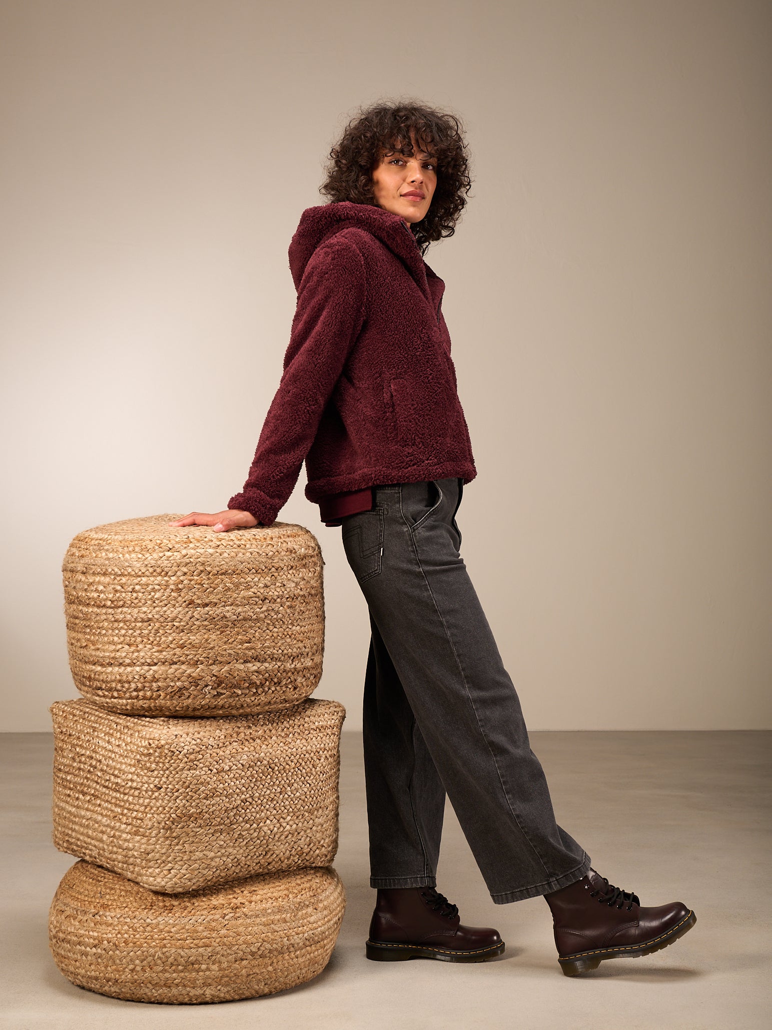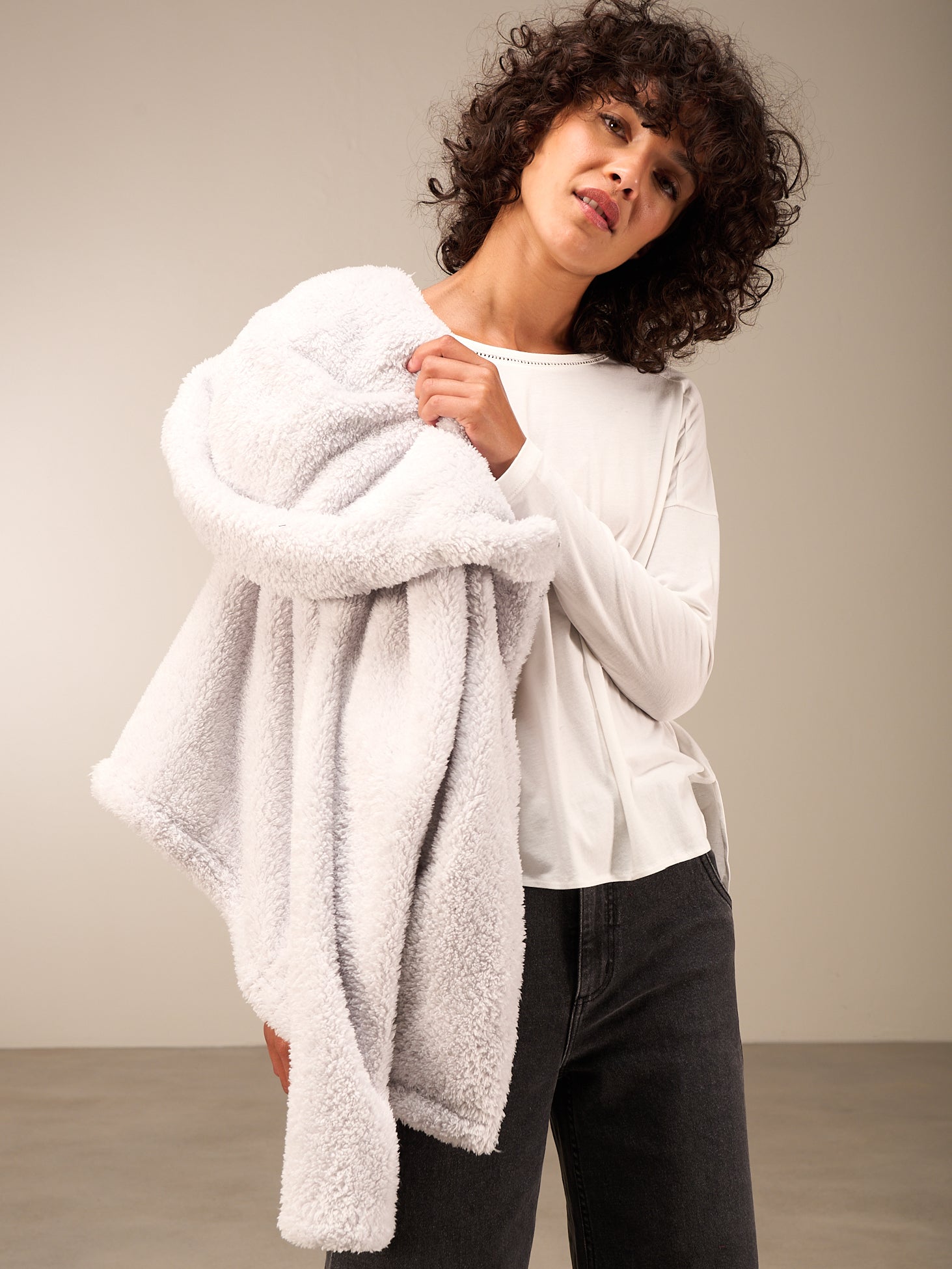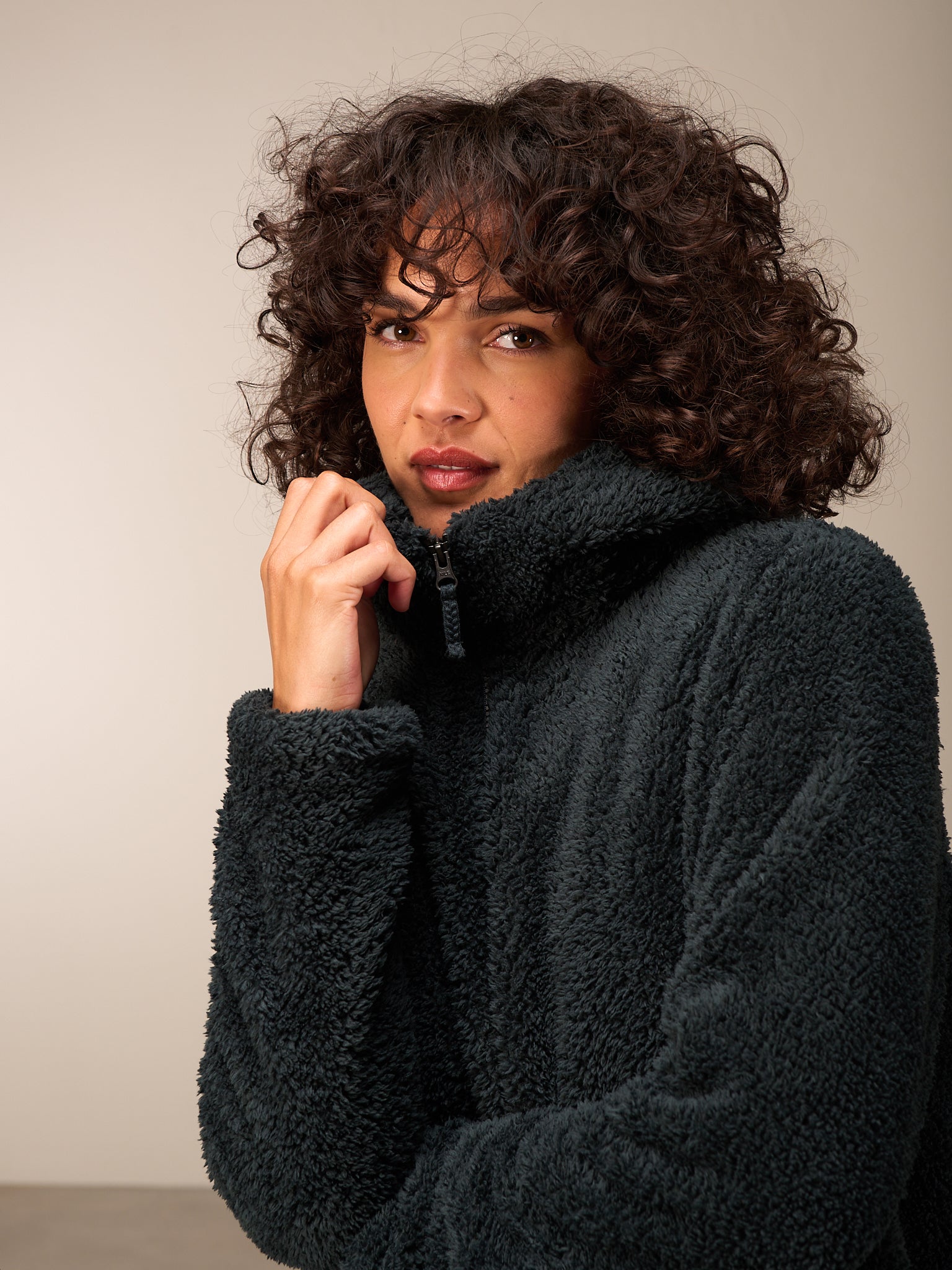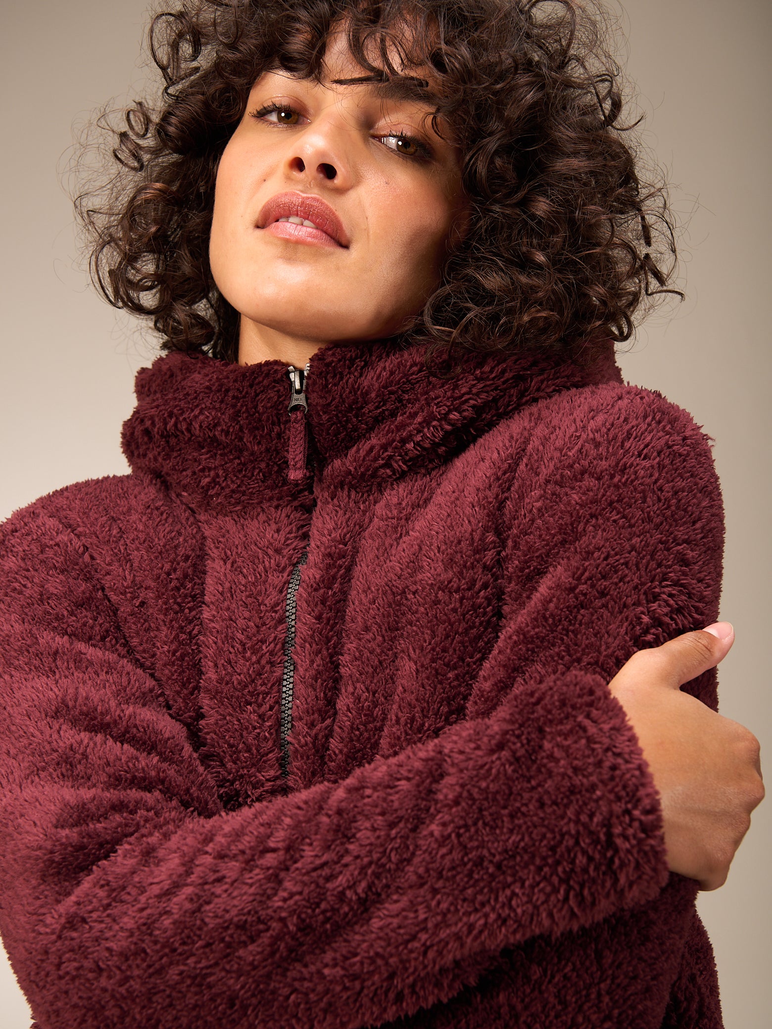 Superflauschige Jacke in kurzer, weiter Passform mit kuscheligem Kragen, dezenten Eingriffstaschen und leichtem Reissverschluss. Elastischer Abschluss am Ärmel.