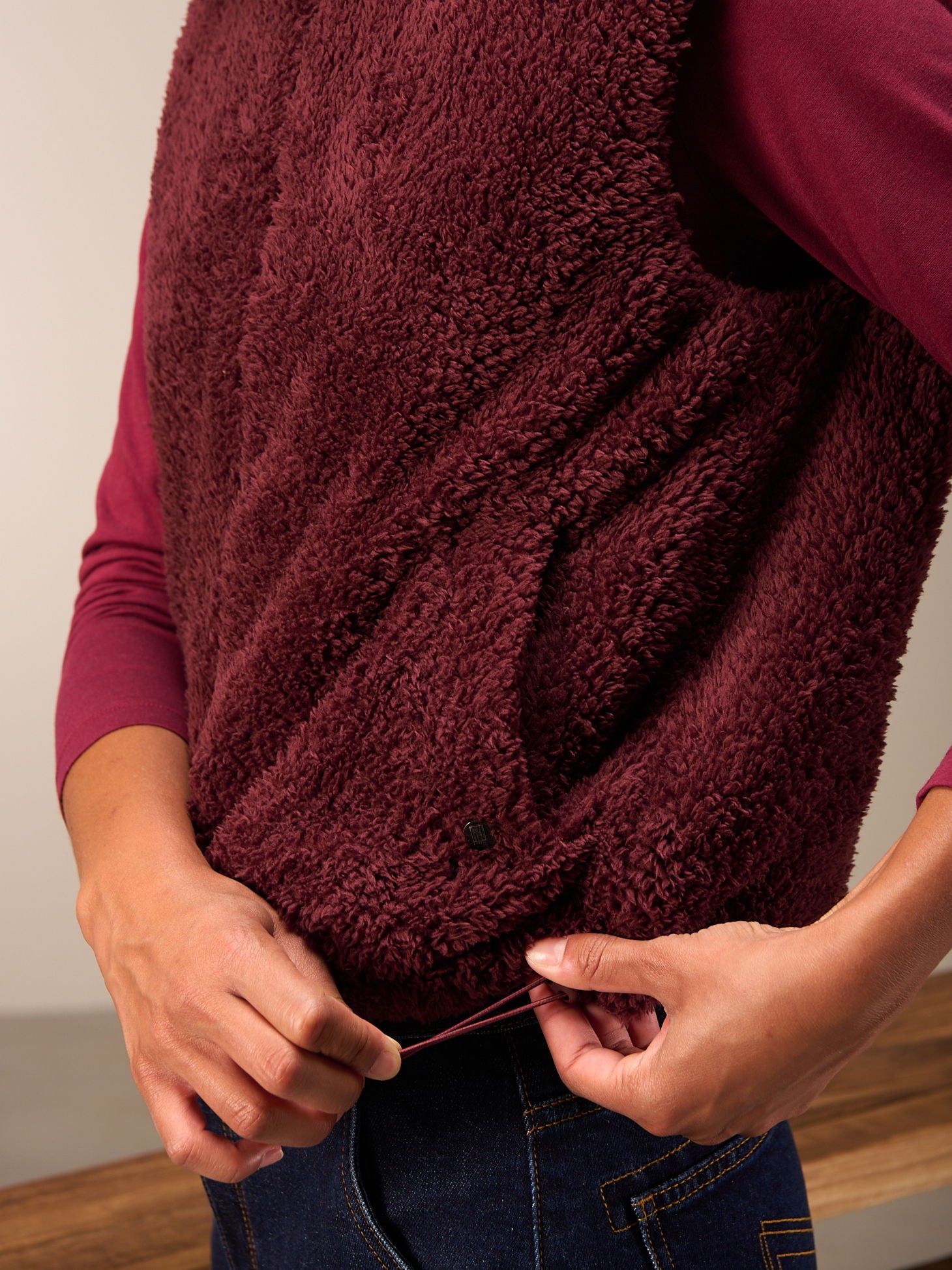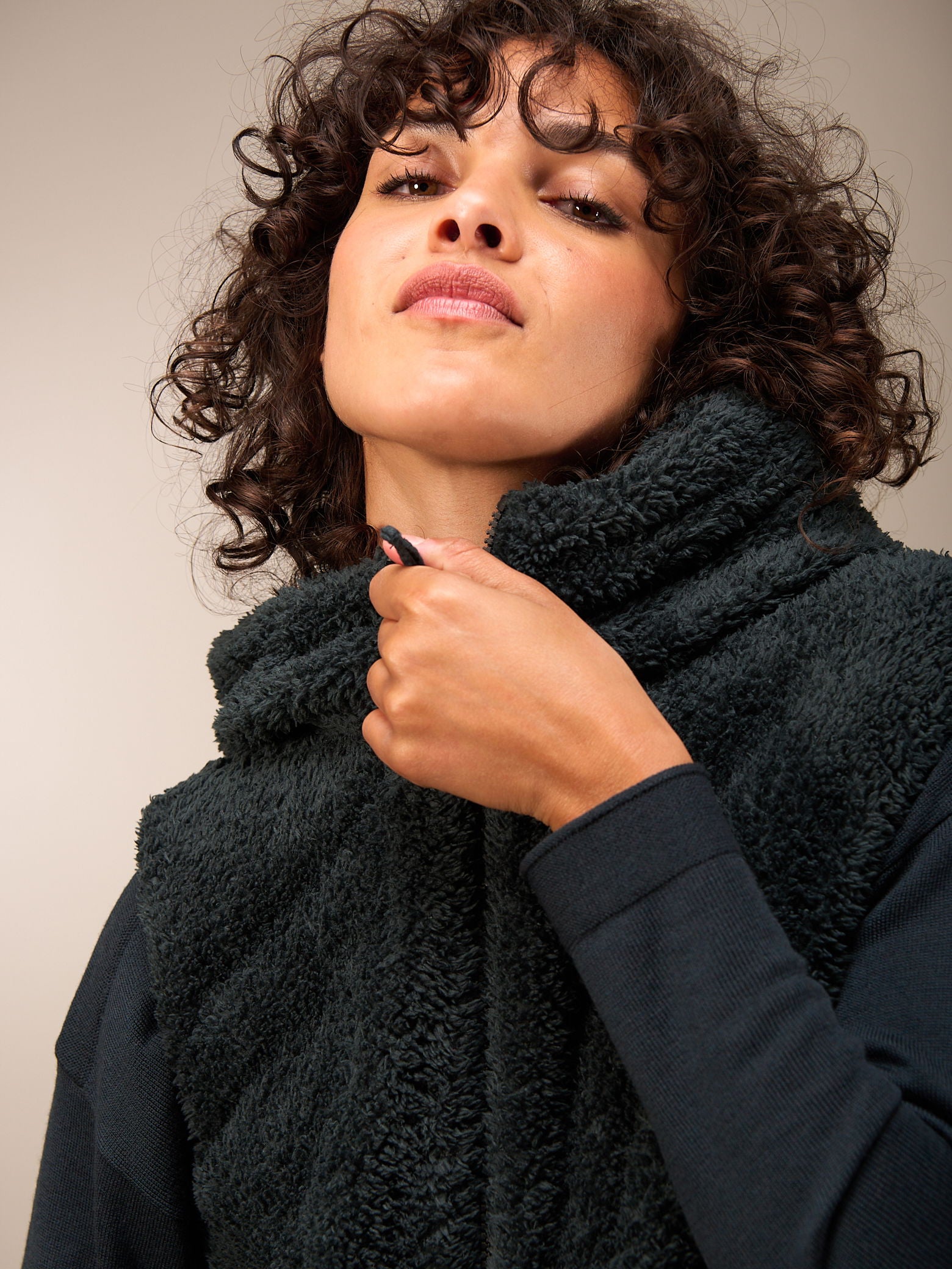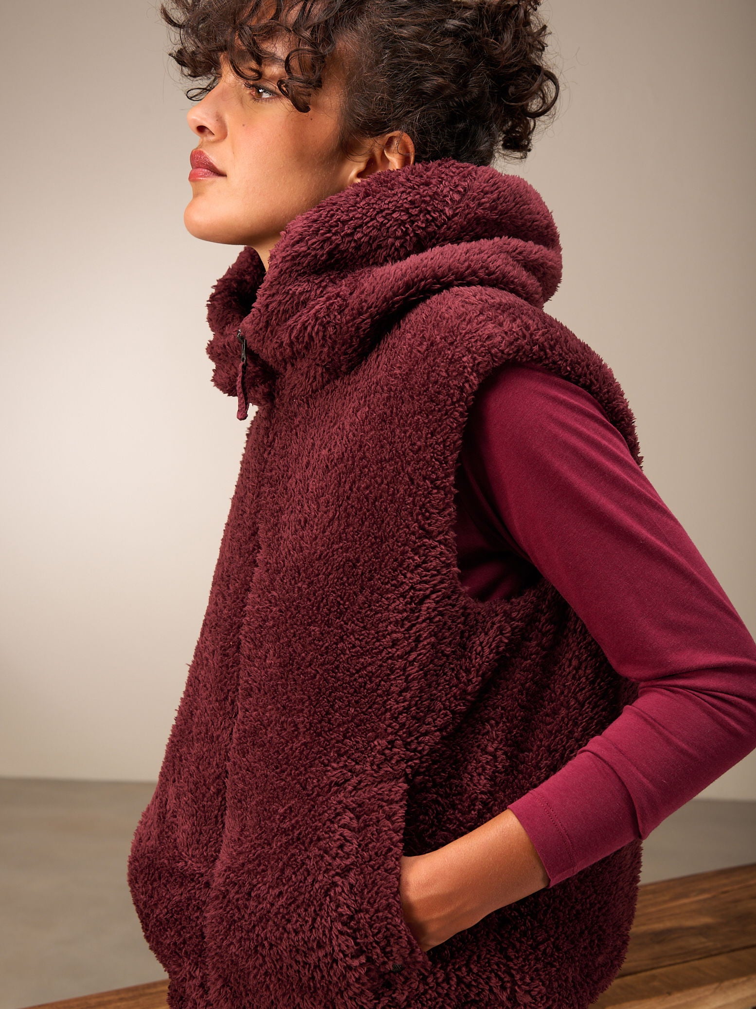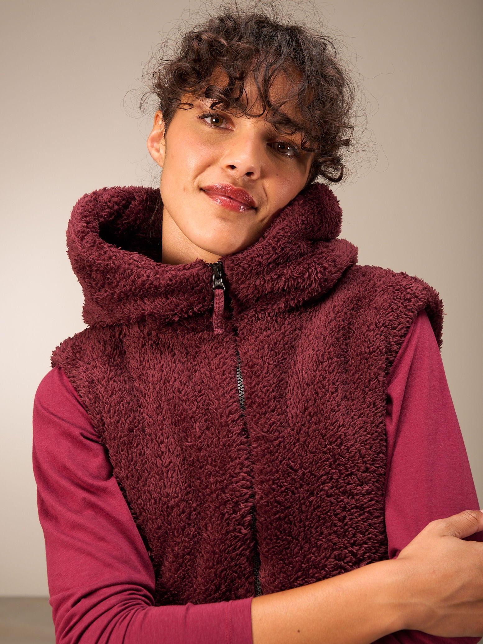 Superflauschige Veste in kurzer, weiter Passform mit kuscheligem Kragen, dezenten Eingriffstaschen und leichtem Reissverschluss. Ein perfekter Kombipartner für drinnen und draussen.