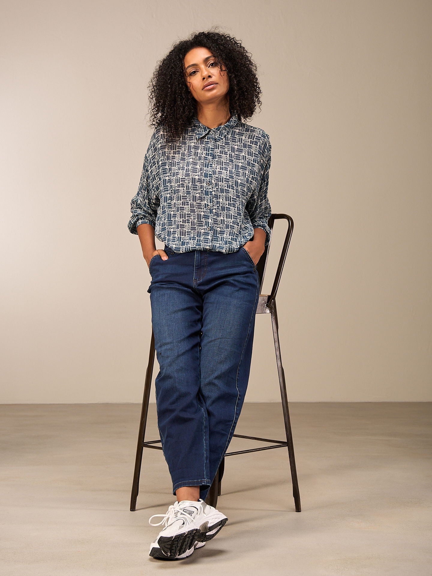 Durchgeknöpfte Hemdbluse in gerade geschnittener Passform und überschnittenen Schultern. Die langen Ärmel sind mit einem Knopf an der Manschette versehen. Der passende handgezeichnete Alloverprint runden den Look der Bluse ab. Aus 100% Eco Viskose, die aus nachhaltiger Holzwirtschaft gewonnen wird.