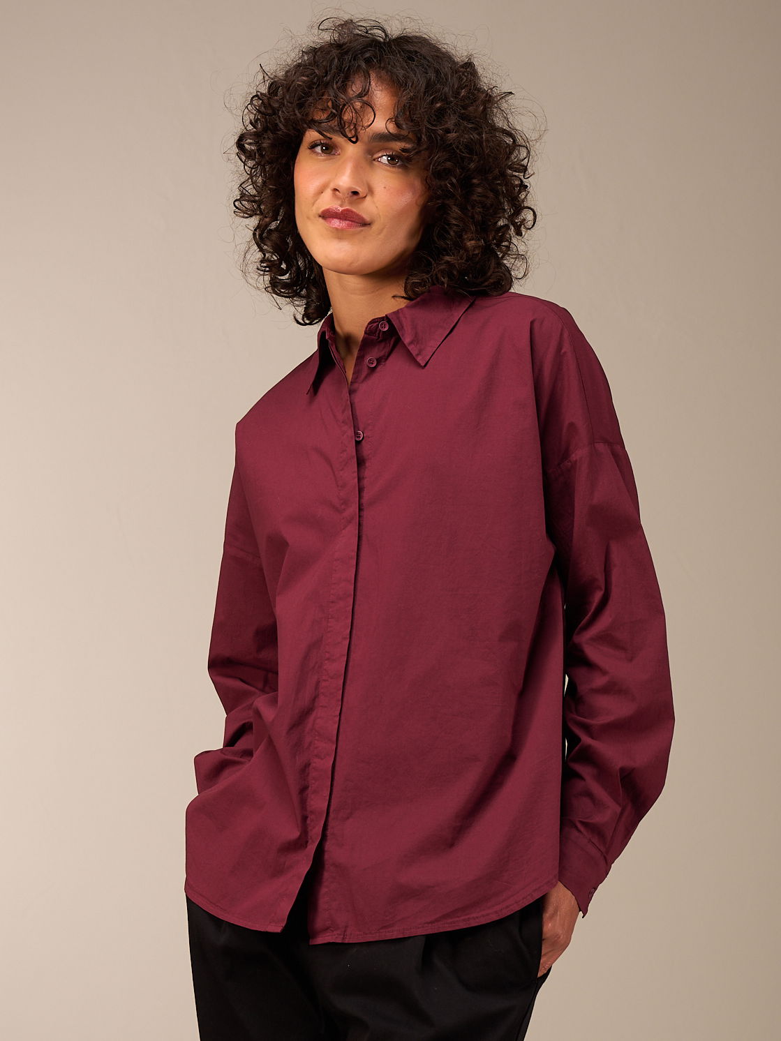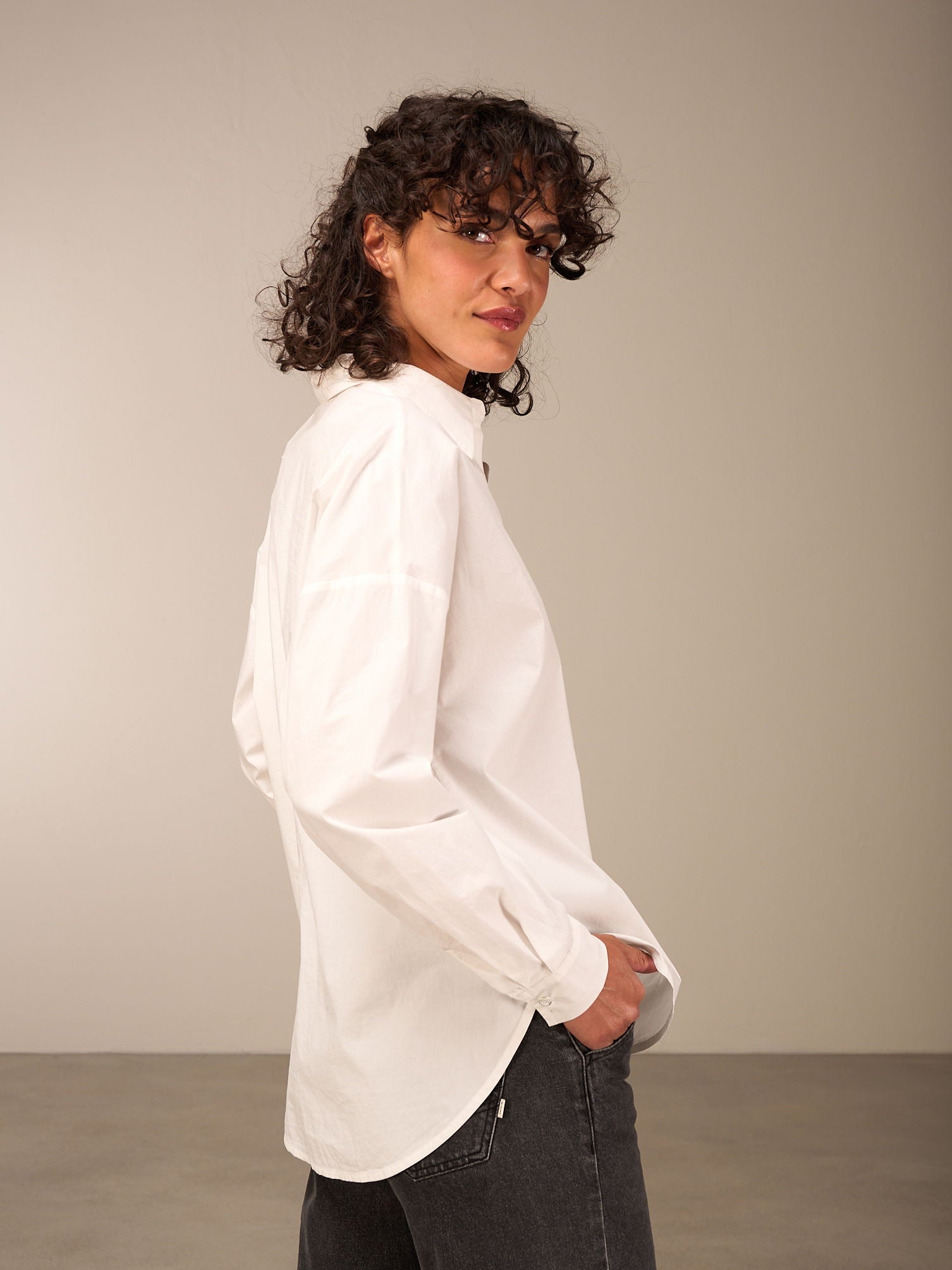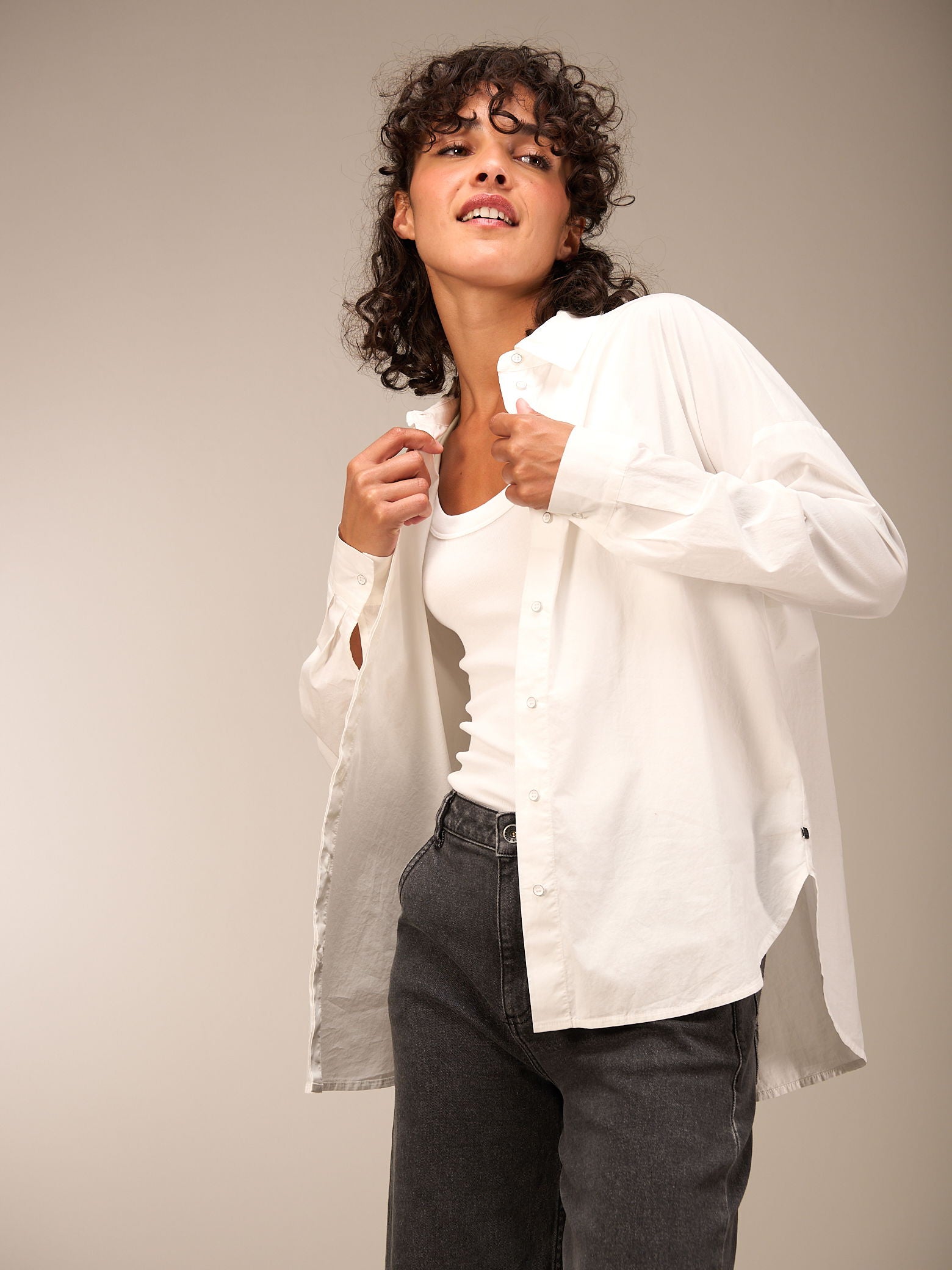 Stylische oversize geschnittene Hemdbluse mit einer versteckten Knopfleiste und einem etwas längeren Rückenteil. Die langen Ärmel sind mit Schlitz und Knopf an der Manschette versehen.