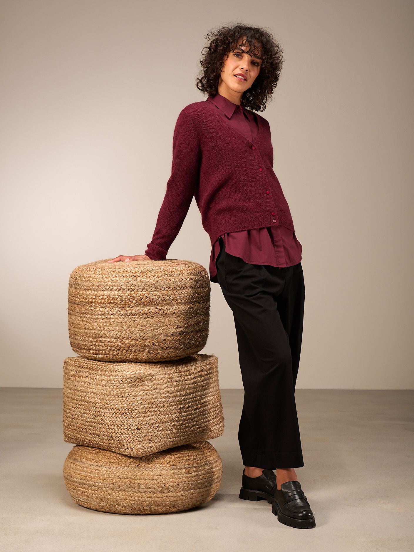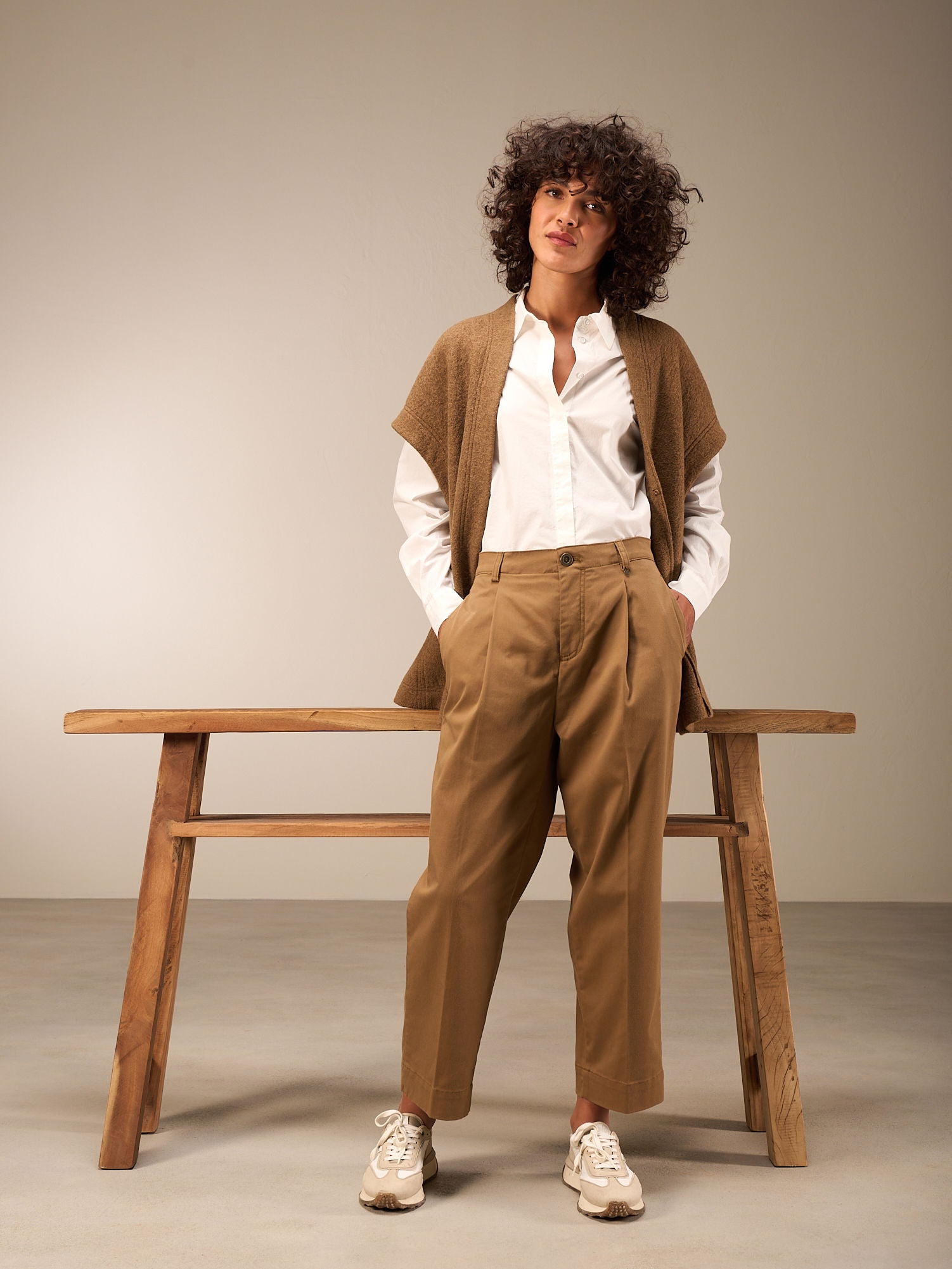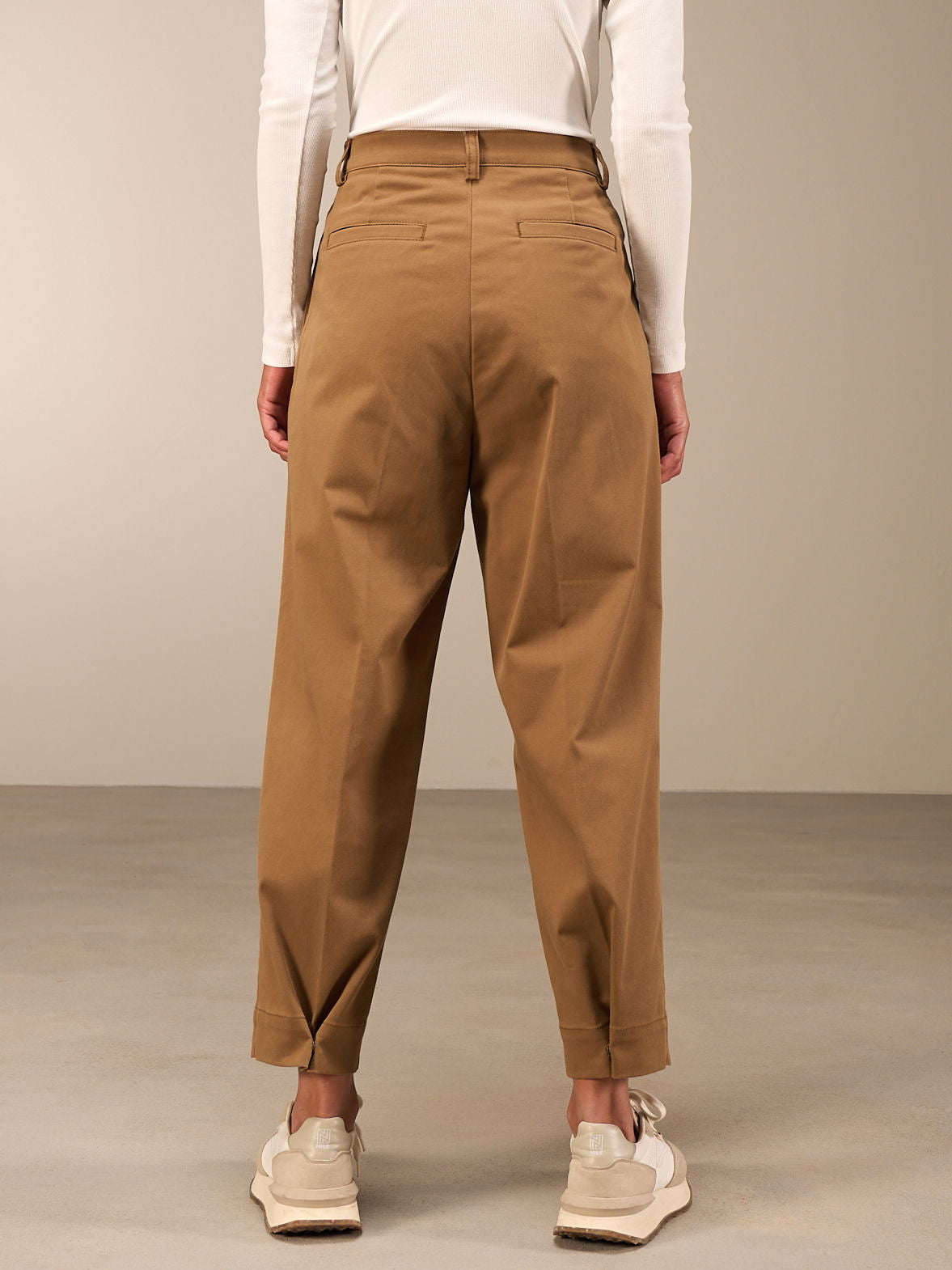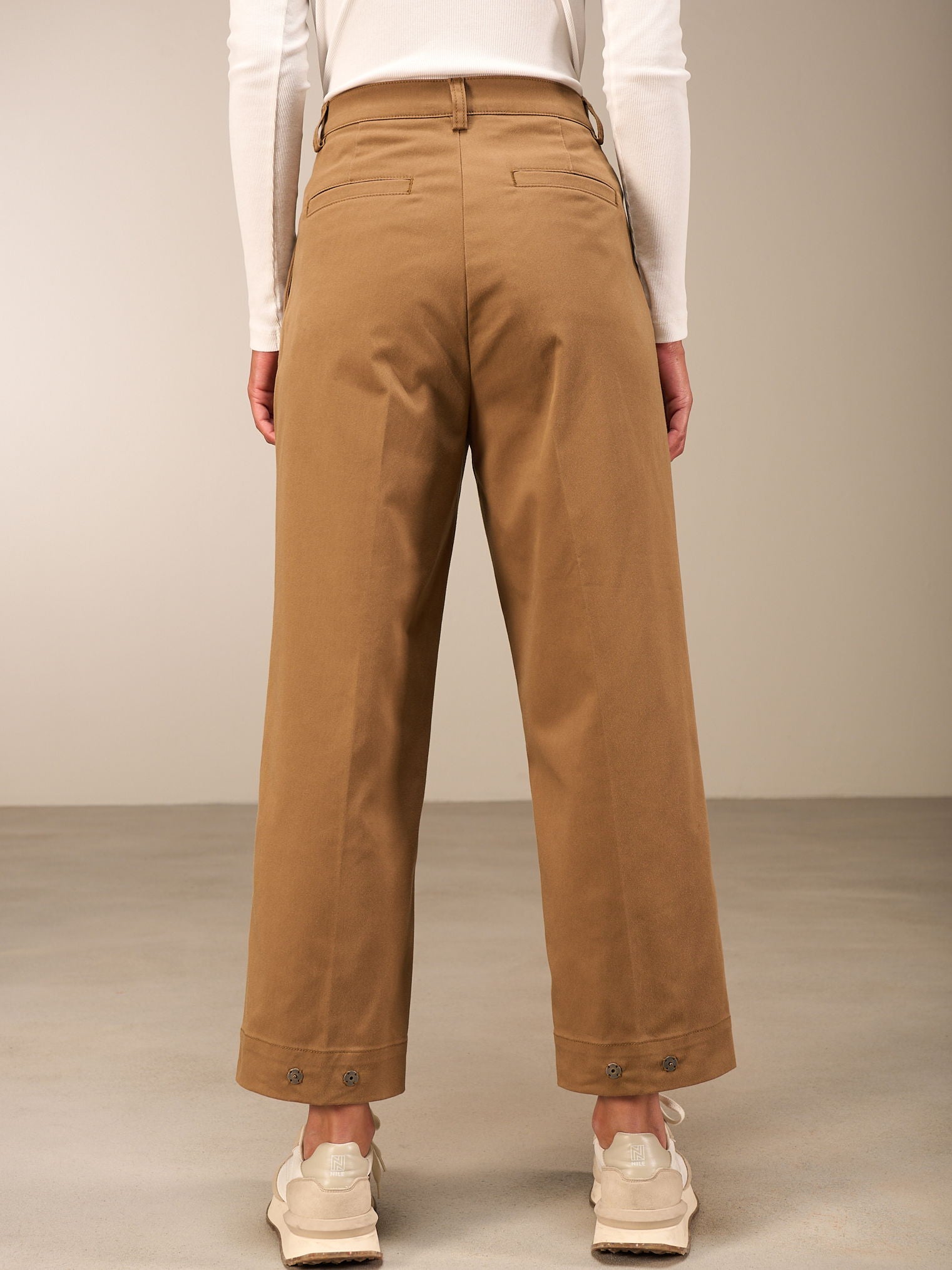 Locker sitzende Hose in O-Shape-Form mit hohem Bund und stylischen Bundfalten. Leistentaschen auf dem Gesäss und als besonderes Detail Druckknöpfe am hinteren Beinsaum zum verstellen der Saumweite. Ein leicht elastischer Stoff mit leichtem Glanz rundet den Style ab.