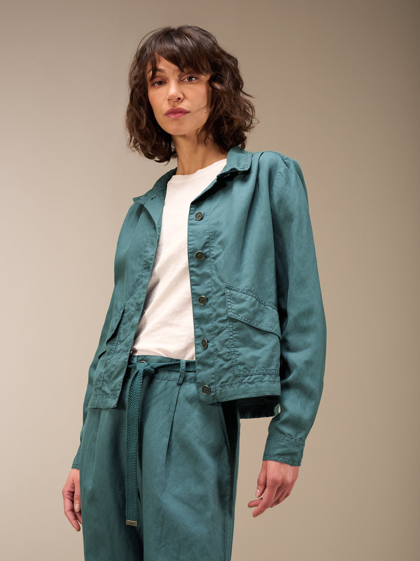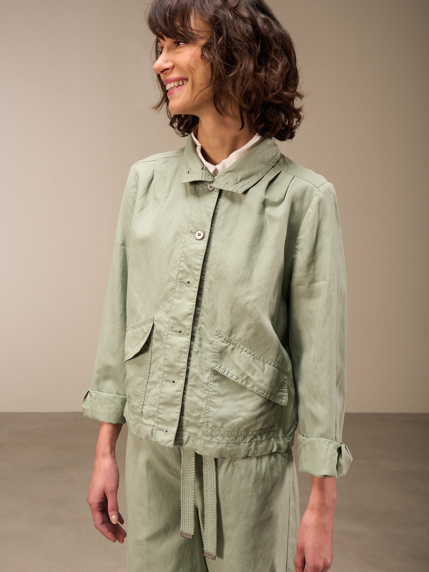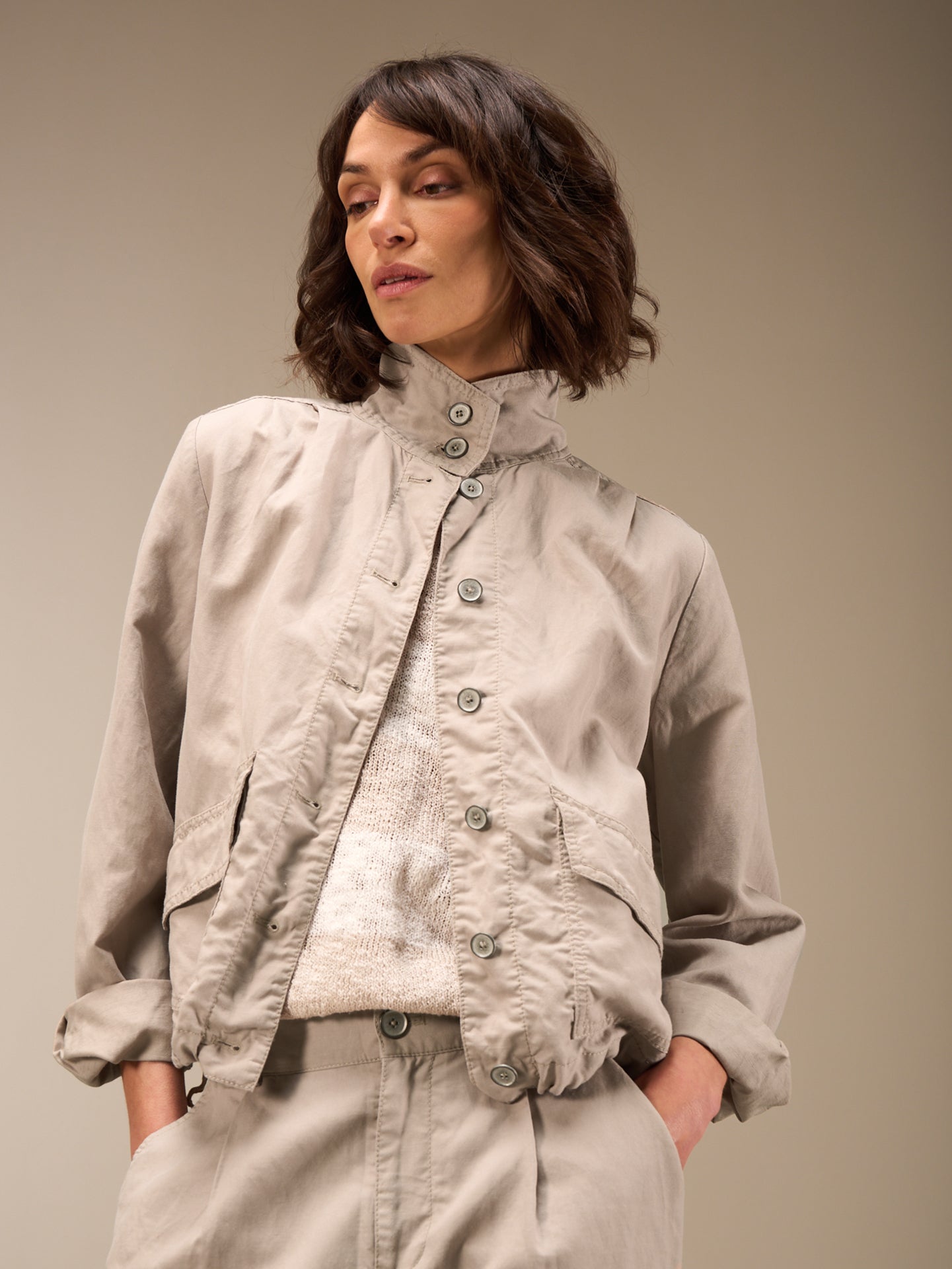 Kurze, weite, sportliche Jacke mit grossen aufgesetzten Taschen in angenehm sommerlicher Qualität. Der Kragen kann locker offen oder mit 2 Knöpfen geschlossen getragen werden. Der Knopfverschluss vorne und der Ärmelabschluss mit Knopf runden den edlen Look ab.