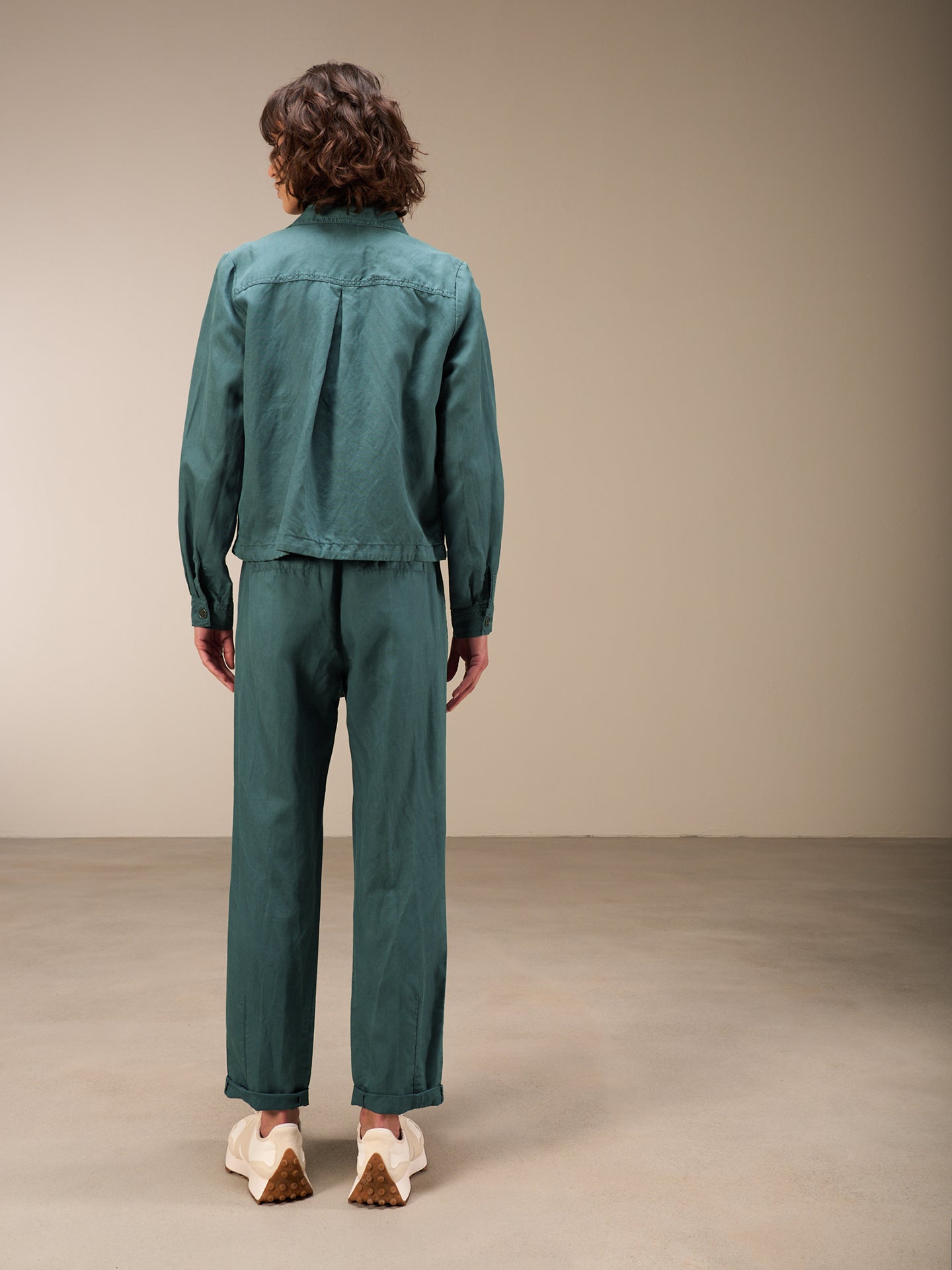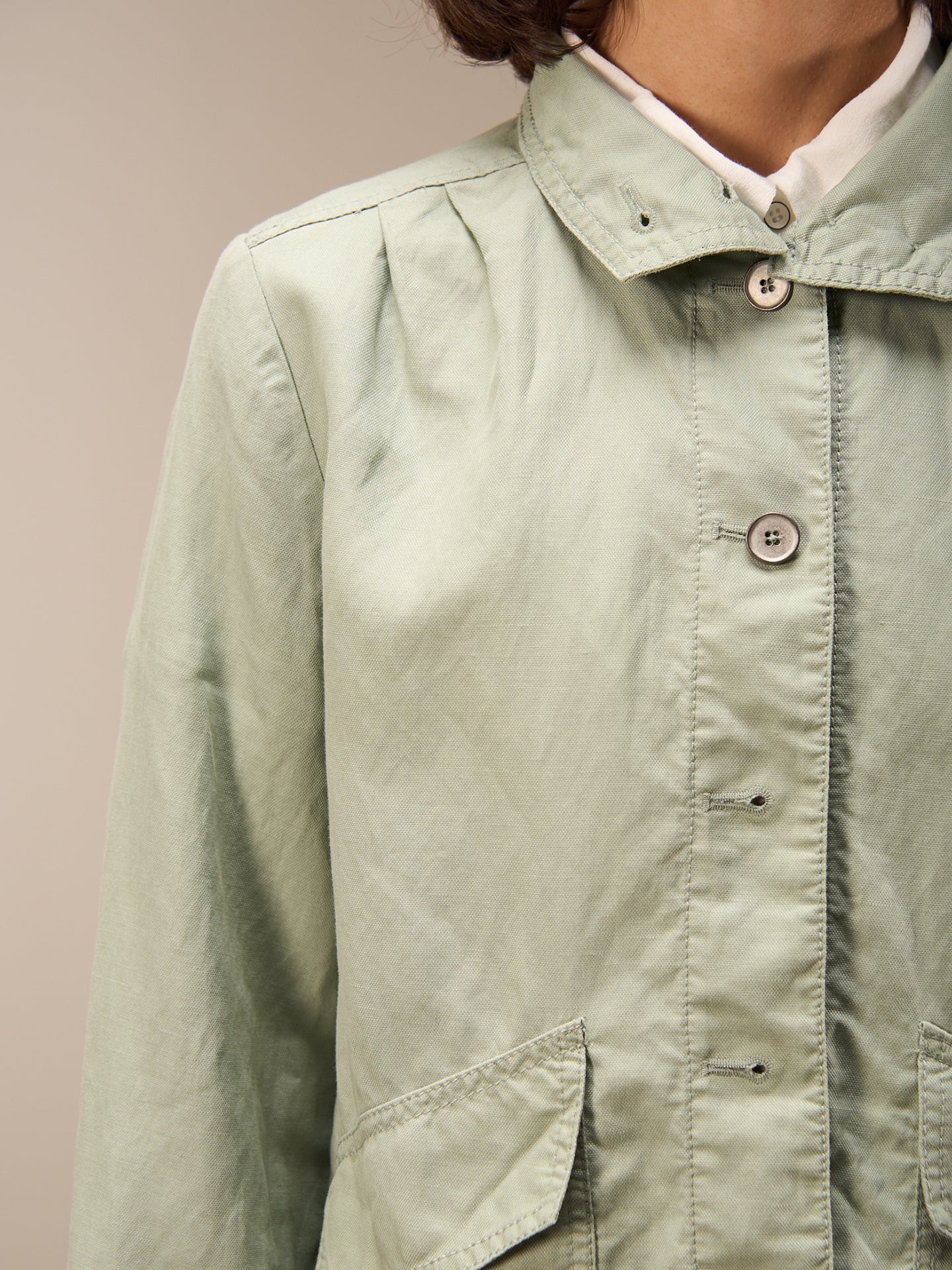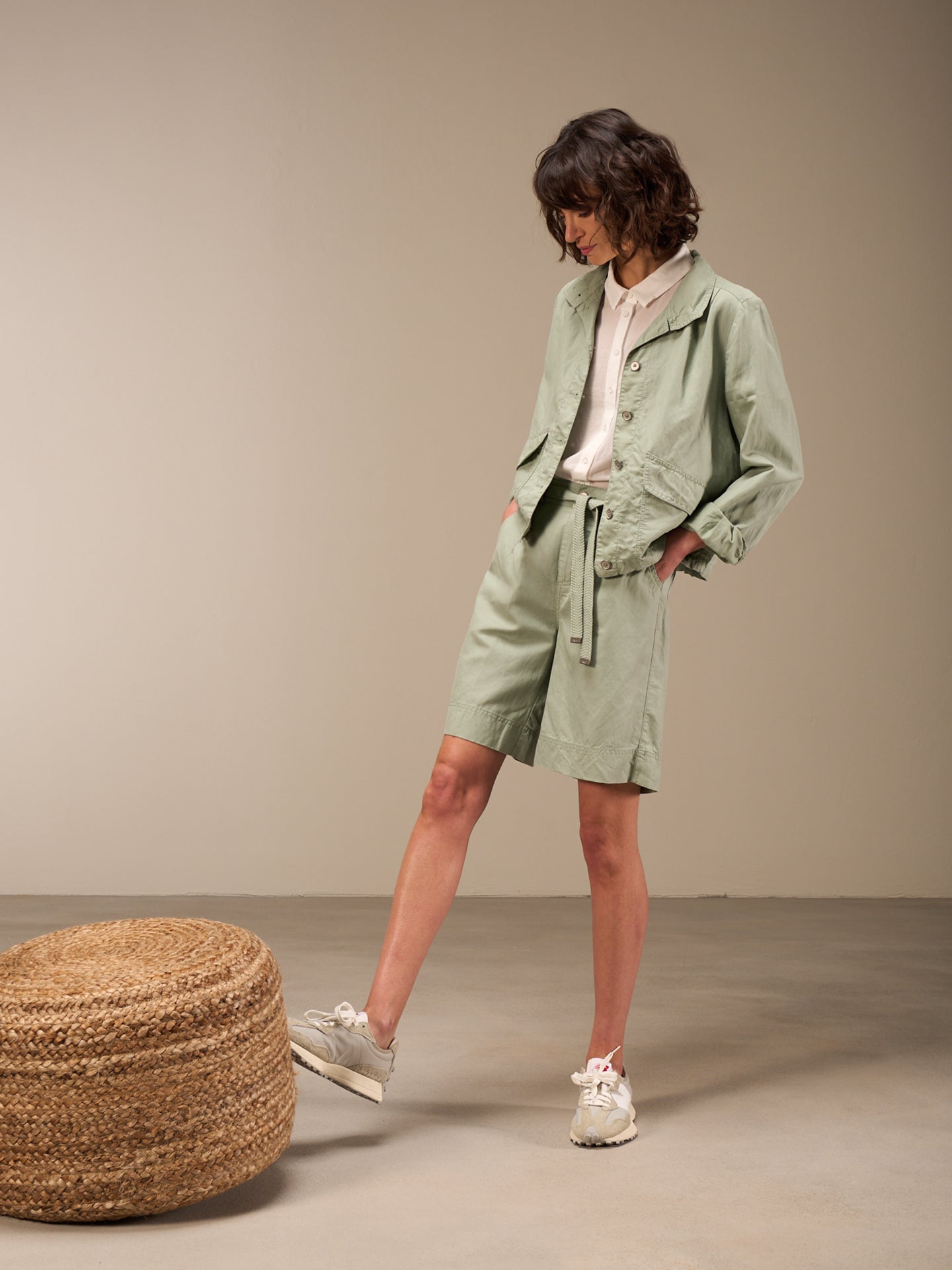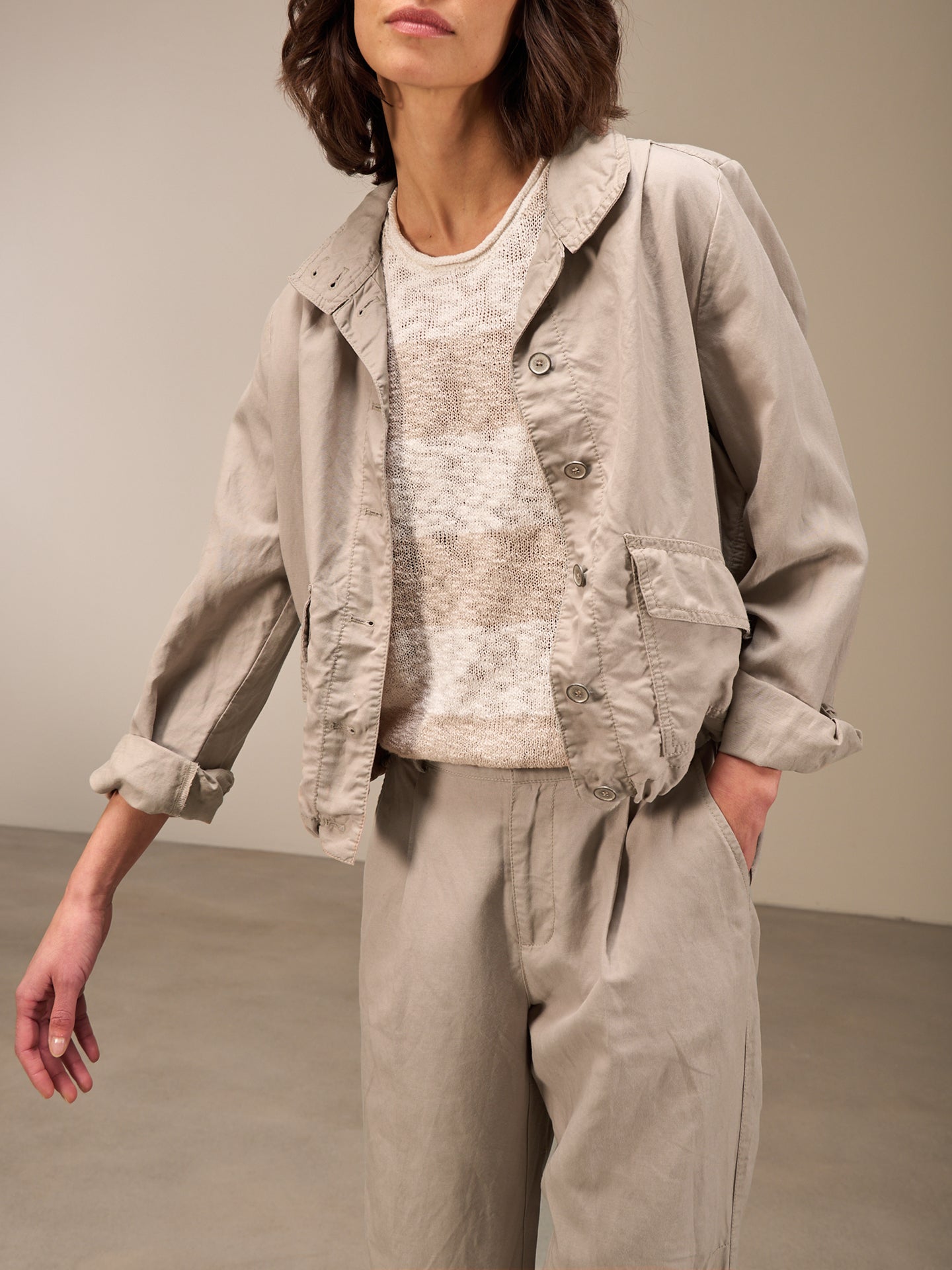 Kurze, weite, sportliche Jacke mit grossen aufgesetzten Taschen in angenehm sommerlicher Qualität. Der Kragen kann locker offen oder mit 2 Knöpfen geschlossen getragen werden. Der Knopfverschluss vorne und der Ärmelabschluss mit Knopf runden den edlen Look ab.