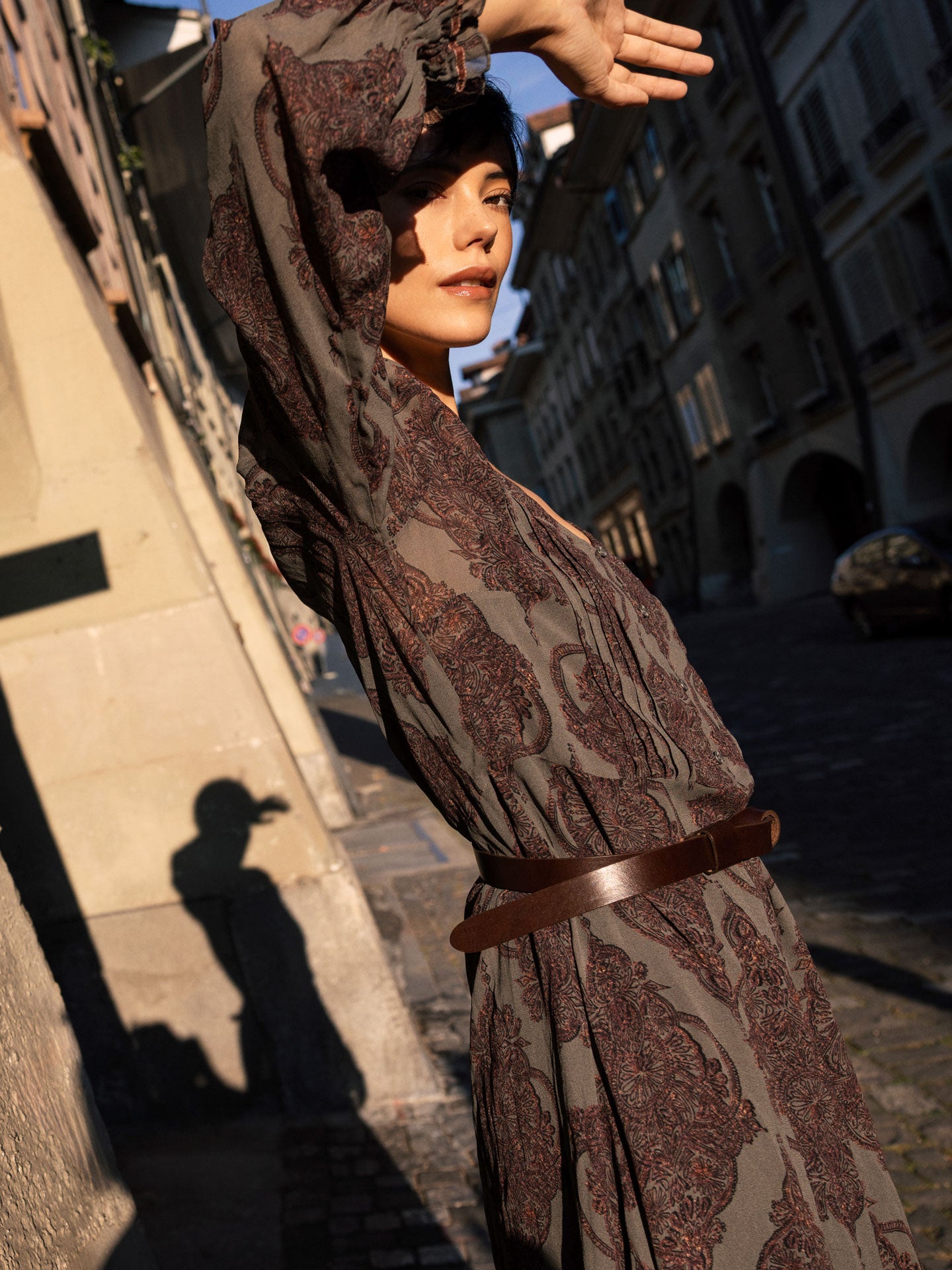 Langes Kleid mit Volantdetails am Rock und handgezeichnetem Alloverprint, einem V-Ausschnitt und langen Ärmeln mit elastischem Abschluss. Der Gürtel mit aufwändigen Dekoelementen rundet das dekorative Kleid ab. Separates Unterkleid.