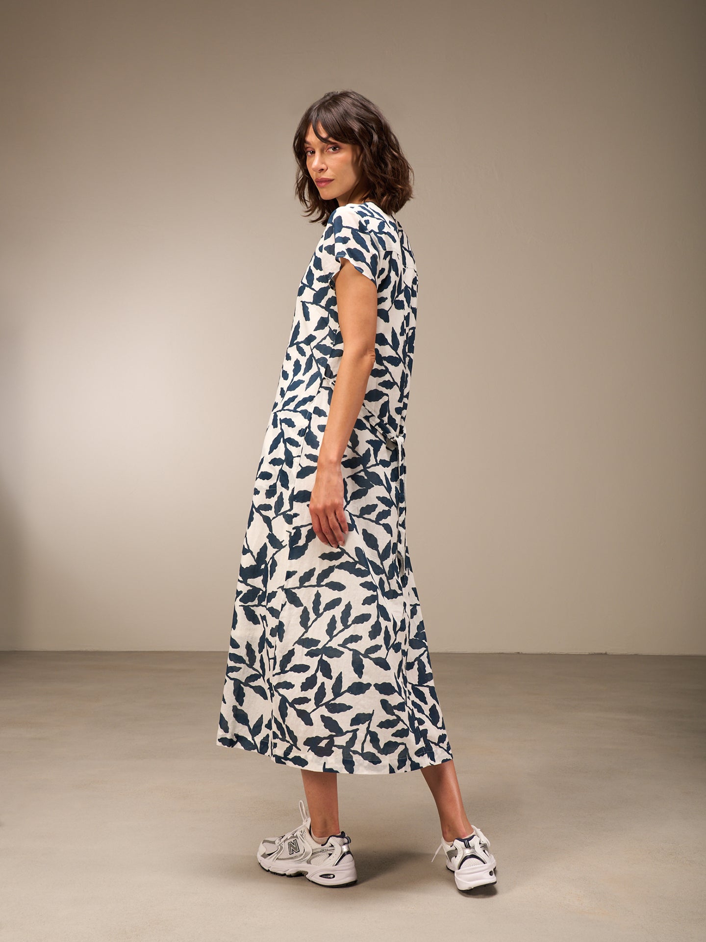 Feminines gefüttertes Kleid in leichter A-Linie mit kurzen Ärmeln und V-Ausschnitt, das mit dem dünnen Stoffgürtel auch tailliert getragen werden kann. Der handgezeichnete Alloverprint macht dieses Kleid zu einem Lieblingsteil, von Sommer bis Herbst .