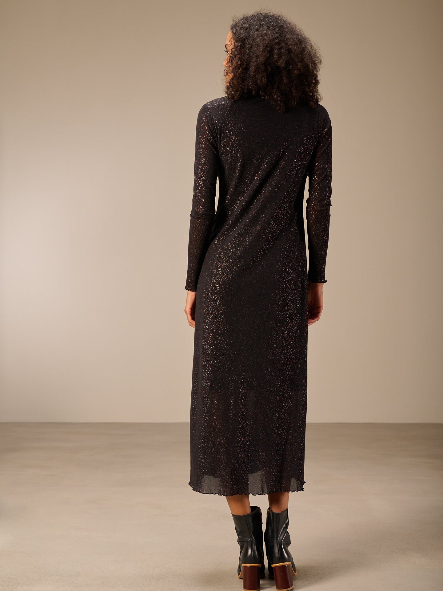 Körperbetontes knöchellanges Kleid mit kleinem Stehkragen in angesagter feiner Netzoptik und mit dezentem Goldprint.