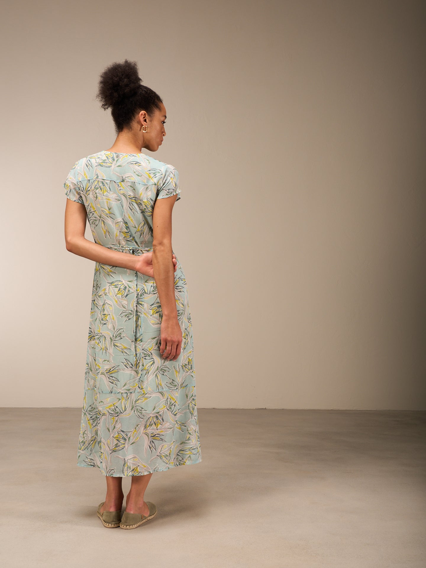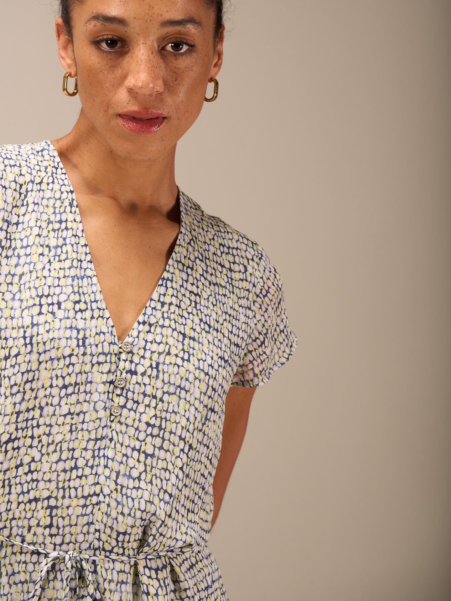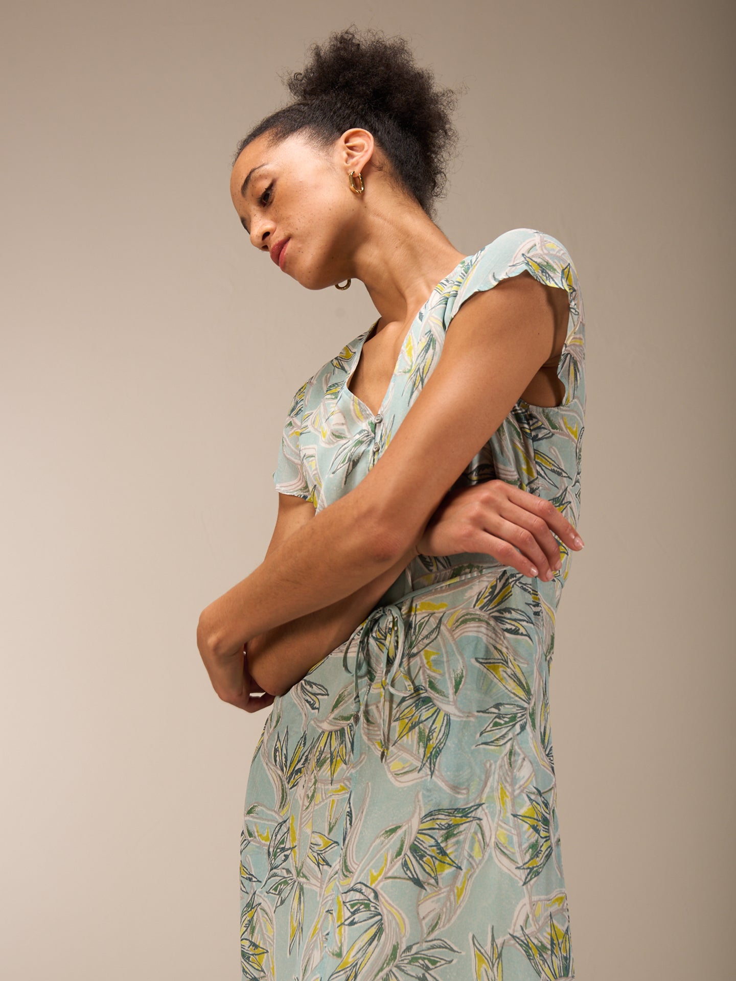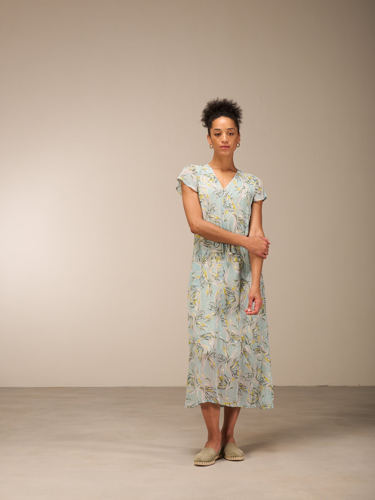 Feminines gefüttertes Kleid in leichter A-Linie mit kurzen Ärmeln und V-Ausschnitt, das mit dem dünnen Stoffgürtel auch tailliert getragen werden kann. Der handgezeichnete Alloverprint macht dieses Kleid zu einem sommerlichen Lieblingsteil. Aus 100% Eco Viskose, die aus nachhaltiger Holzwirtschaft gewonnen wird.