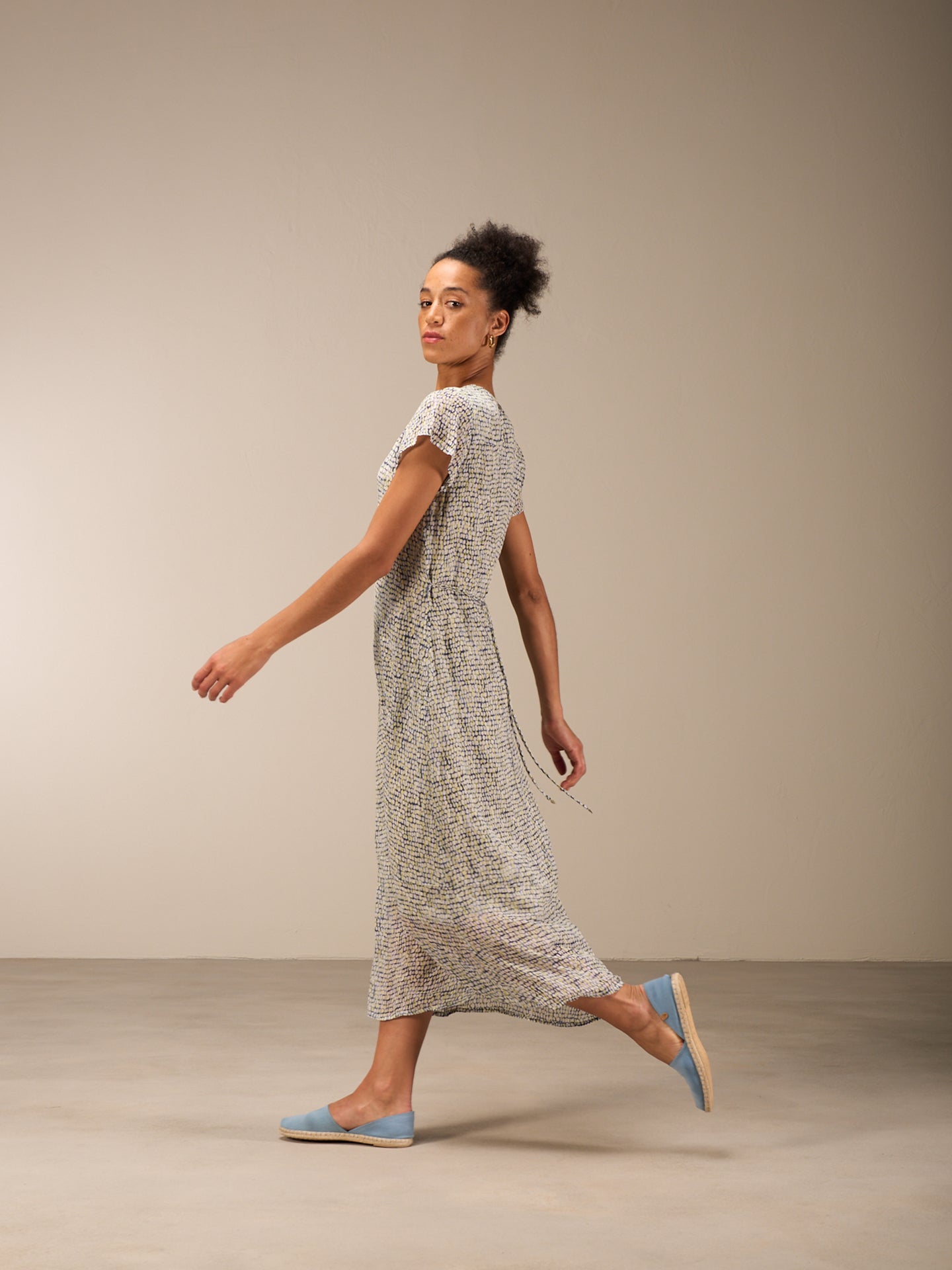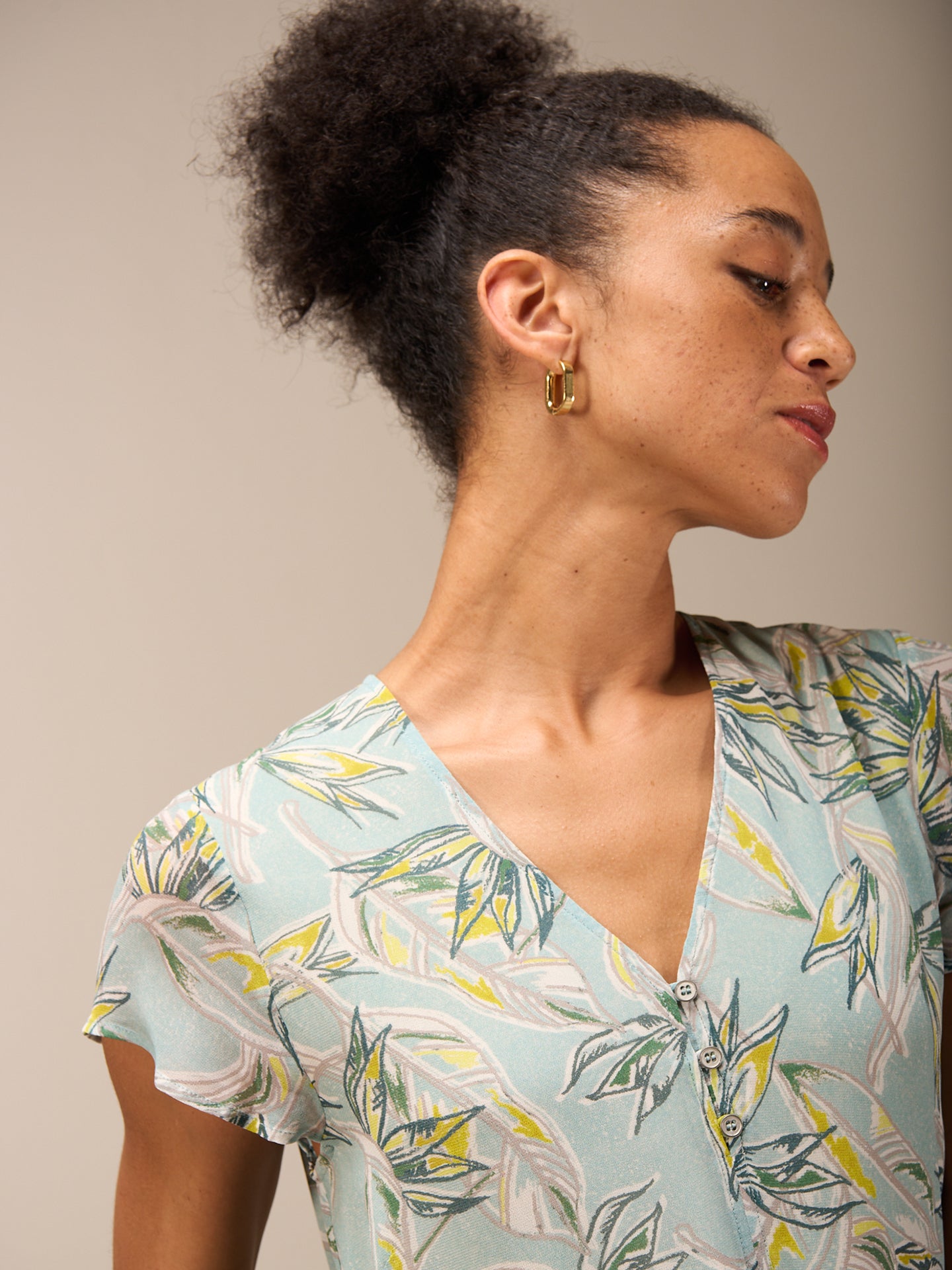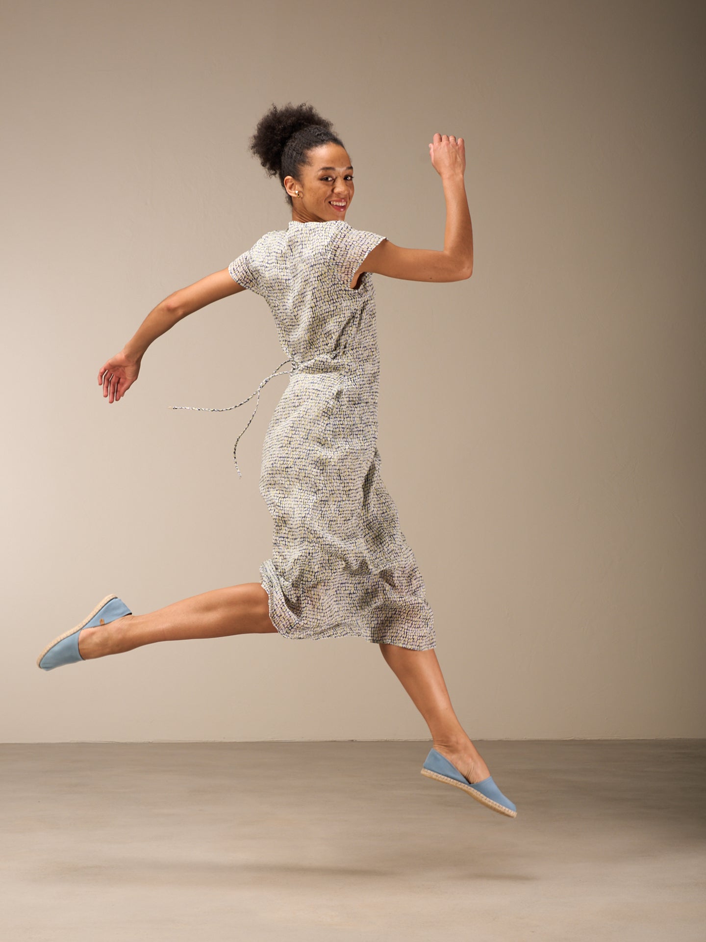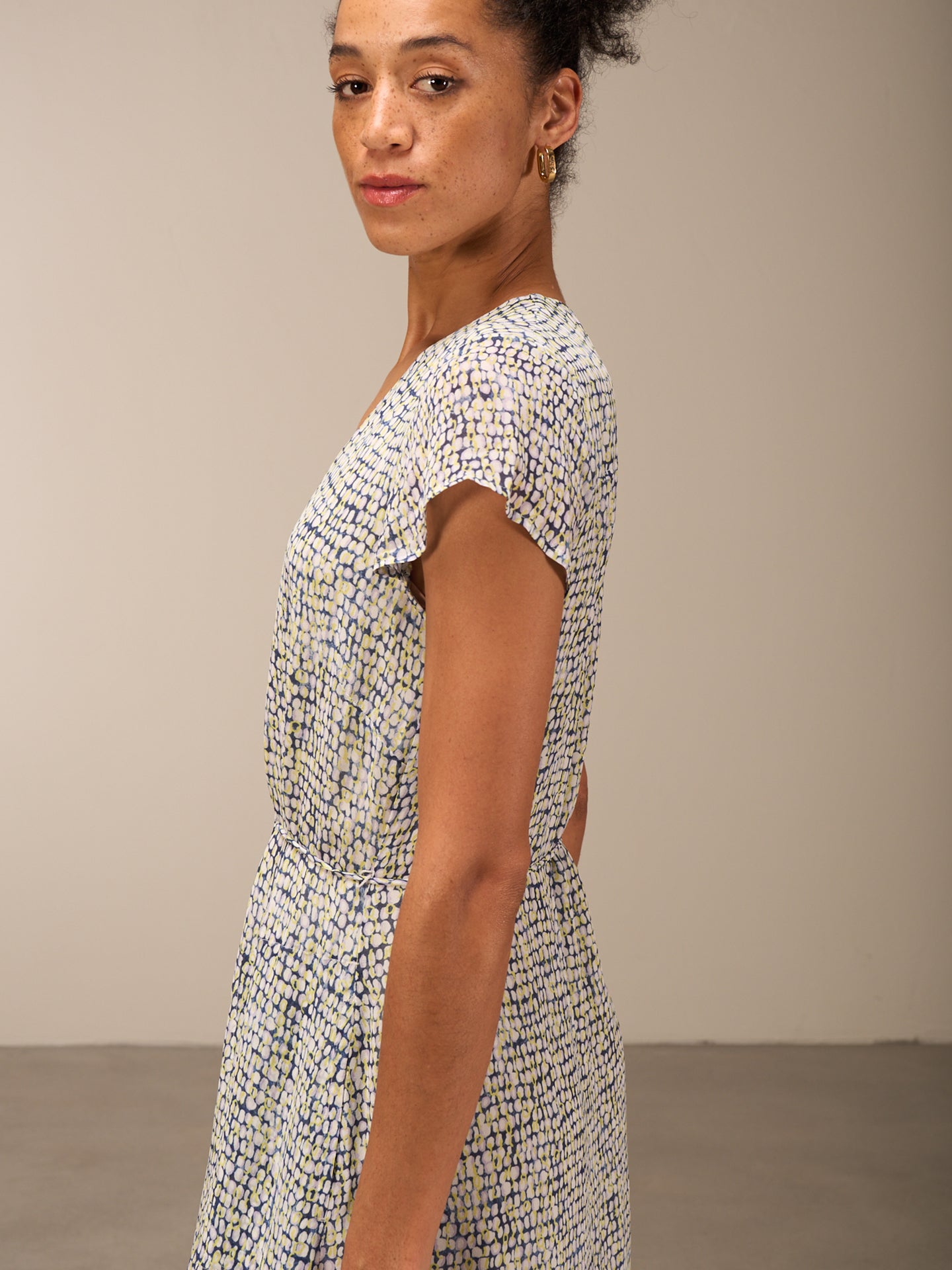Feminines gefüttertes Kleid in leichter A-Linie mit kurzen Ärmeln und V-Ausschnitt, das mit dem dünnen Stoffgürtel auch tailliert getragen werden kann. Der handgezeichnete Alloverprint macht dieses Kleid zu einem sommerlichen Lieblingsteil. Aus 100% Eco Viskose, die aus nachhaltiger Holzwirtschaft gewonnen wird.