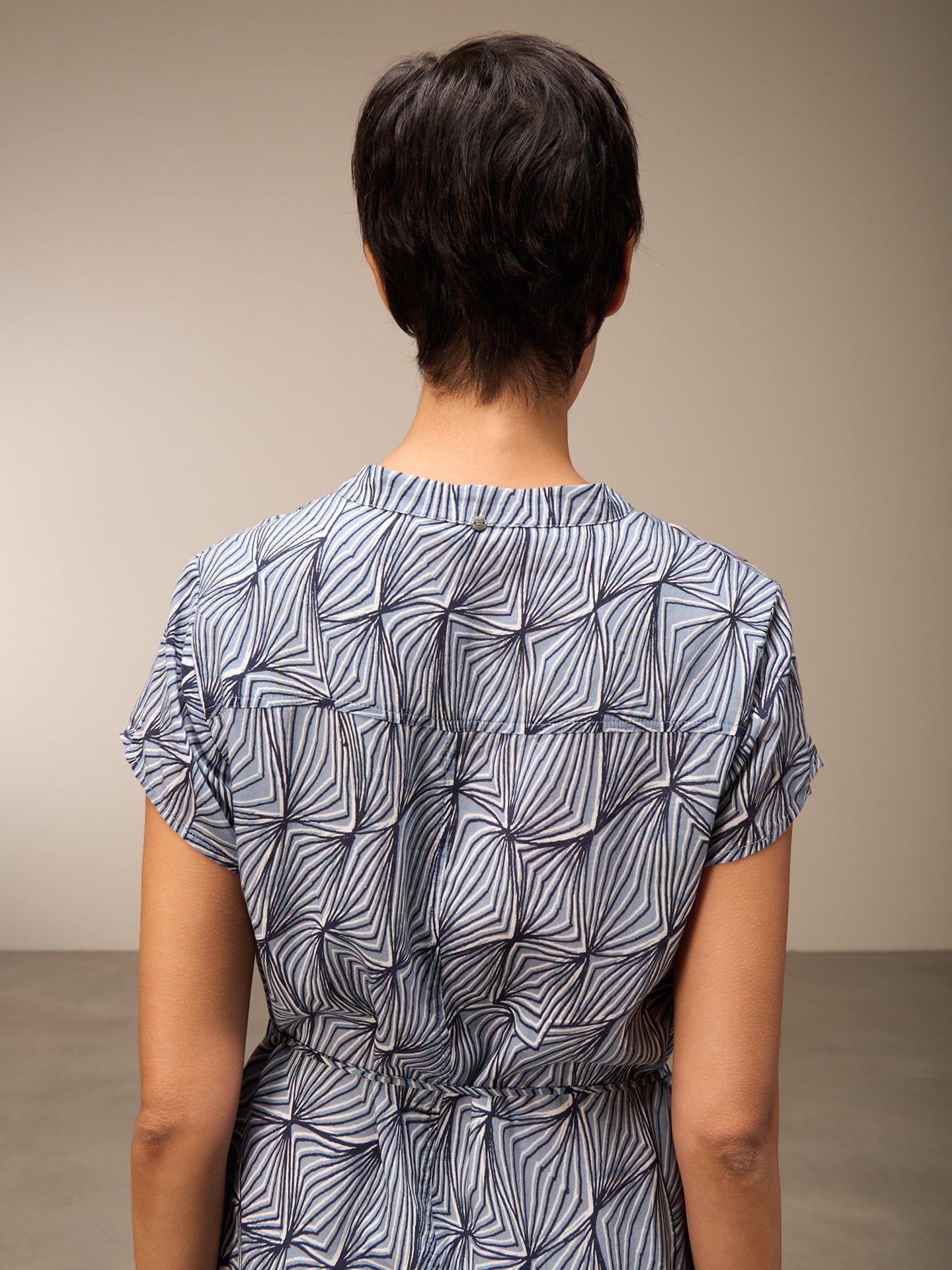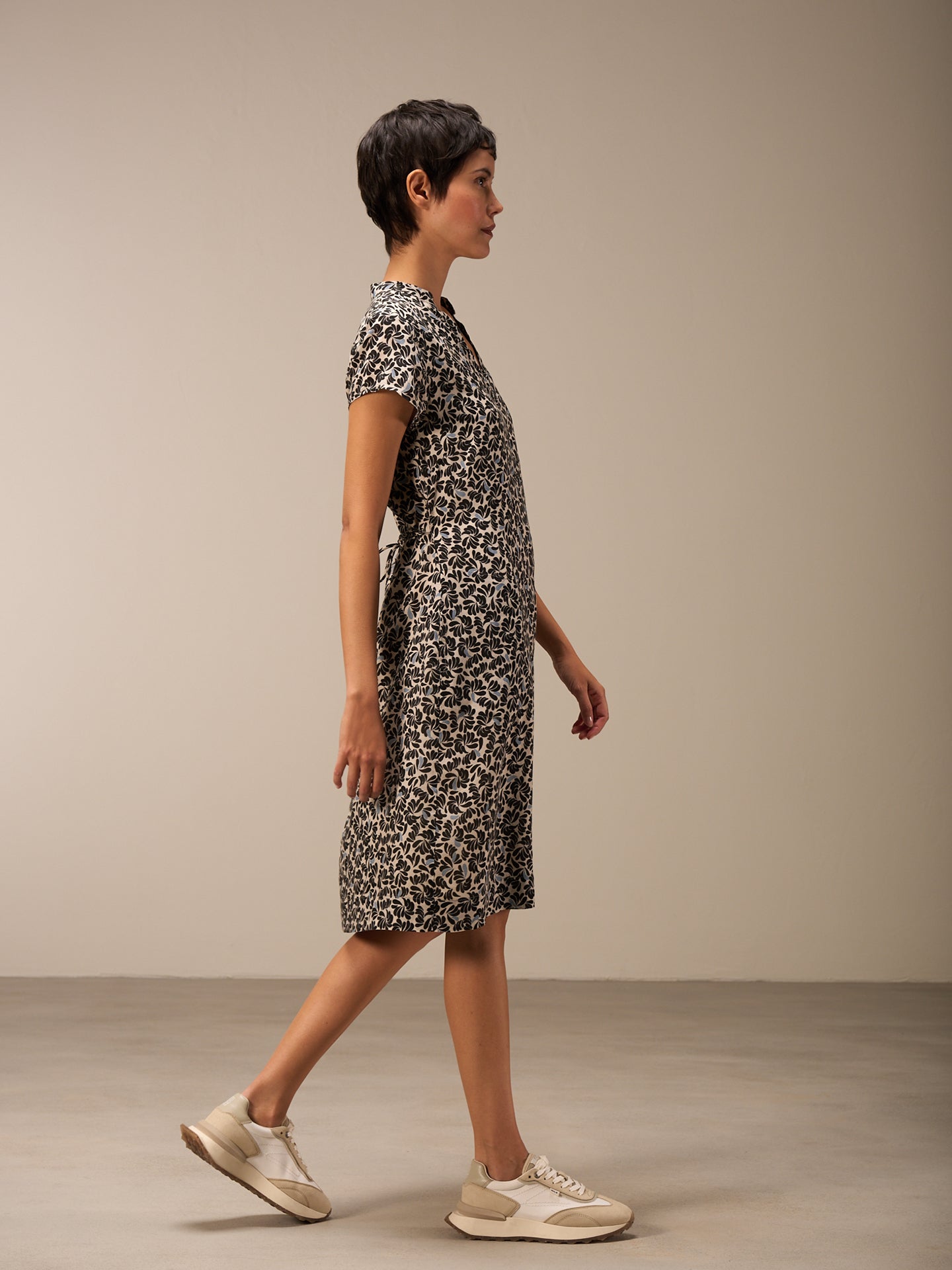 Feminines gefüttertes Kleid in leichter A-Linie mit kurzen Ärmeln, V-Ausschnitt und handgezeichnetem Alloverprint. Aus 100% TENCELTM-zertifiziertem Lyocell.