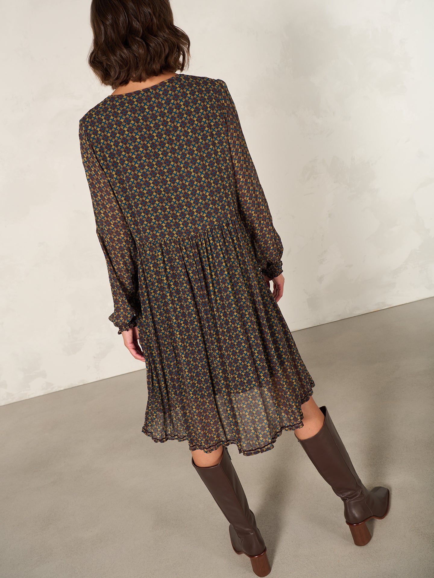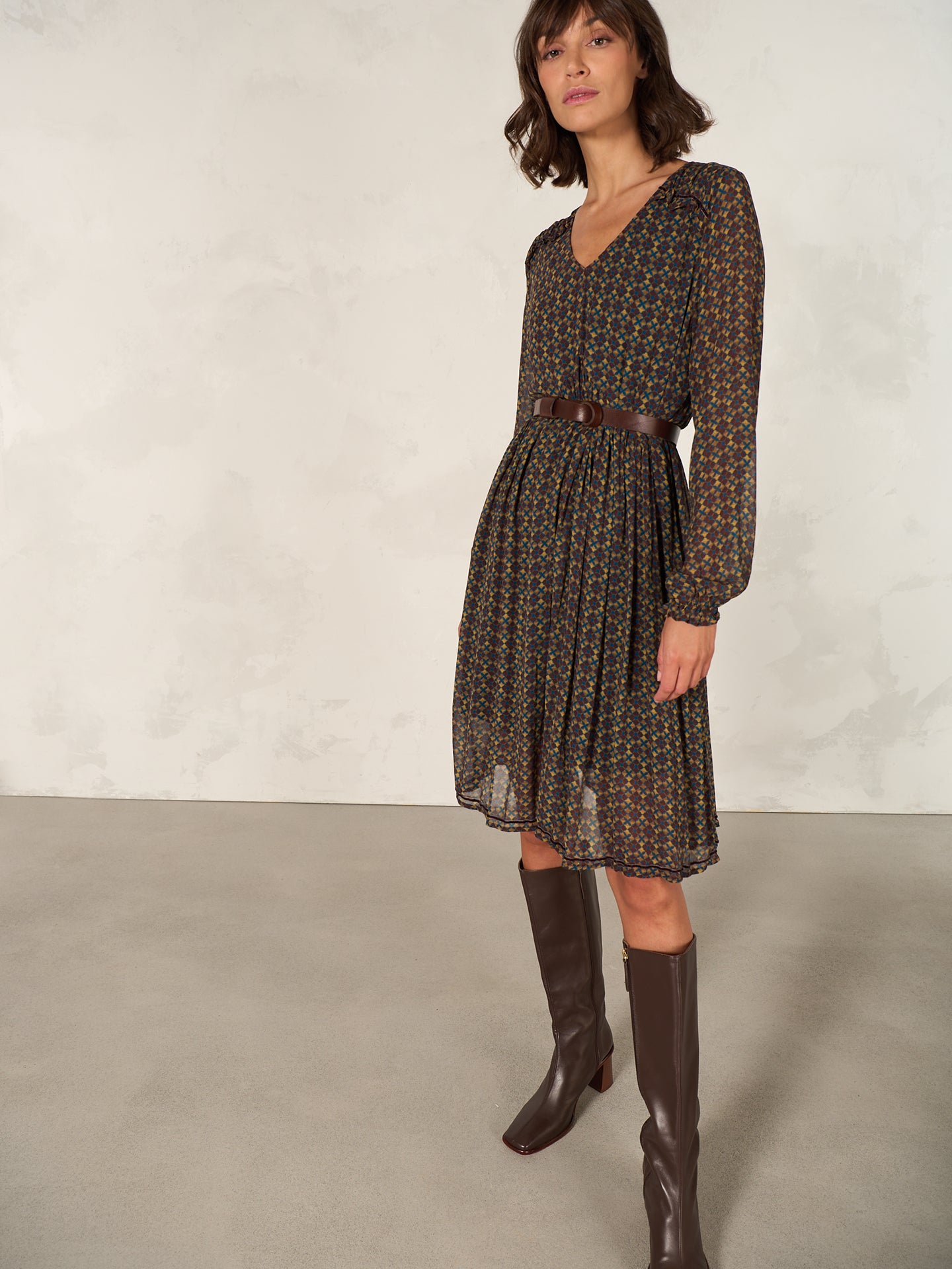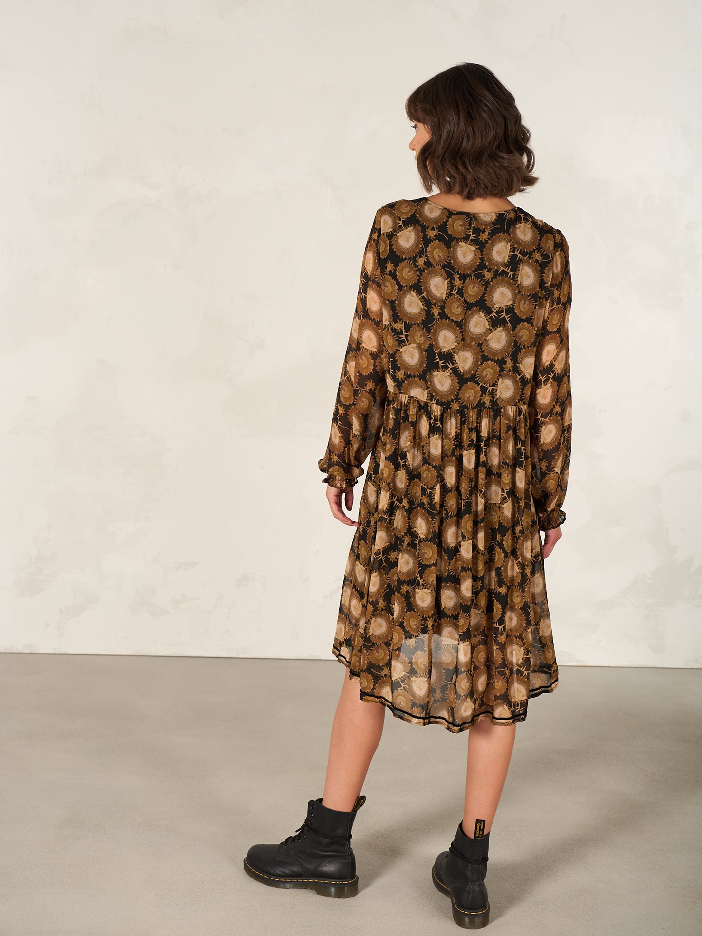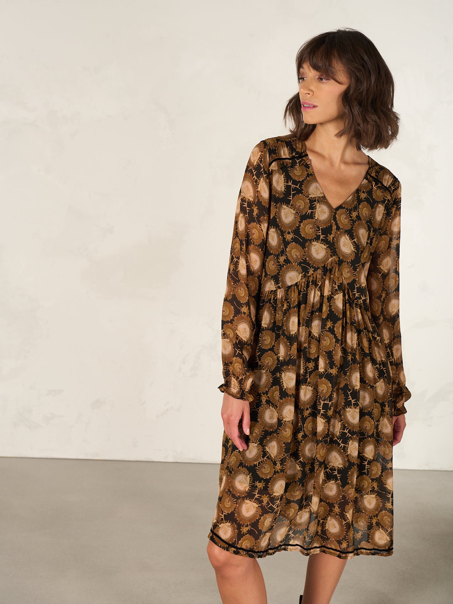 Fliessendes feminines Kleid in Midilänge mit handgezeichnetem Alloverprint und einem eingenähten elastischen Futter. Der elastische Bund am langen Ärmel bietet viele Stylemöglichkeiten.