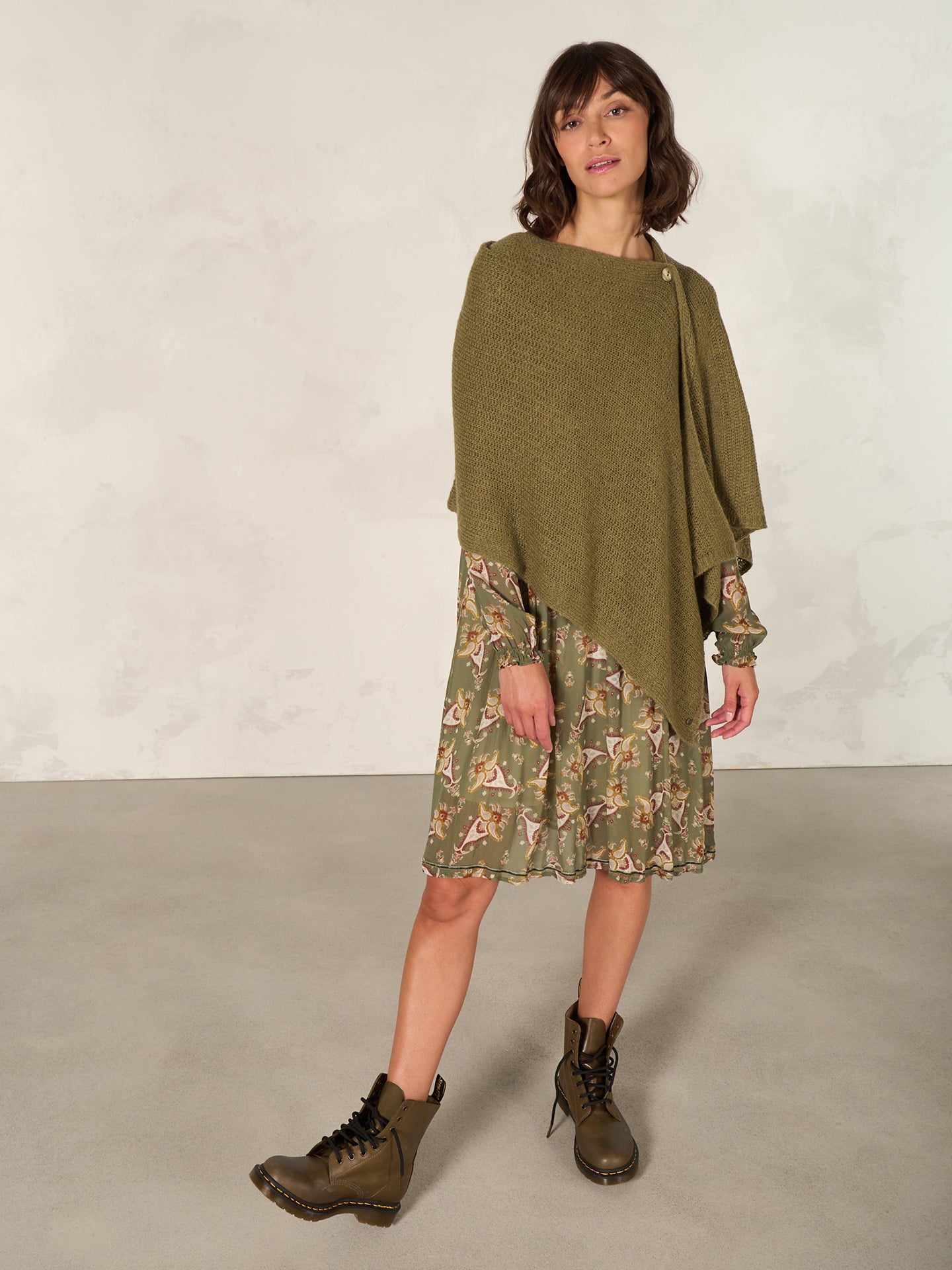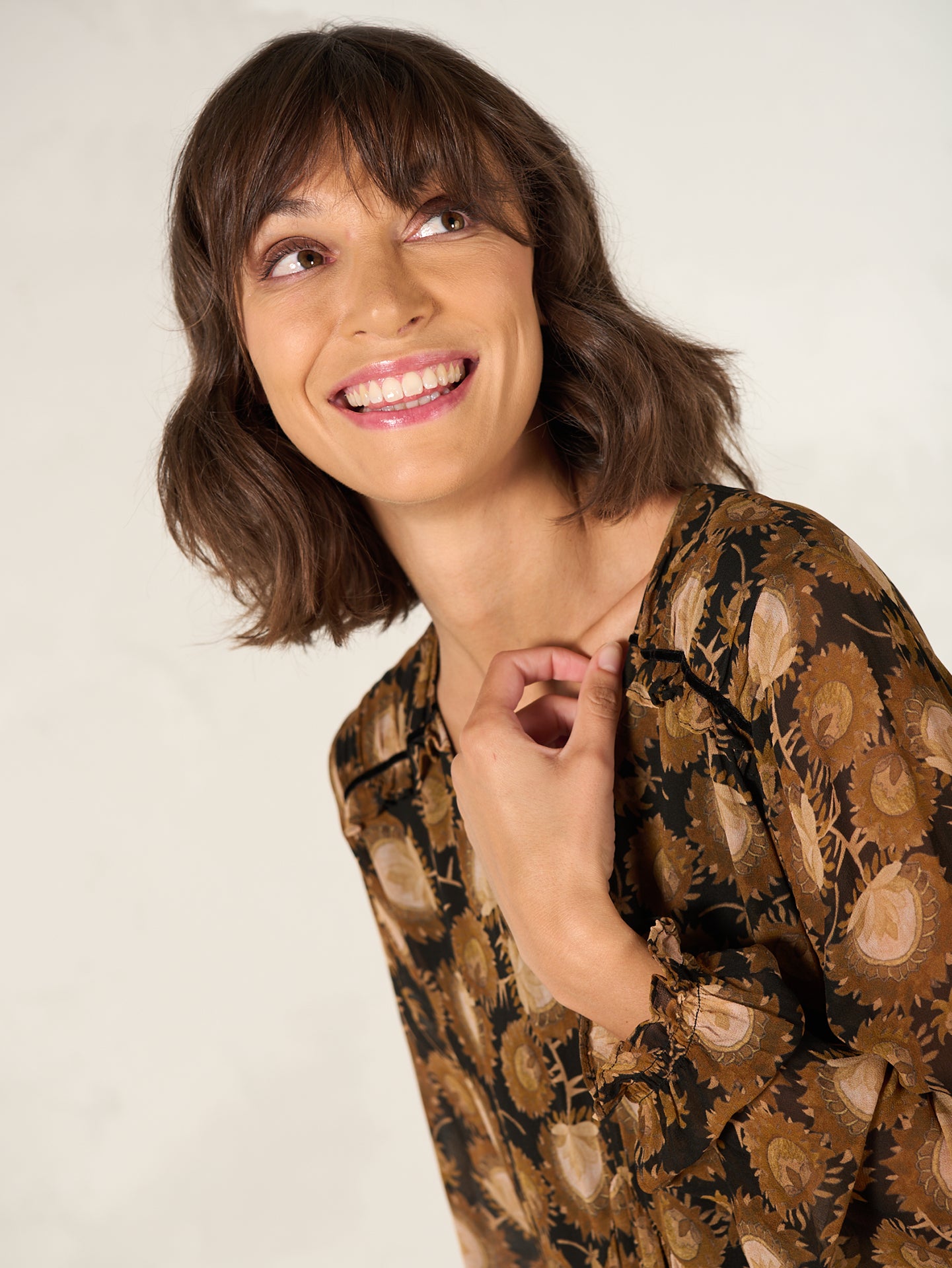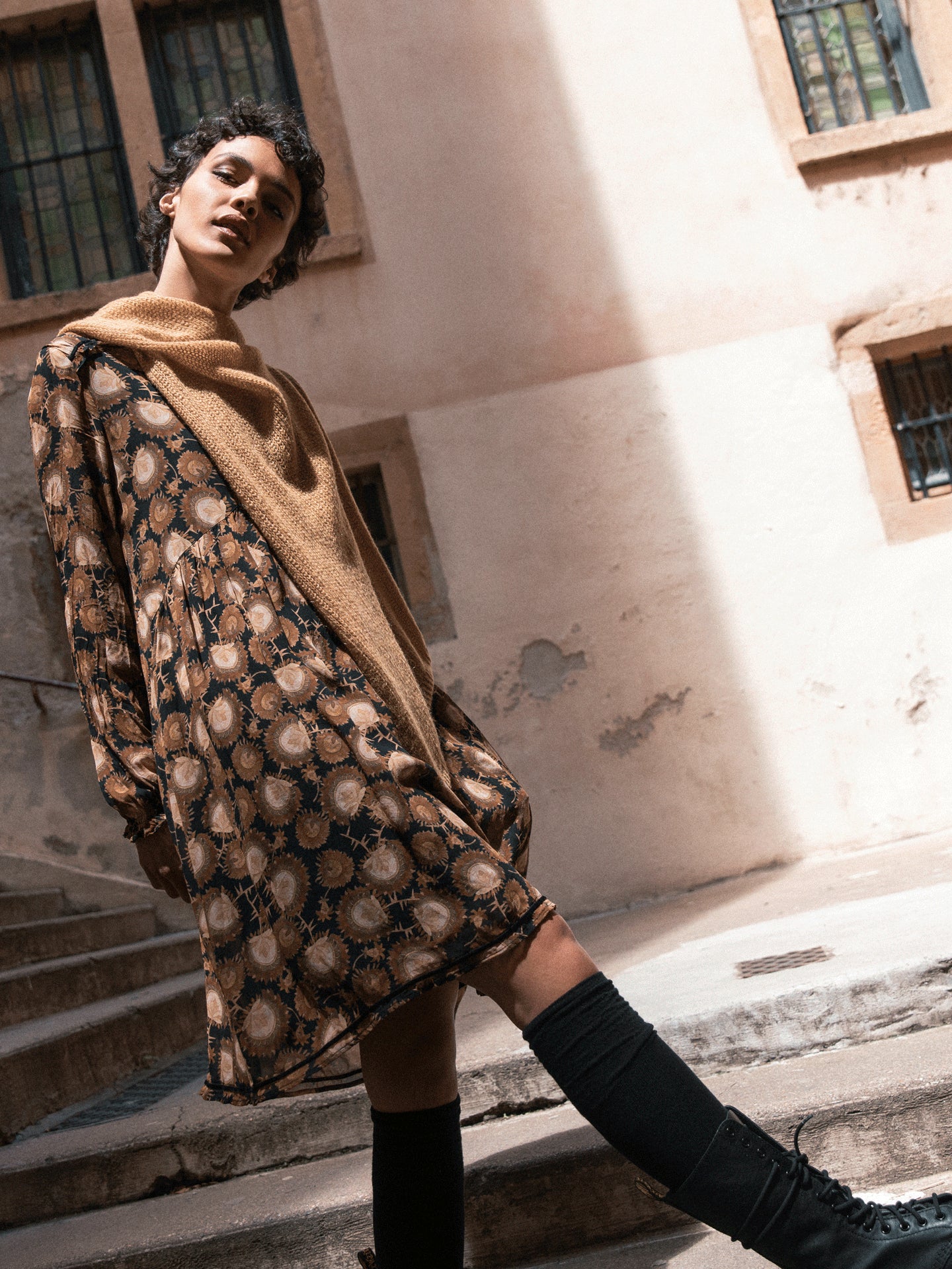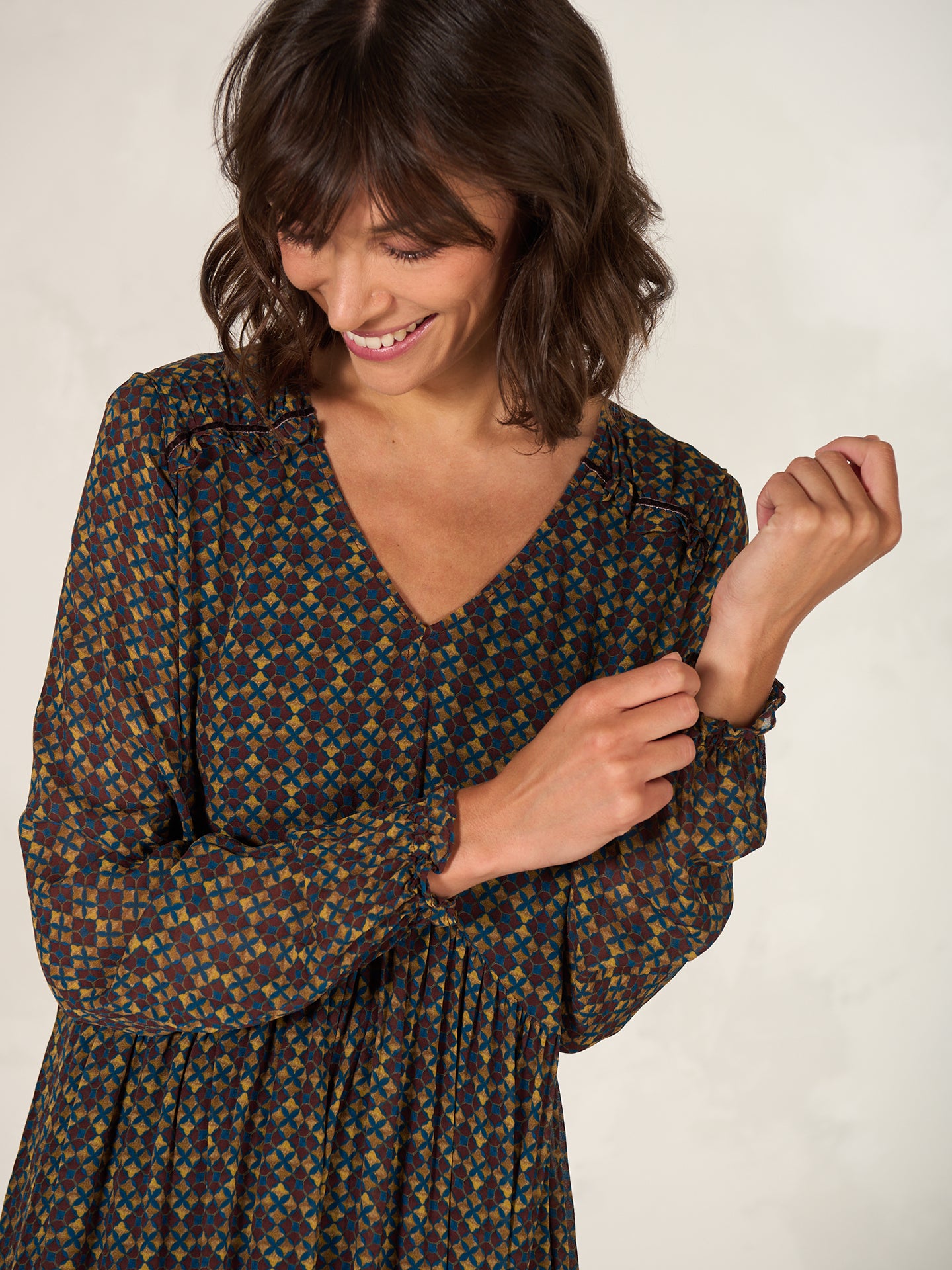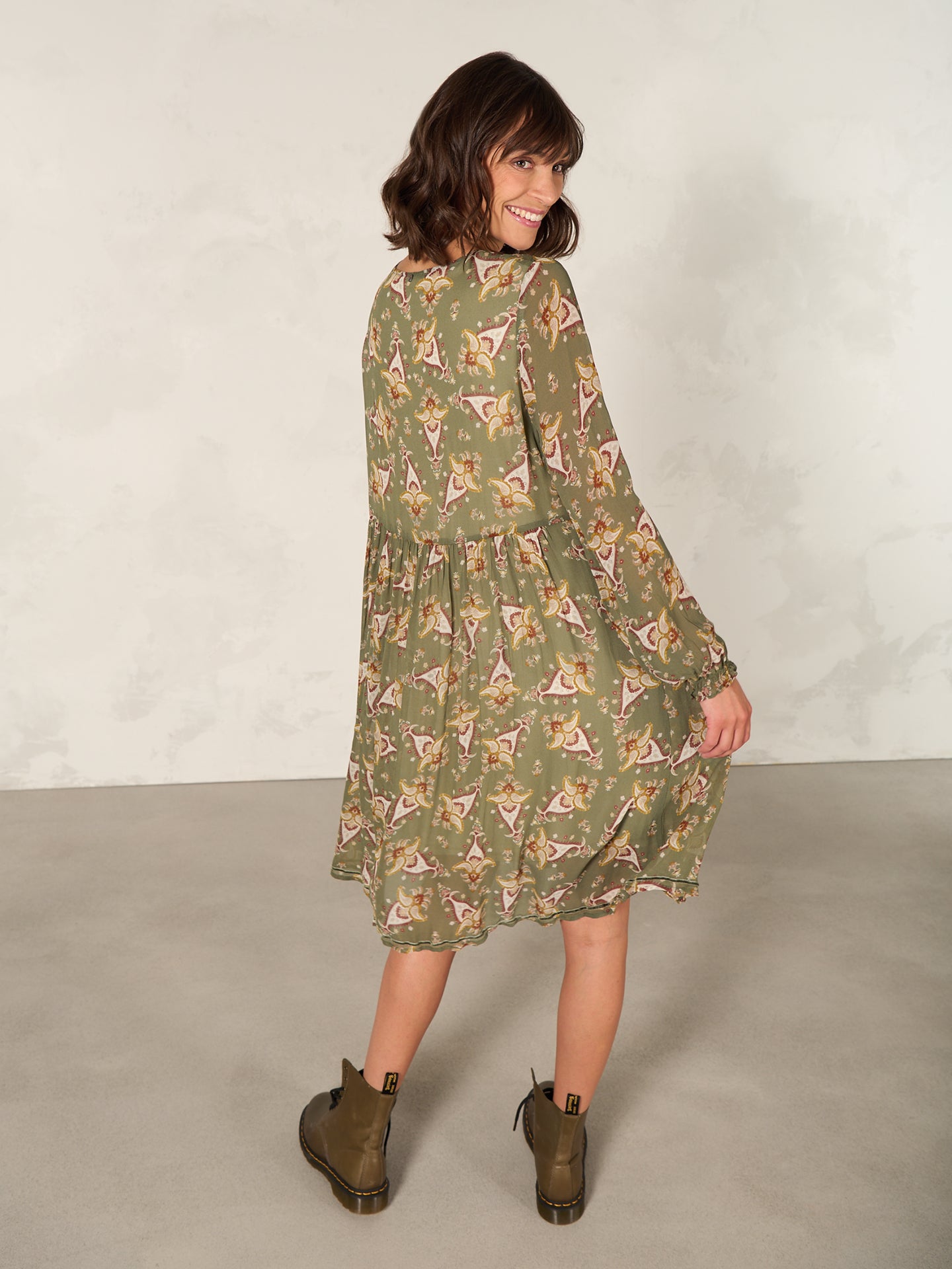 Fliessendes feminines Kleid in Midilänge mit handgezeichnetem Alloverprint und einem eingenähten elastischen Futter. Der elastische Bund am langen Ärmel bietet viele Stylemöglichkeiten.
