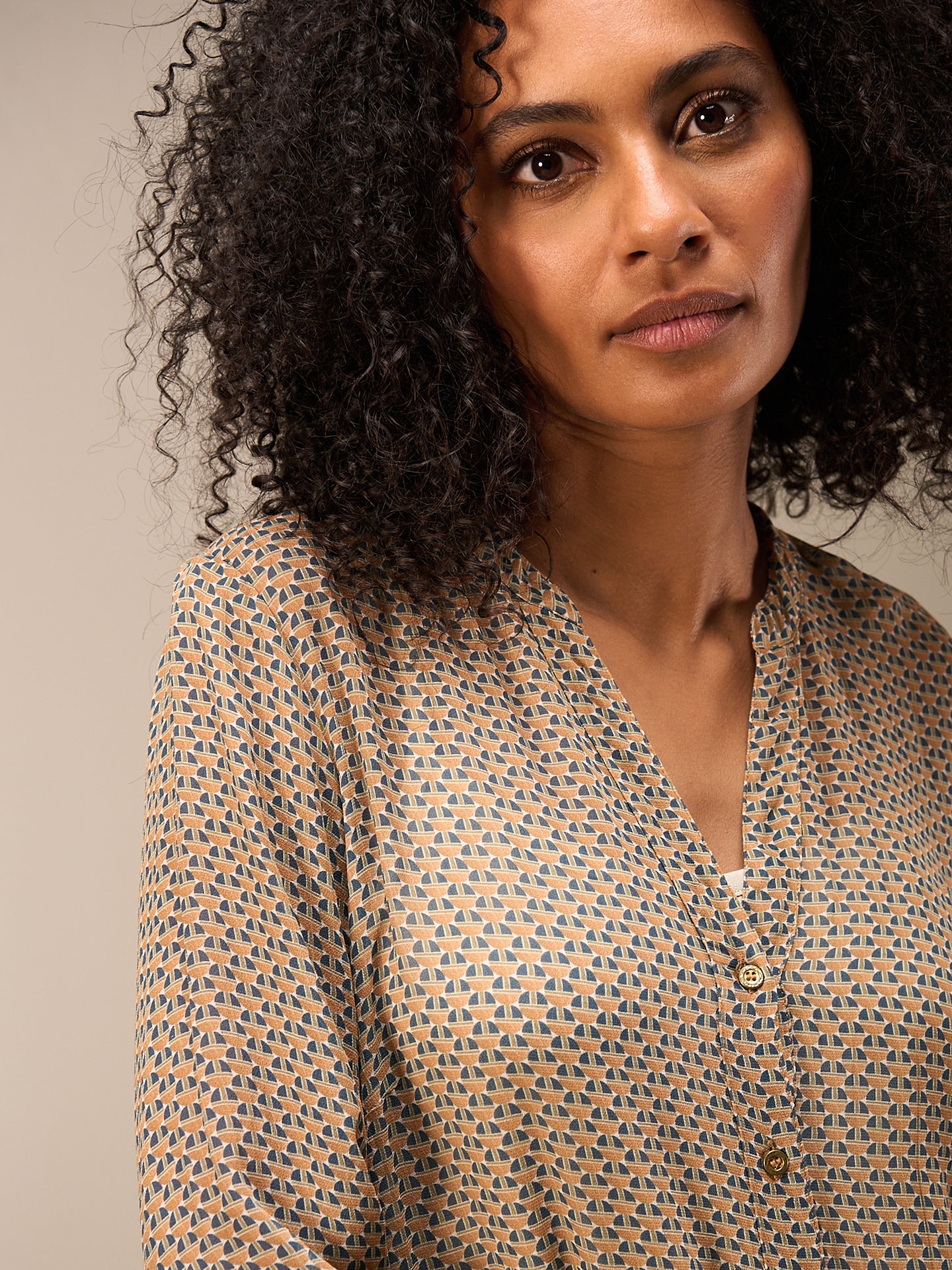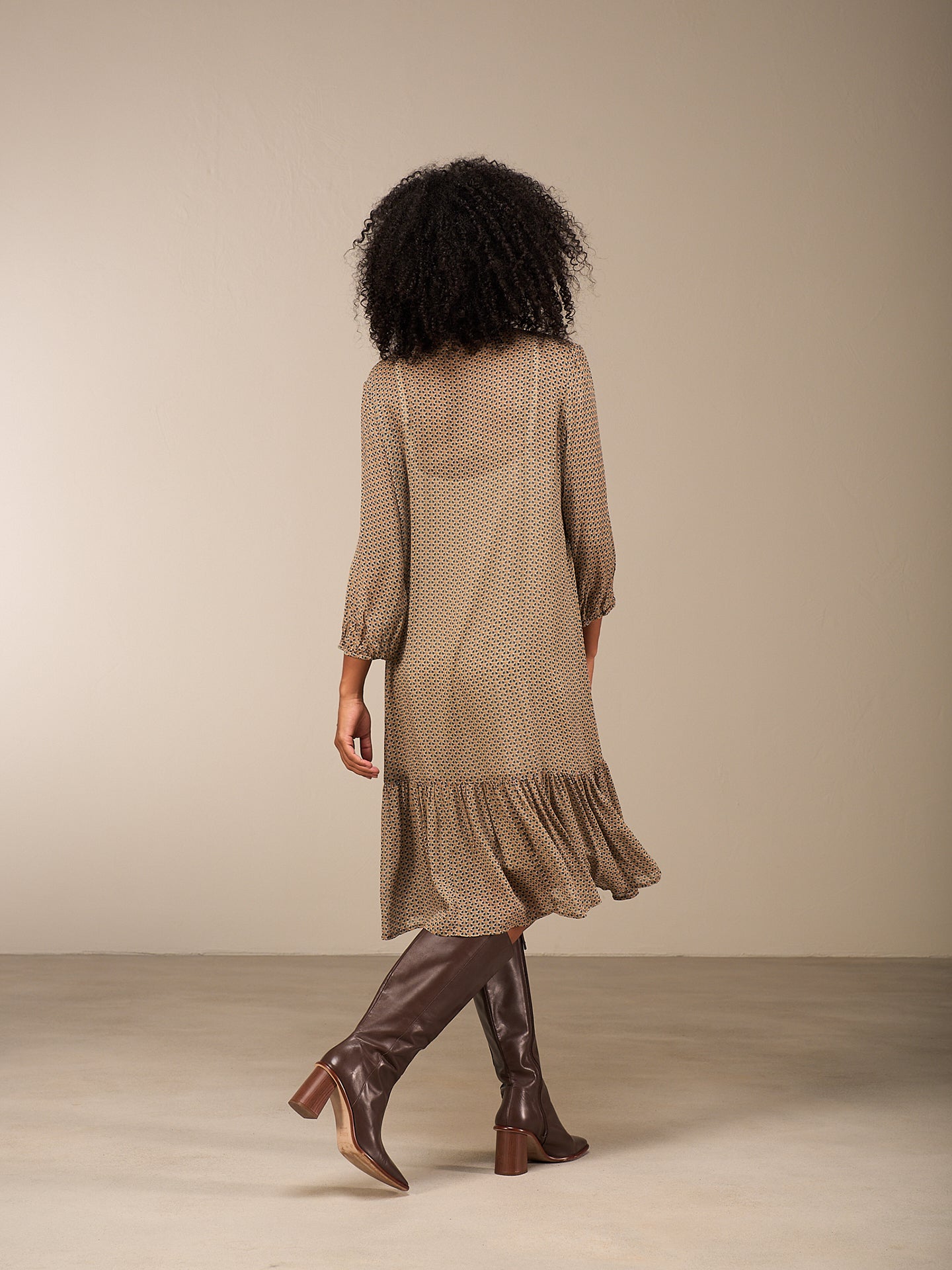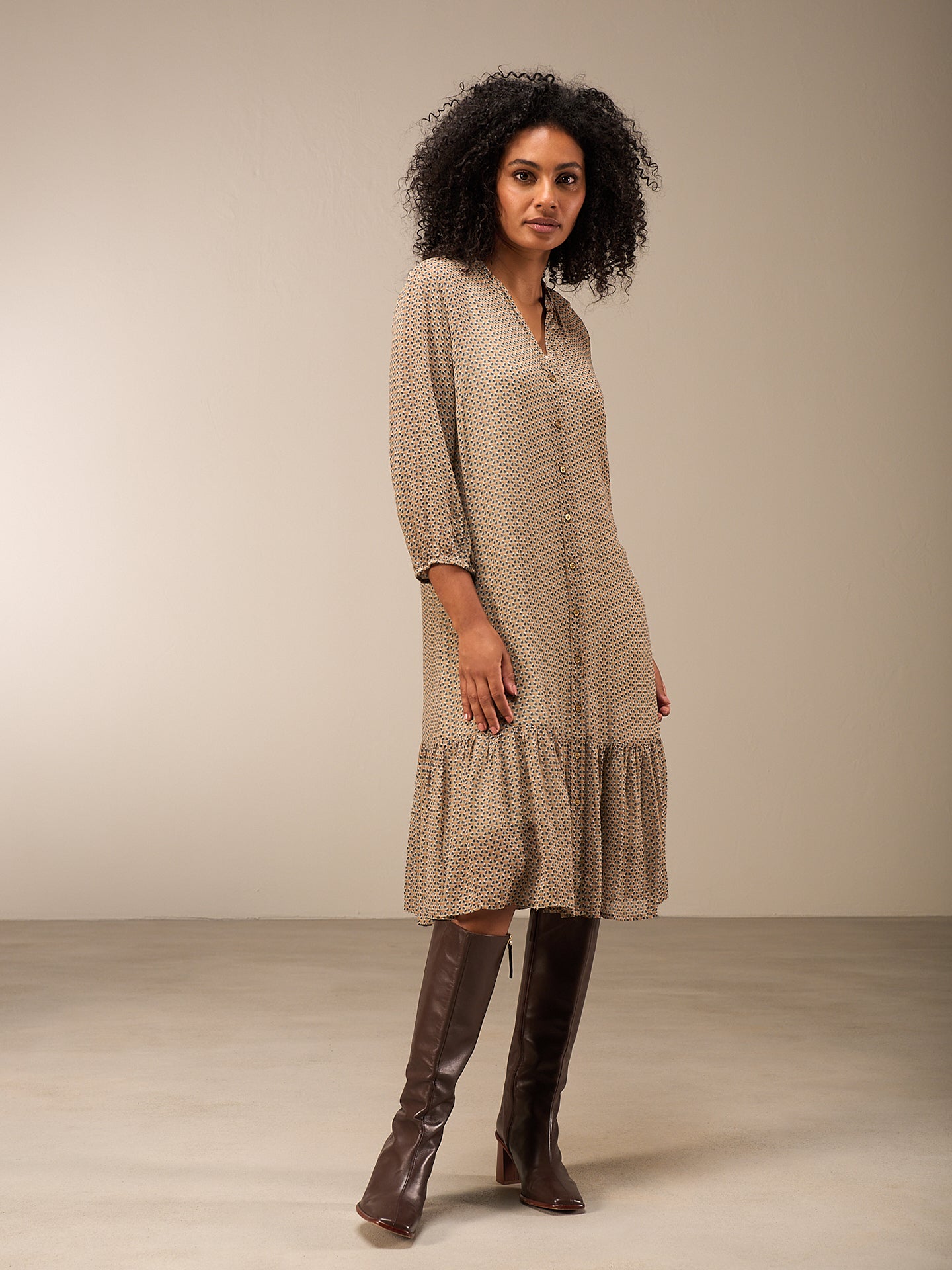 Midilanges durchgeknöpftes Kleid in leichter A-Linie und separatem Unterkleid. Dank elastischem Abschluss sind die 3/4-Ärmel variabel tragbar. Der kleine Stehkragen und die dekorativen Volants am Abschluss runden den Style ab. Aus 100%Eco Viskose, die aus nachhaltiger Holzwirtschaft gewonnen wird.