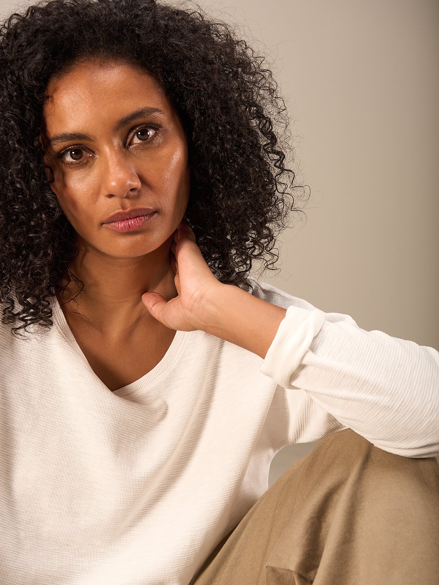Kastiges Langarmshirt mit Rundhals in hochwertigem gewirktem Waffeljersey. Stückgefärbt in pigment-dye Verfahren. 100% GOTS-zertifizierte Bio-Baumwollqualität. Stückgefärbt.