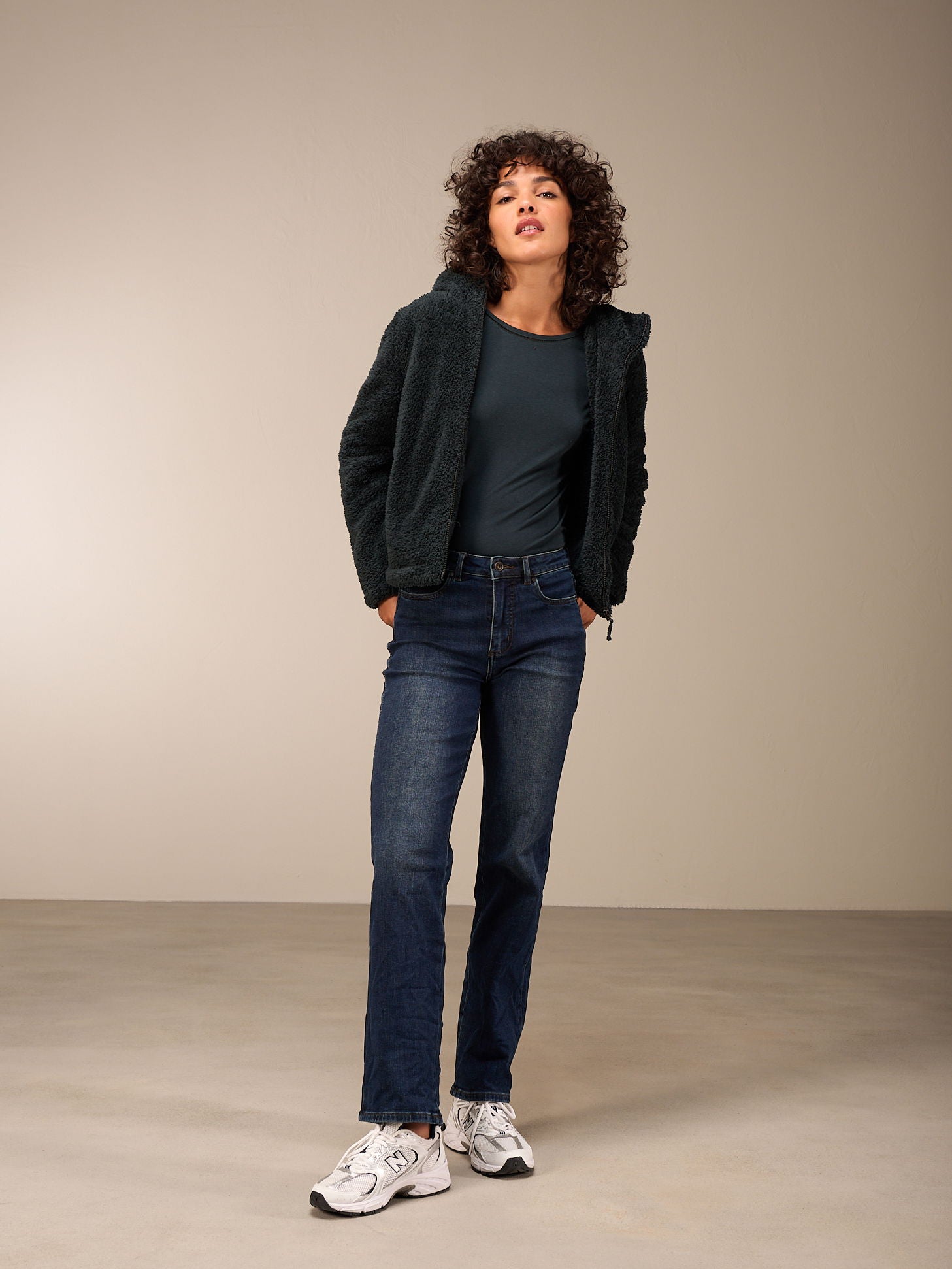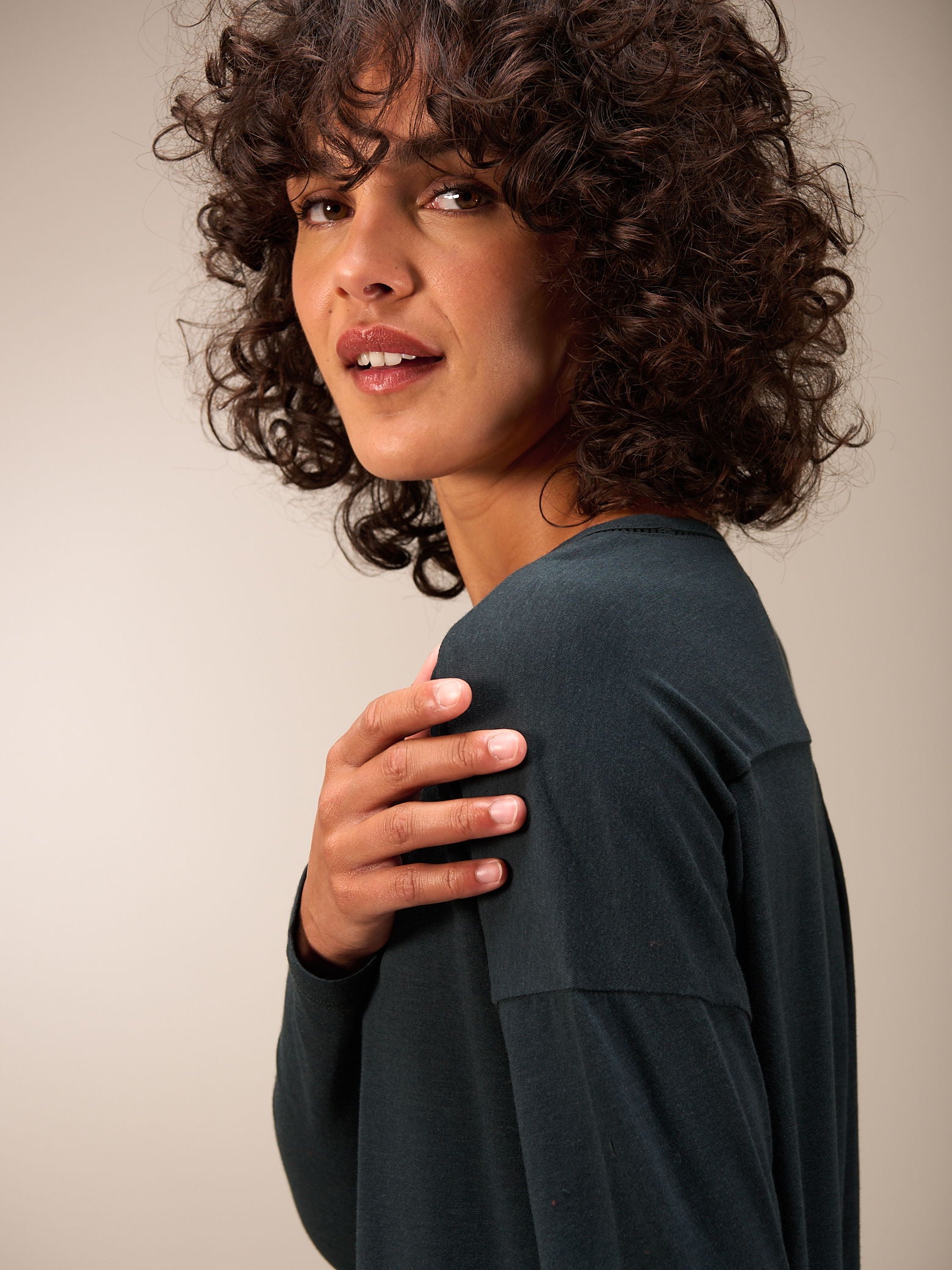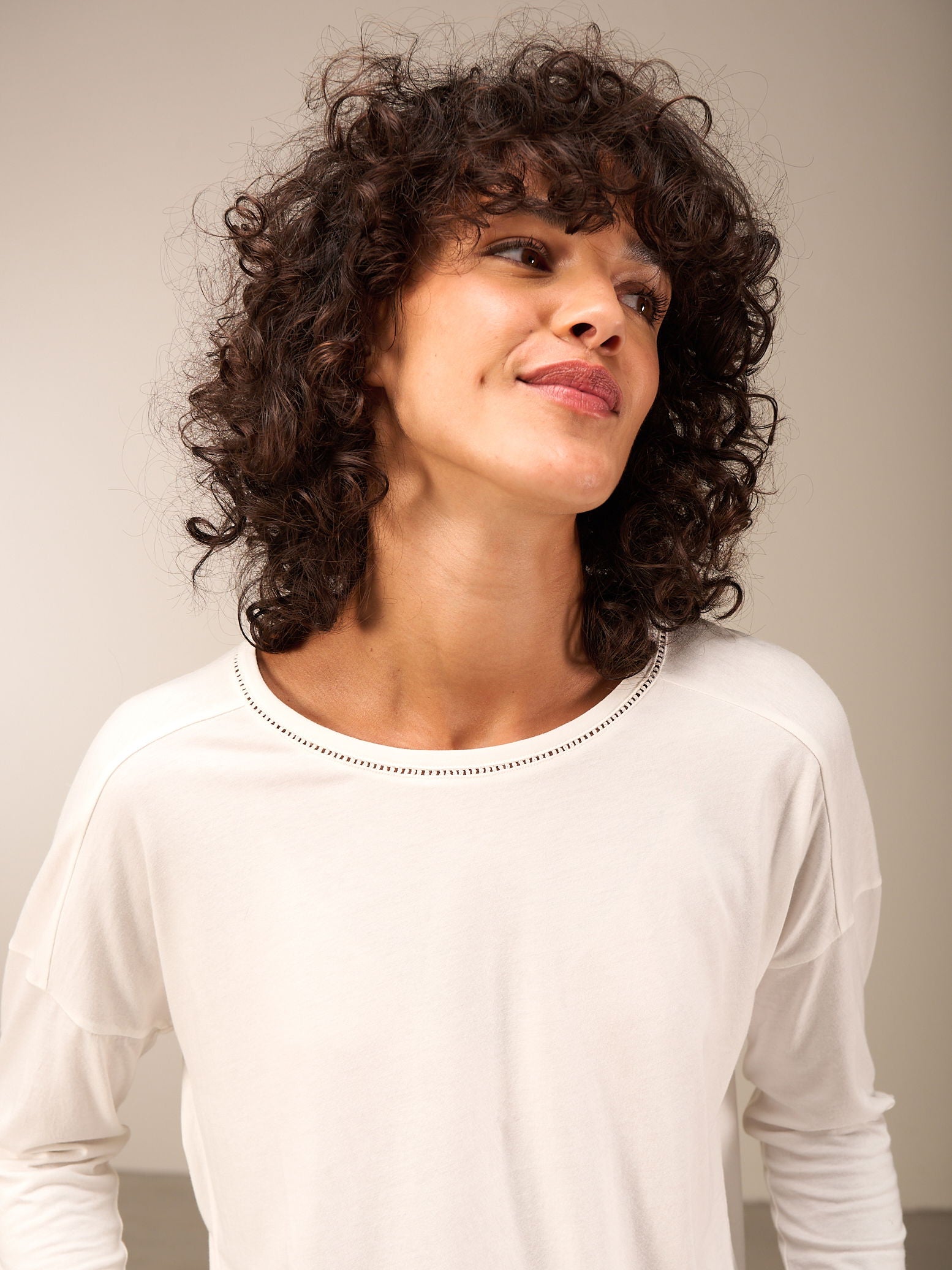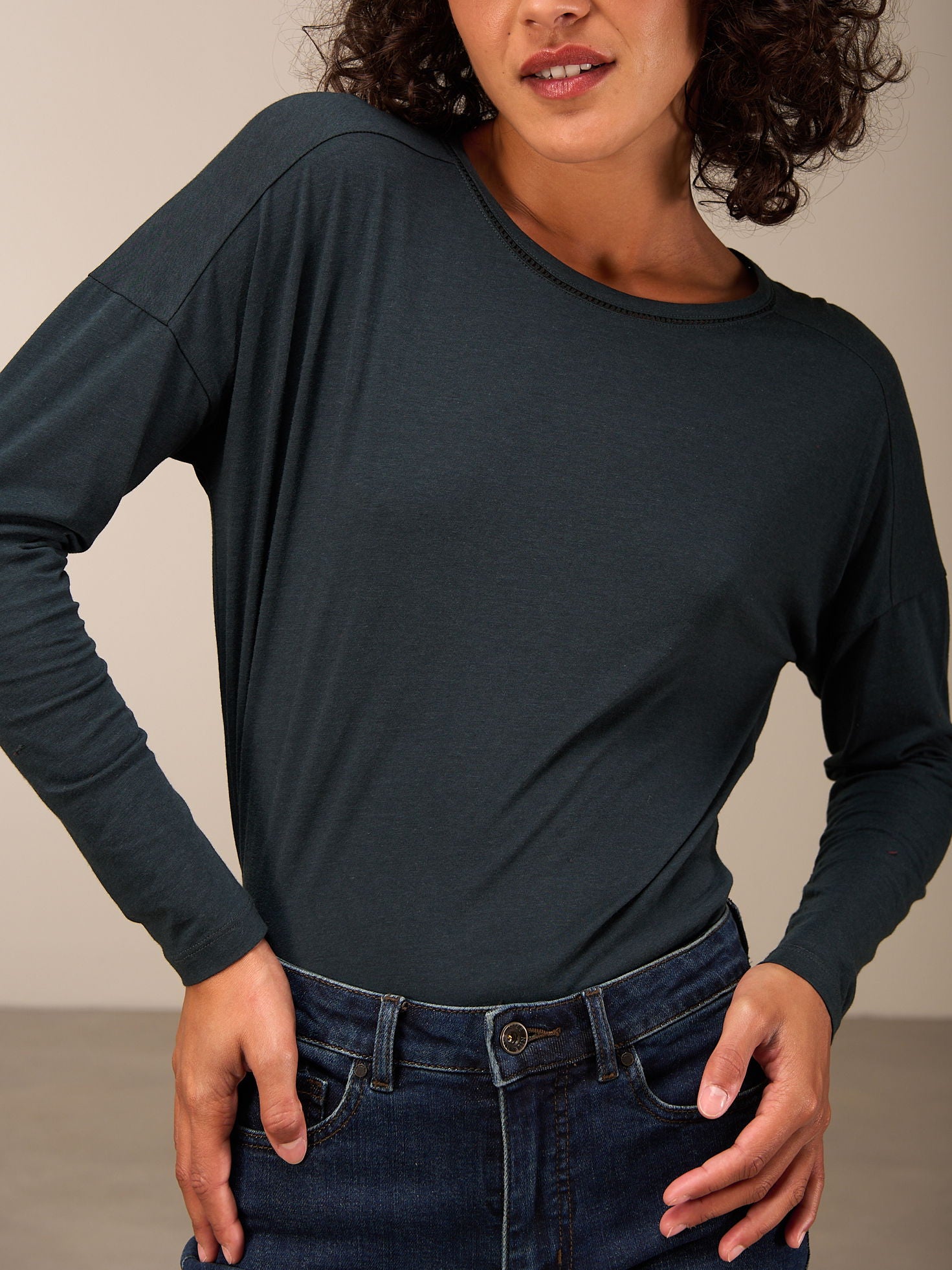 Weit geschnittenes Langarm Shirt mit Rundhalsausschnitt und überschnittenen Schultern sowie langen schmalen Ärmeln. Das leicht längere Rückteil, das durch die Falte die nötige Weite erhält, sorgt für den lässigen Look.